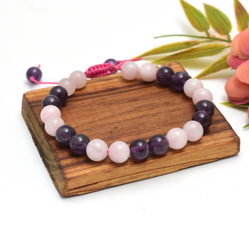 Rose Quartz & Amethyst Adjustable Bracelet, 8mm, Healing Crystal, Love, Calming Embrace Love & Tranquility with this Stunning Rose Quartz & Amethyst Bracelet Experience the powerful healing energies of Rose Quartz and Amethyst with this beautiful, handcrafted adjustable bracelet. Perfect for everyday wear, meditation, or as a thoughtful gift, this bracelet combines the gentle loving vibrations of Rose Quartz with the calming and spiritual clarity of Amethyst. Genuine Gemstones: Crafted with high-quality 8mm Rose Quartz and Amethyst beads. Adjustable Thread Design: Easily adjust the bracelet to fit any wrist size. Durable and comfortable for everyday wear. Healing Properties: Rose Quartz is known for attracting love, compassion, and emotional healing, while Amethyst promotes calmness, balance, and spiritual awareness. Handcrafted with Love: Each bracelet is carefully handmade with attention Elegant and Versatile: The beautiful combination of soft pink and deep purple complements any style, from casual to dressy. Perfect Gift: Makes a meaningful gift for birthdays, anniversaries, Valentine's Day, or any special occasion. Primary Stone: Rose Quartz Secondary Stone: Amethyst Bead Size: 8mm Bracelet Type: Adjustable Thread Bracelet Style: Beaded Material: Gemstone, Thread Gender: Unisex Closure: Adjustable Sliding Knot Benefits of Rose Quartz & Amethyst: Rose Quartz: Opens the heart chakra, promotes self-love, attracts romantic love, fosters compassion and forgiveness. Amethyst: Calms the mind, relieves stress and anxiety, enhances intuition, promotes spiritual growth.