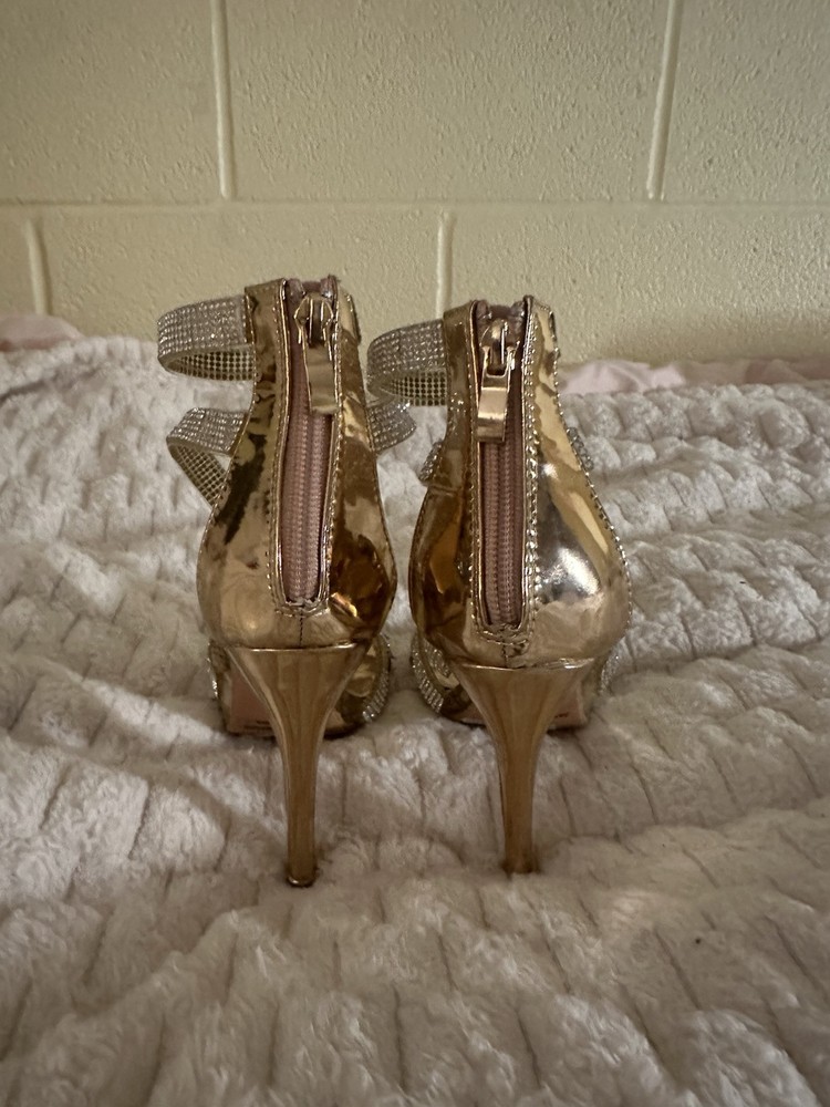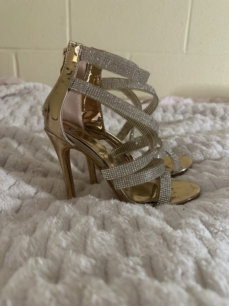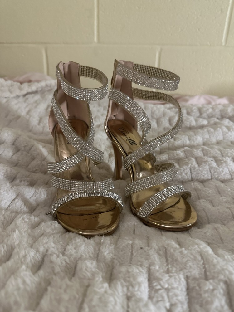 Accents:RhinestoneColor:GoldType:HeelVintage:NoHeel Height:Ultra High (4 in & Higher)Department:WomenUpper Material:SyntheticPattern:SolidStyle:StrappyFeatures:Ankle StrapCustomized:NoHeel Style:StilettoUS Shoe Size:5.5Country/Region of Manufacture:ChinaBrand:Camille La VieOccasion:Party/CocktailTheme:Metal