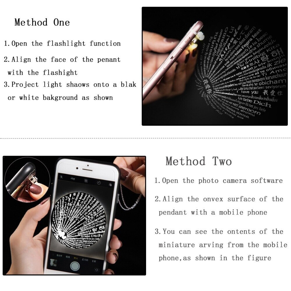 HIGH QUALITY I love you in 100 languages necklace, Check out the pictures for instructions. Approx 2cm , 18 inches chain Will come with the cute gorgeous card packaging, Necklace and the necklace card. It can fit in your palm, measuring approx 8 x10cm, you fold the the little tiny heart to open. Please Let us know the color at the checkout, Silver or Rose gold If no color is given it will be sent out random. This I love you necklace has a secret hidden message within the central stone. Shine a light through it and project it on a wall, or using your phone camera, and the words "I love you" will appear in 100 languages. SIZE - Necklace: Chain's Length: 18 inches, Pendant: 1.6 cm x 1.2 cm