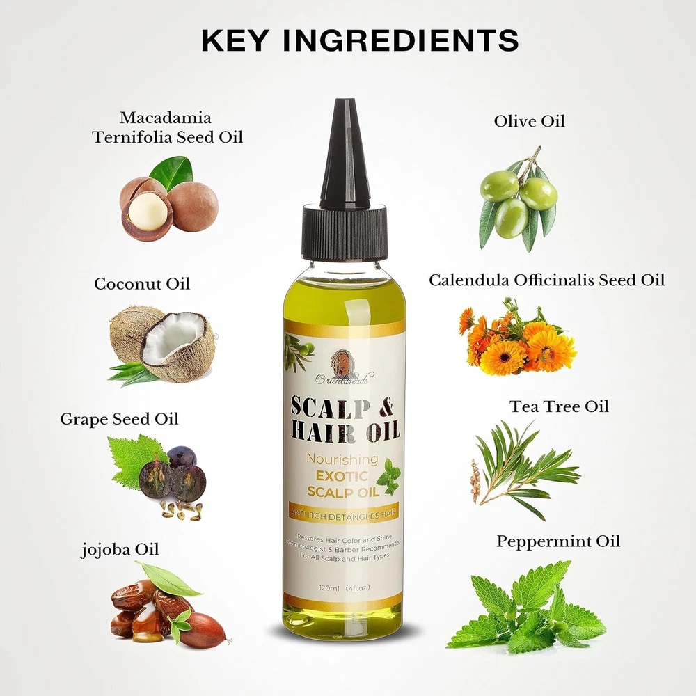 Organics Rosemary Mint Scalp & Hair Strengthening Oil w/ Biotin 4 oz /120ML (PACK OF 1) Orientdeads Rosemary Mint Scalp & Hair Strengthening Oil With Biotin & Essential Oils, Nourishing Treatment for Split Ends and Dry Scalp for All Hair Types, -4 Fluid Ounces HAIR TREATMENT OIL: Hydrates curly hair with moisture to help protect hair from breakage and split ends; Scalp feels moisturized & natural hair is stronger; Great for all hair types and styles: straight, wavy, curly, coily & protective styles FOR WEAK, BREAKAGE-PRONE HAIR: Blend Formula of Sunflower Seed, Olive, Jojoba, Coconut, Black Cumin Seed, vitamin e, Soybean and Castor Oil deeply penetrates the scalp to calm & sooth dry damaged hair that support the strength of curls as they grow SOOTHE DRY SCALP: This rich blend of over 30 essential oils and nutrients deeply penetrates the scalp to increase circulation, combat dandruff, and comfort itchy, sensitive skin while working to strengthen, lengthen, nourish, and protect hair HOW TO USE: After shampoo and conditioner, on damp or dry hair, use pointed tip applicator to apply directly to scalp; Massage gently into your scalp and hair; Do not rinse out; style and control frizz; Use daily or often for best results SAFE FOR ALL HAIR TYPES: Our versatile Rosemary Mint Scalp & Hair Strengthening Oil promotes radiant hair for all hair types and deeply nourishes types 3A to 4C, chemically-treated hair, braids, weaves, and both low and high porosity level hair Note: This Product is designed to deliver optimal results, offering high-quality performance and satisfaction. Please note that individual experiences and outcomes may vary based on personal use, preferences, and unique circumstances. For best results, we recommend following the provided guidelines and ensuring the product is used as intended. Product result may vary for every individual.