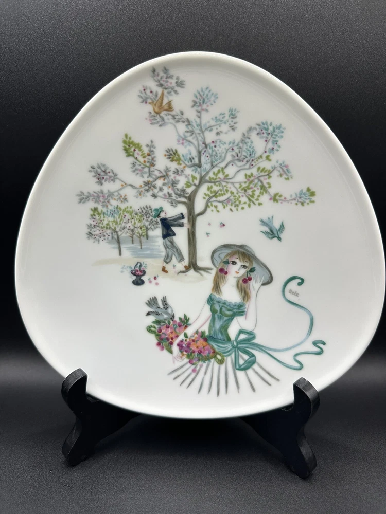 Time Period Manufactured: 1960-1969 Production Technique: N/A Product Line: Bele Bachem Year Manufactured: 1960 Country/Region of Manufacture: Germany Theme: romance Production Style: N/A Material: Porcelain Backstamp: Printed Original/Licensed Reproduction: Original Color: Multicolor Style: Mid-Century Modern MPN: 2130 Vintage: Yes Shape: Triangle Pattern: Unknown Set Includes: Plate Occasion: All Occasions Era: Mid 20th Century (1941-1969) Plate Diameter: 7 3/4” Type: Plate Origin: Rosenthal Brand: Rosenthal Handmade: No Number of Items in Set: 1 Antique: No