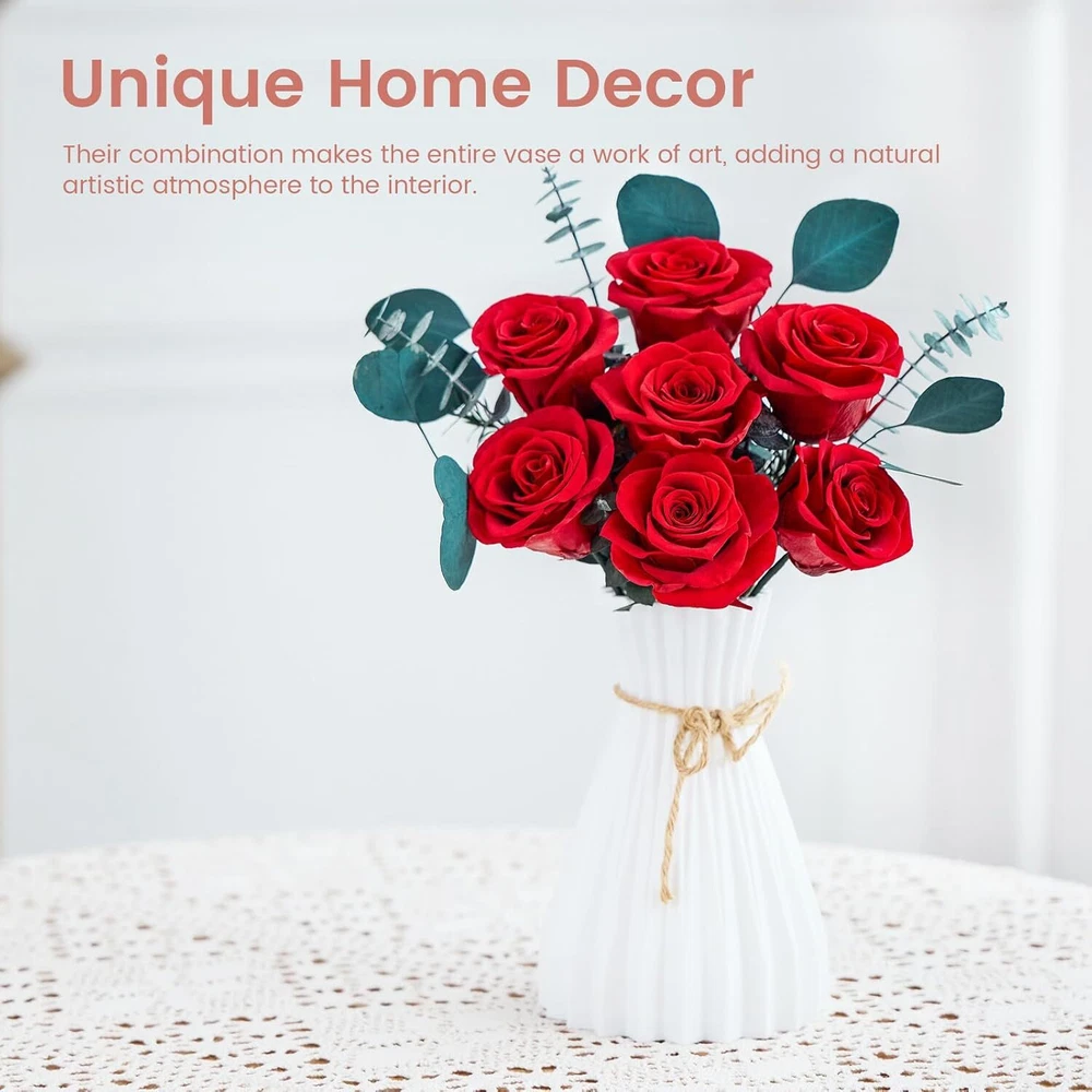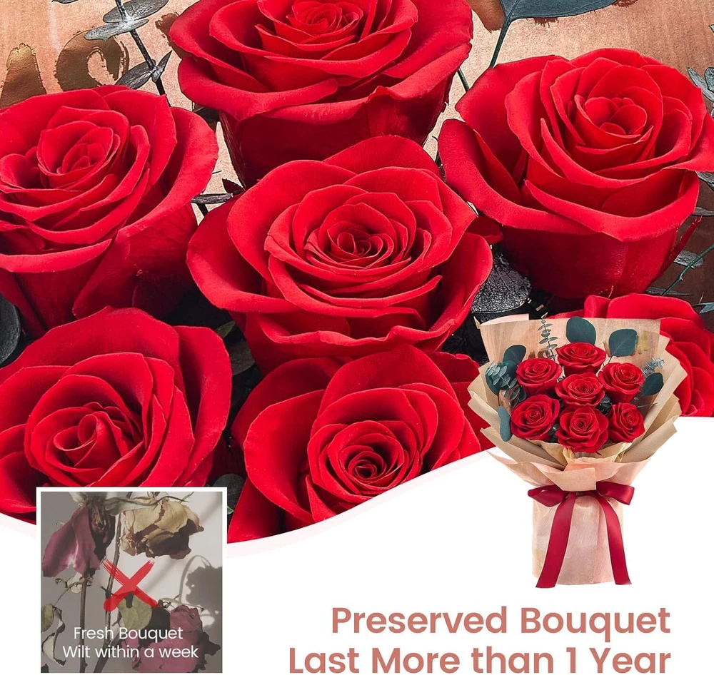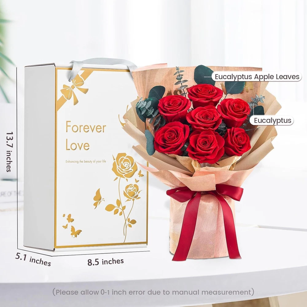 Roses Bouquet 7-Piece Forever Flowers Bouquet Flowers Fresh Bouquet Gift for Women Wife Valentines Day Mothers Day Christmas Anniversary Birthday Graduation (Red Roses) Product Details Product Dimensions: 8.5 x 5 x 13.5 inches Item Weight: 1.23 pounds Manufacturer: Mosstory Item model number: Redhs Batteries required: No 100% Real Roses: The 7 piece preserved roses bouquet have long lasting beauty that will sustain their shape and color for over a year. The flower preservation process has been perfected so the preserved roses will look as natural roses as fresh as the day they were picked. Pick a bouquet for her to show your feelings Handmade Bouquets: The beautiful forever bouquets are designed and handmade by skilled florists, which is elegant and charming. They are handcrafted from real Roses, hydrangea, and eucalyptus apple leaves,etc Romantic Gifts for Women: The flowers bouquet is a unique and romantic gift to impress others in any occasions, such as Valentines Day, Anniversary, Birthday, Mothers Day, Thanksgiving Day, Christmas Day, Weddings and Graduation Exquisite Packaging: Packaged in our carefully designed gift box, no need to repackage. The roses bouquets are secured in the box to ensure the bouquets are not damaged during transportation No Maintanenc:No water or sunlight needed for this rose bouquet. Our rose bouquets not only last for more than a year, but they don't require any work or maintenance from you, you just need to store them in a normal environment (avoid humidity and direct sunlight)