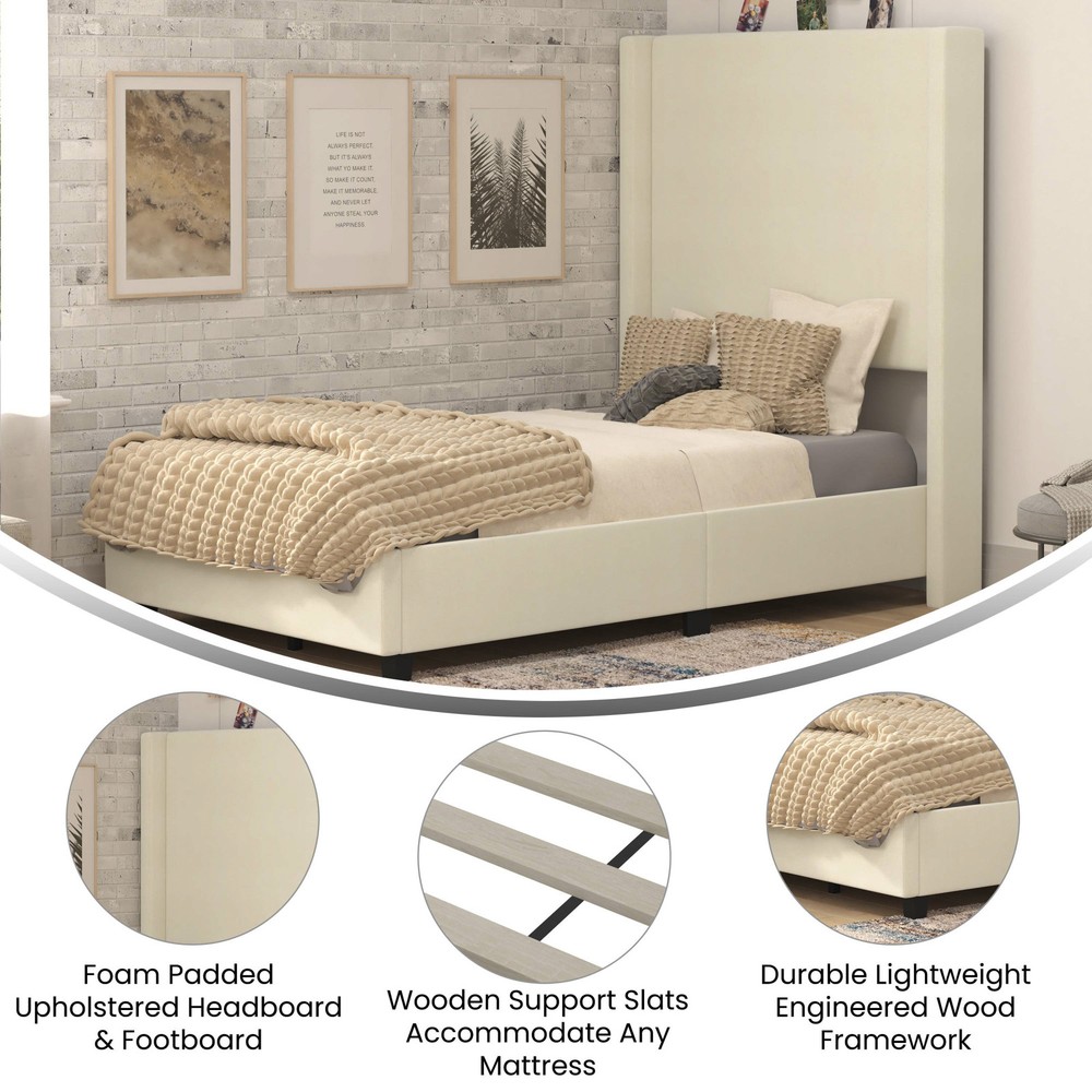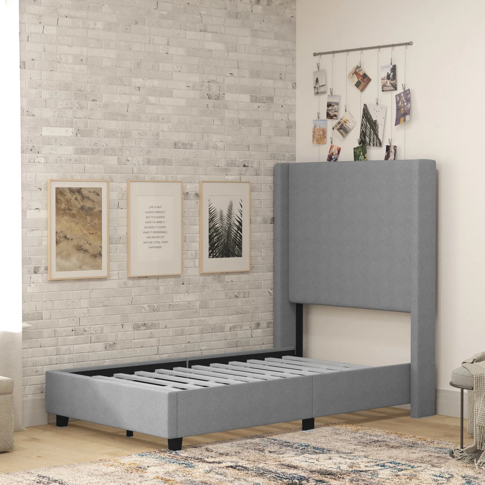 1. This Roseto twin platform bed is a stylish and sturdy choice! The beige faux linen upholstery gives it a modern, elegant look, while the engineered wood frame holds up to 850 lbs—perfect for durability. The padded headboard adds comfort, and the wooden slats provide great mattress support. Easy to assemble and lightweight, it’s a fantastic upgrade for any bedroom. Love the wingback design—feels luxurious without the high price tag!