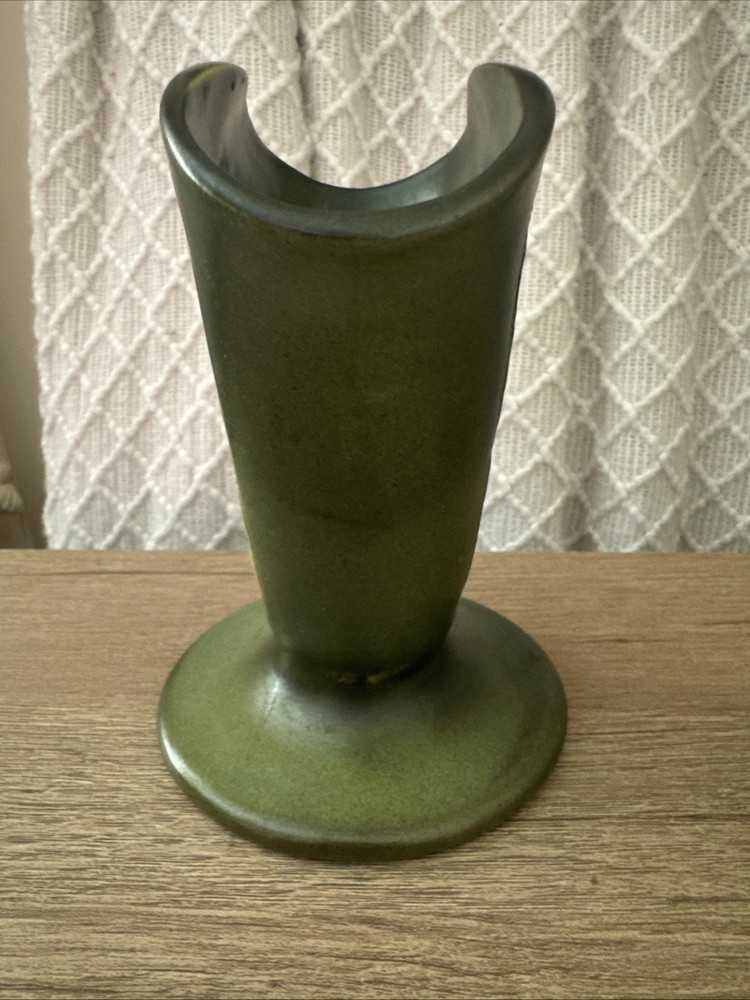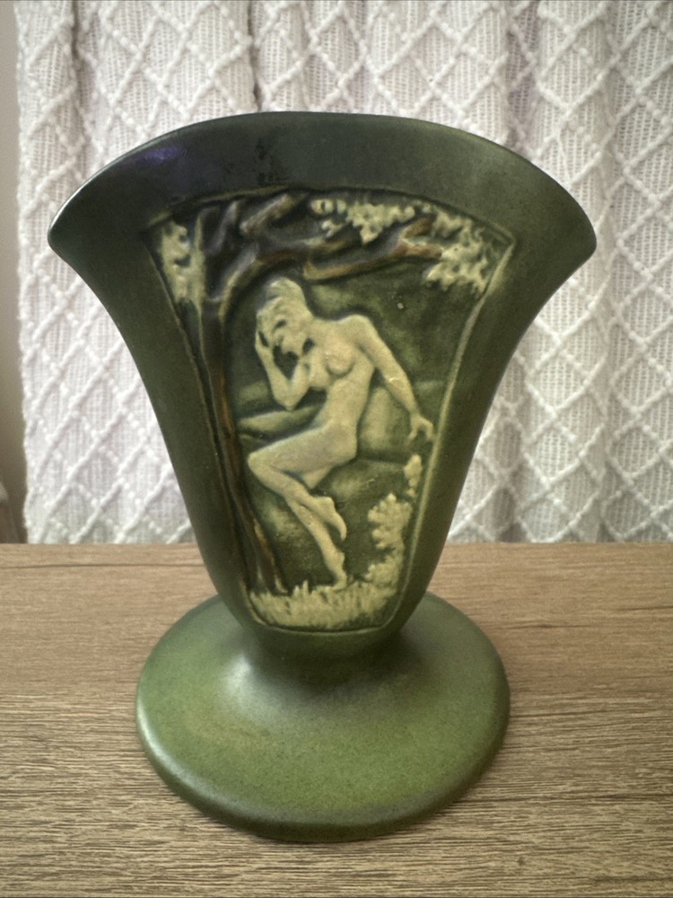 The Roseville RoseCraft Nude Silhouette High Relief Green Fan Vase, C. 1926 is an antique vintage handmade pottery vase originating from North America. This Arts & Crafts/Mission style vase features a multi-color design with a low luster finish, crafted from clay using pottery production techniques. Measuring 6 inches in height, this original Roseville product showcases a unique silhouette pattern inspired by the theme of women, fitting within the early 20th-century era. The RoseCraft vase is a rare find, reflecting the craftsmanship and style of the time period. No damage, no repairs. Original little ‘R’ stamp on bottom.