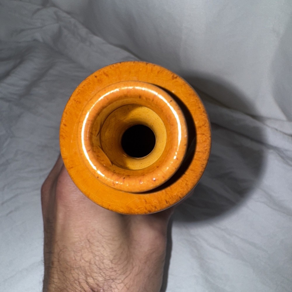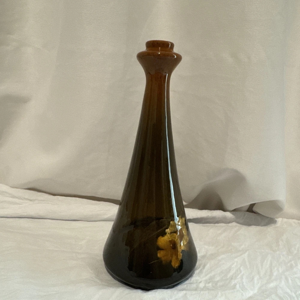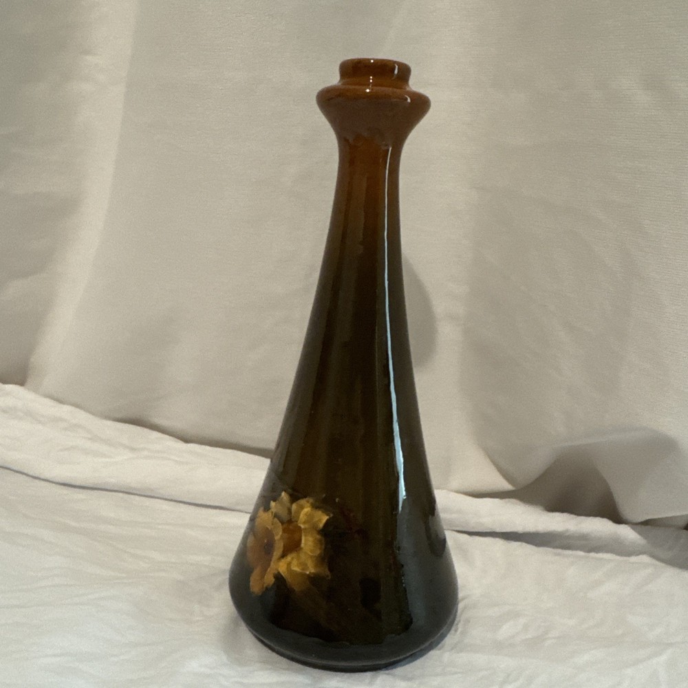 The Roseville-Rozane Royal #983-8” Daffodil Bud Vase is a vintage piece of Arts & Crafts/Mission style pottery hand-painted with a floral daffodil pattern in a glossy finish. Signed by Gussie Gerwich, this original piece from 1900 is a unique piece of North American art pottery, showcasing a vibrant burnt umber fade to dark earth color palette. Made of clay in the United States, this vase is a beautiful example of Late Victorian-era craftsmanship, perfect for collectors of vintage pottery and floral-themed decor. No damage, no repairs. Small crazing under flash. Can’t see with the naked eye.