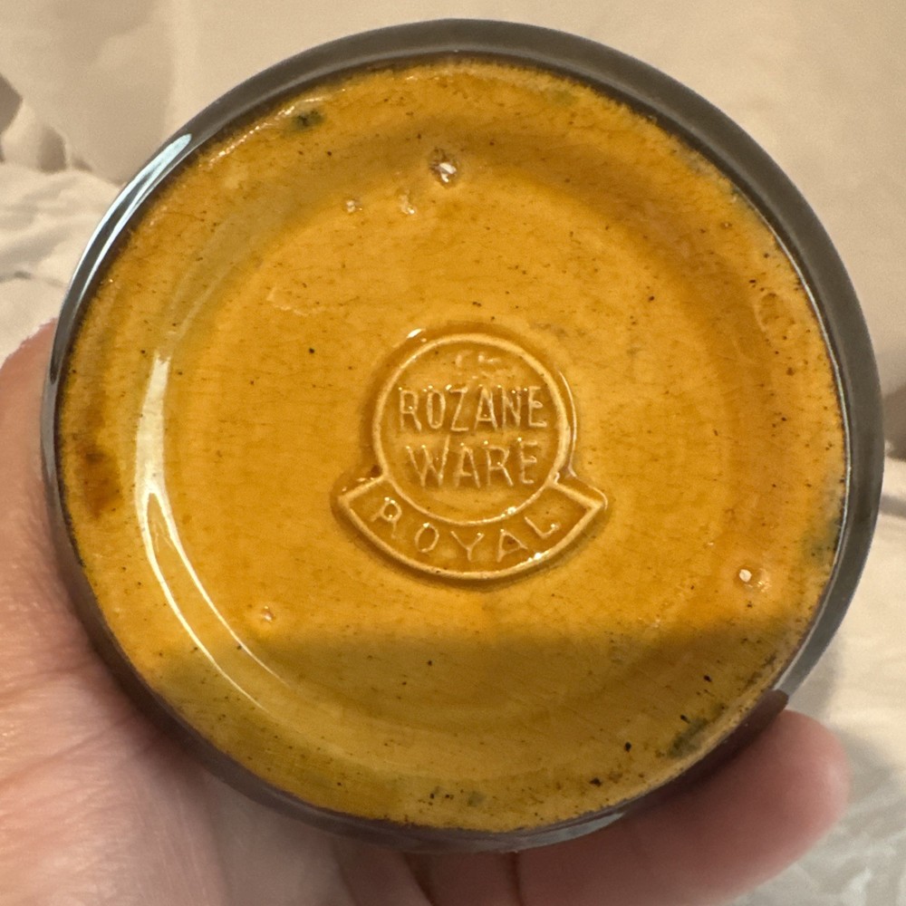 Roseville Rozane Royal Dark #888, 4.5” Ball Jug Vase. Signed Lilly Mitchell ‘LM’