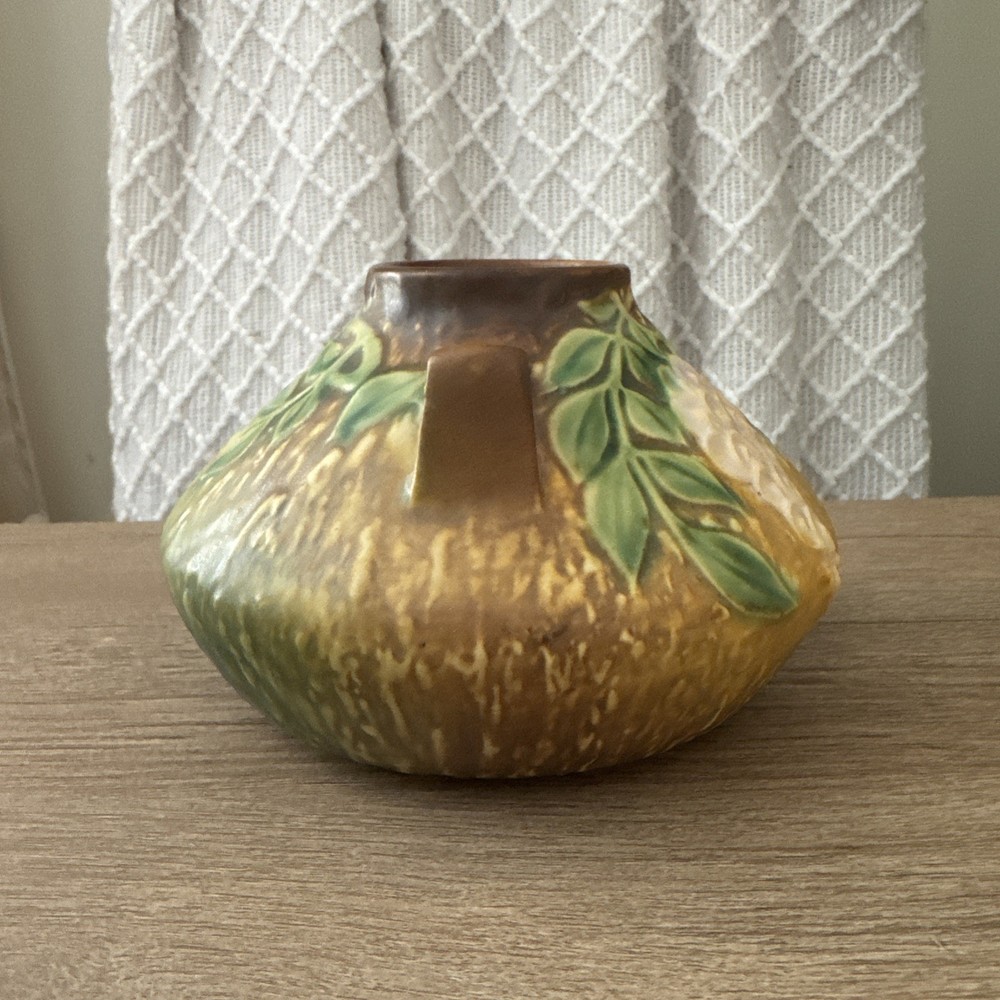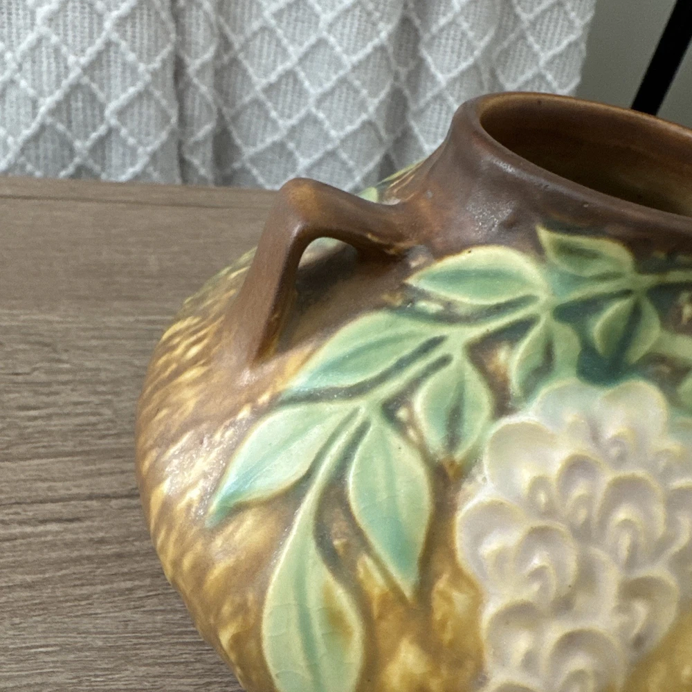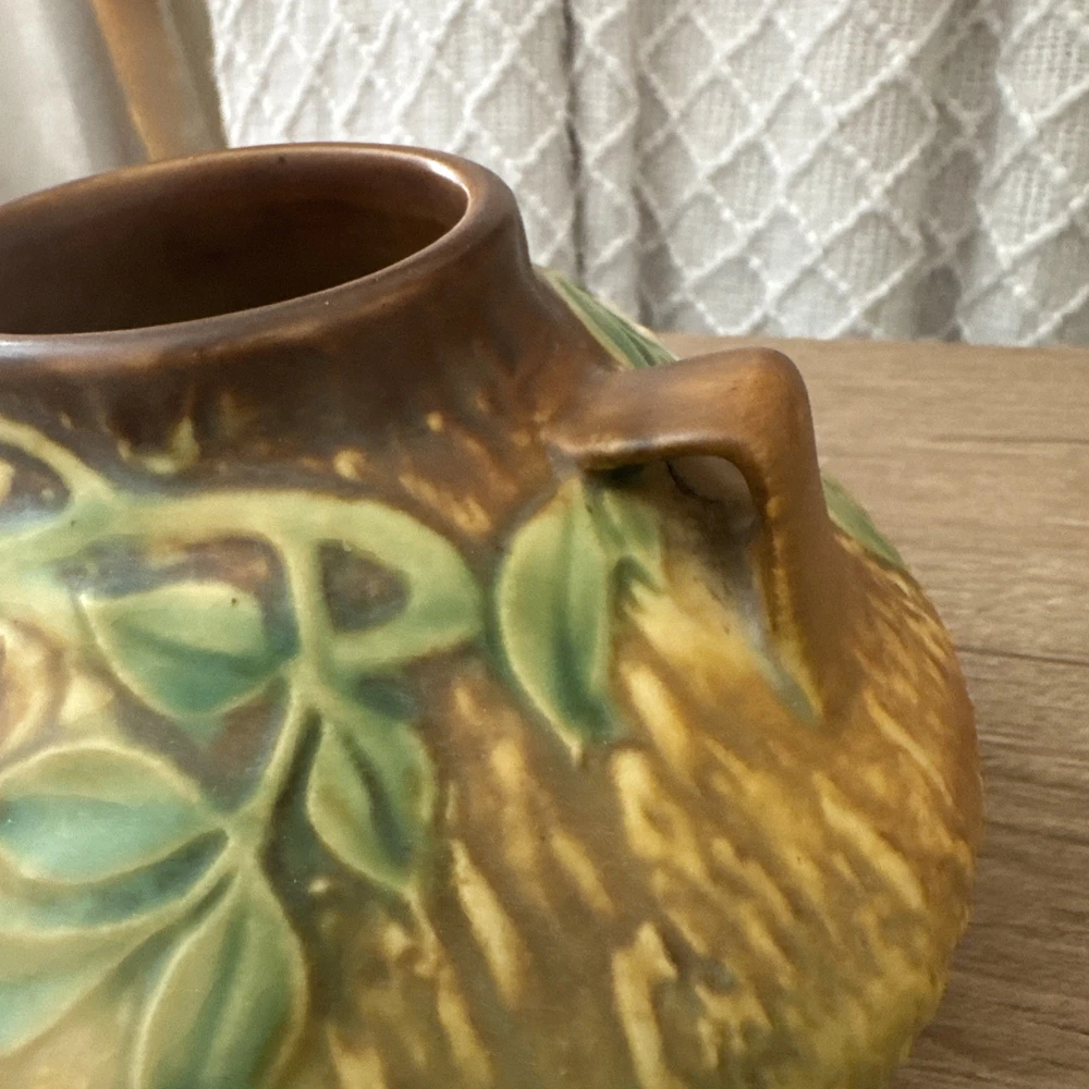 The Roseville Wisteria #629 4' Squat Vase is a vintage piece from 1933, originating from Ohio North America. Made of clay, this inkwell-style vase features a floral pattern in soft brown, tan, and green colors with a touch of soft lavender. With an arts and crafts/mission style, this decorative item stands at 4 inches tall and is part of the Wisteria product line by Roseville. Handmade with a low luster finish, this antique vase showcases the intricate design and craftsmanship of the early 20th century. No damage, no repairs, no flaking or crazing.