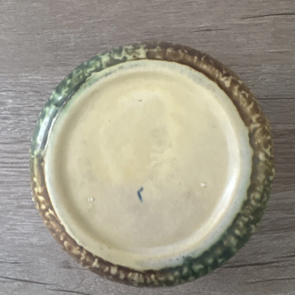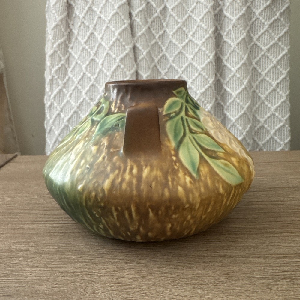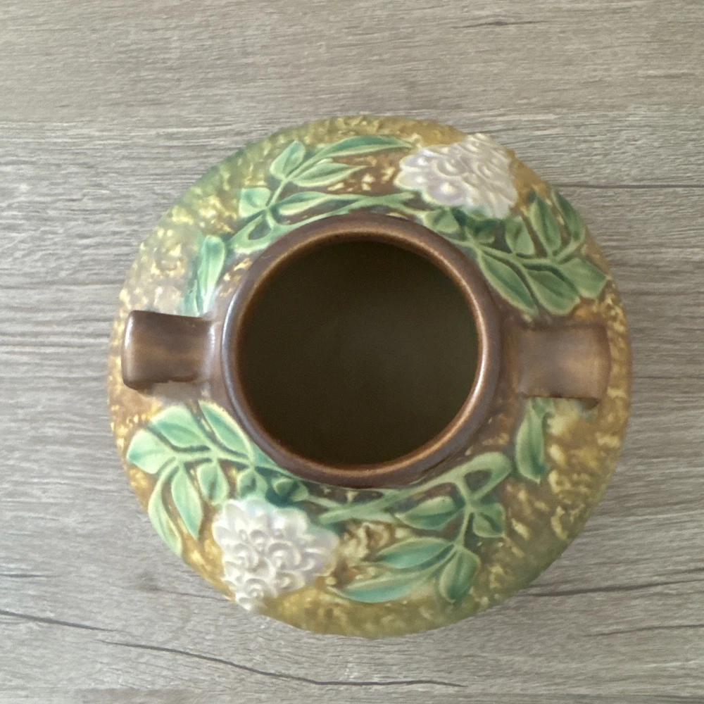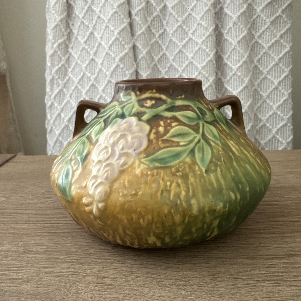 The Roseville Wisteria #629 4' Squat Vase is a vintage piece from 1933, originating from Ohio North America. Made of clay, this inkwell-style vase features a floral pattern in soft brown, tan, and green colors with a touch of soft lavender. With an arts and crafts/mission style, this decorative item stands at 4 inches tall and is part of the Wisteria product line by Roseville. Handmade with a low luster finish, this antique vase showcases the intricate design and craftsmanship of the early 20th century. No damage, no repairs, no flaking or crazing.