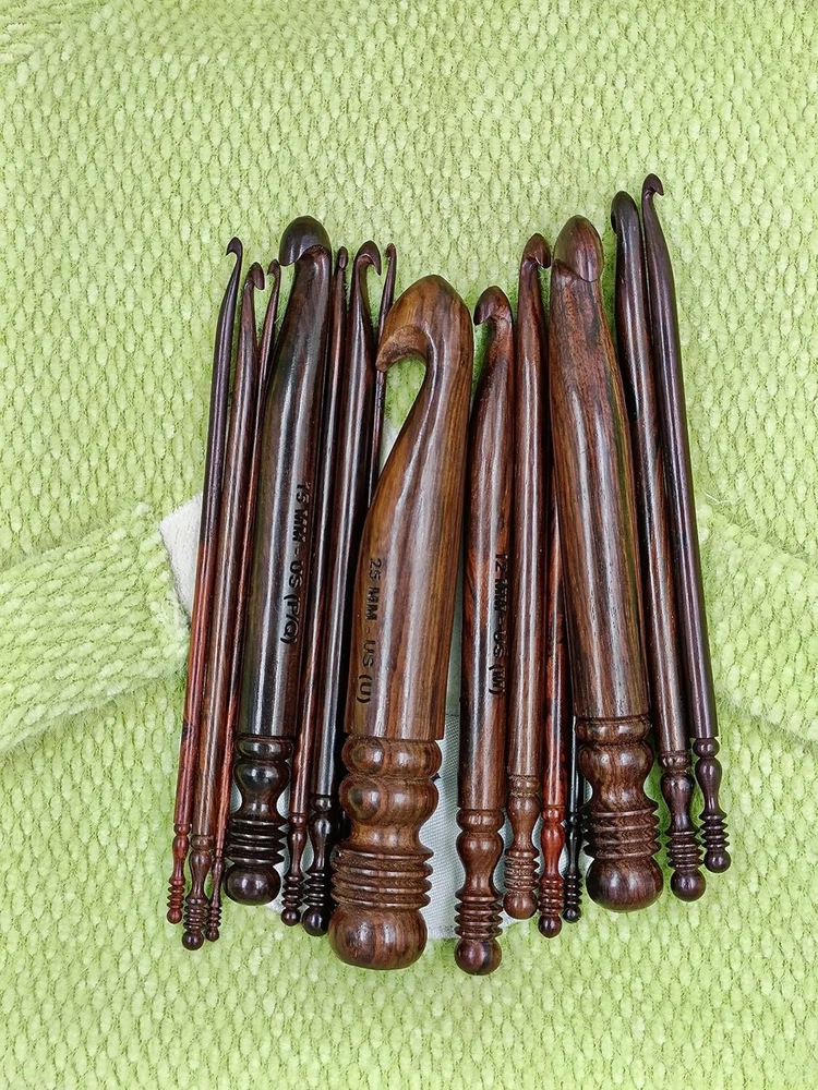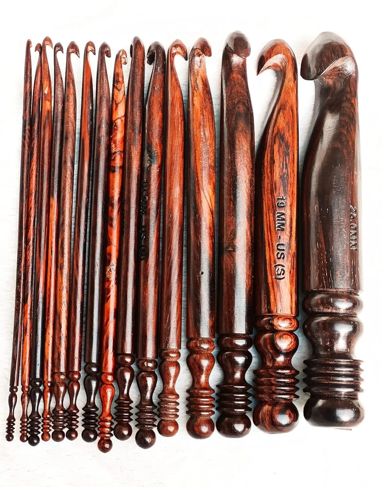 Enhance your crocheting experience with this set of 15 rosewood ergonomic crochet hooks. The soft grip handles provide comfort and reduce strain on your hands, allowing you to crochet for longer periods of time. These hooks are available in sizes ranging from 3.5 MM to 25 MM, ensuring you have the perfect size for any project. Crafted in India, these hooks are made from high-quality rosewood and are built to last. Whether you're a beginner or an experienced crocheter, this set is perfect for you. Ideal for a variety of crocheting projects, these hooks are a must-have for any needlecraft enthusiast.