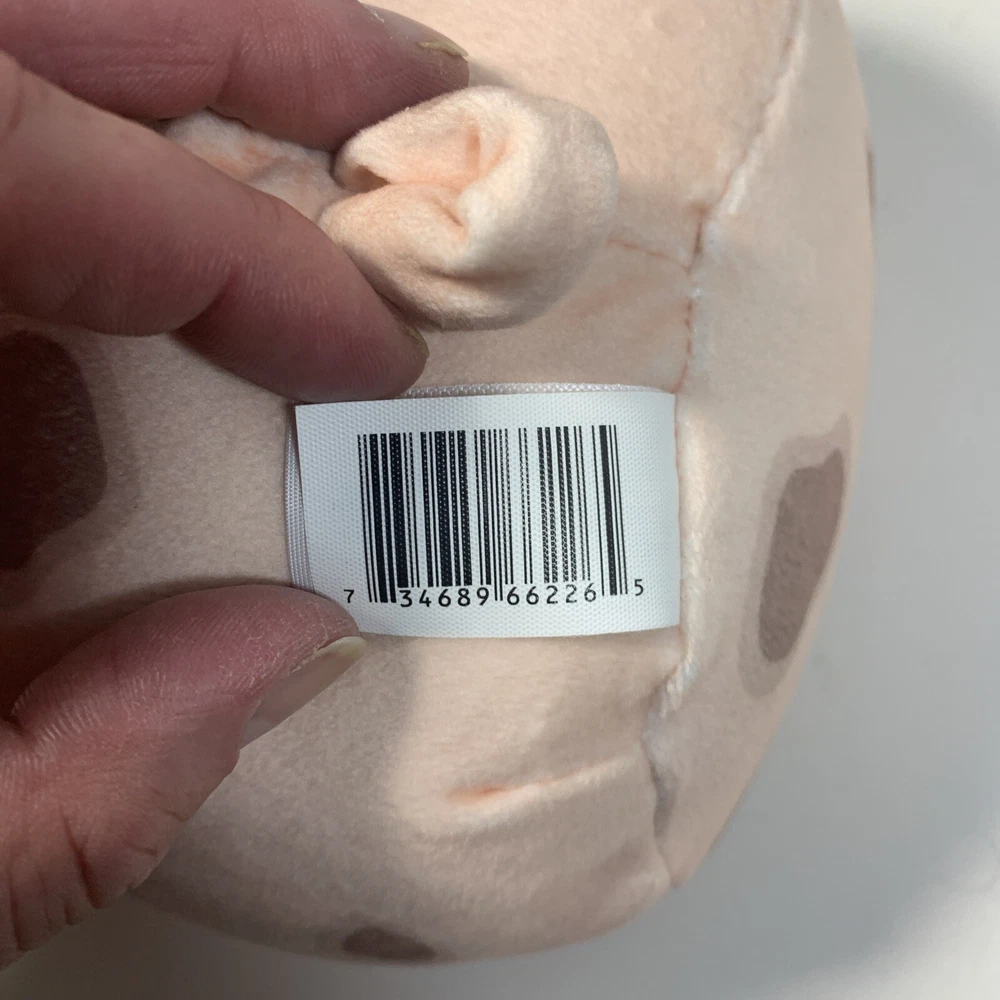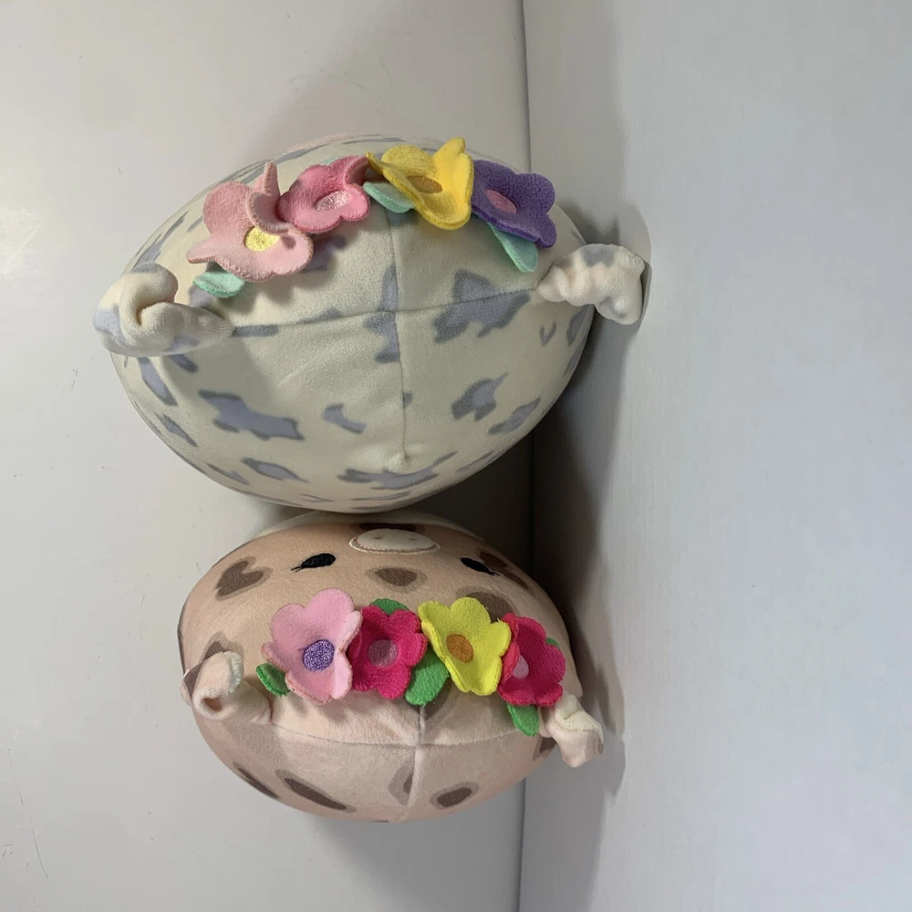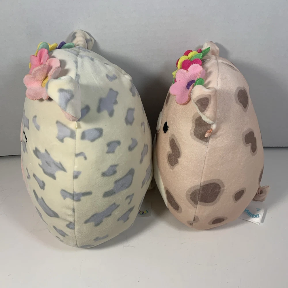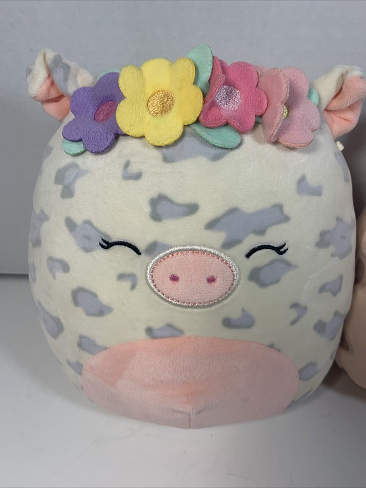 Rosie & Aquitaine Squishmallow Spotted Pigs w/flower crowns plush set, Kellytoy Rosie, 2023 approximate dimensions: 8" tall 8" wide 6" thick Aquitaine, 2021 approximate dimensions: 7.5" tall 7" wide 5" thick