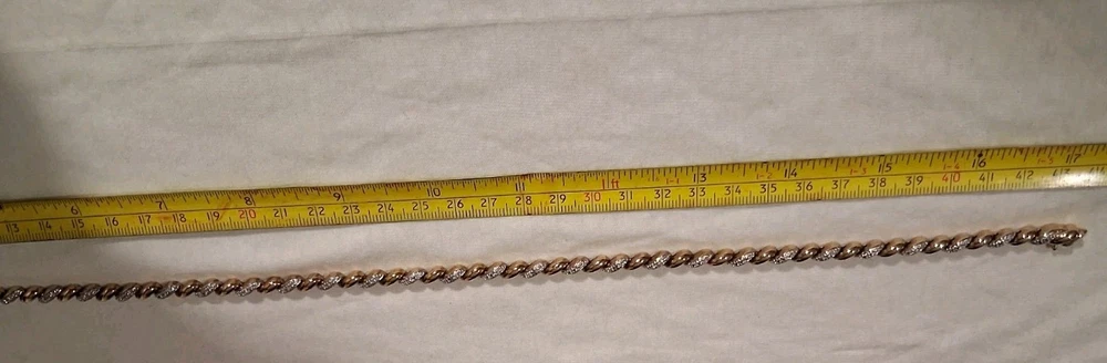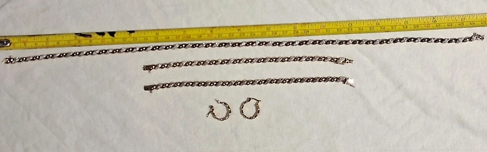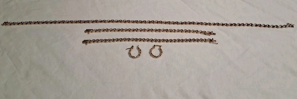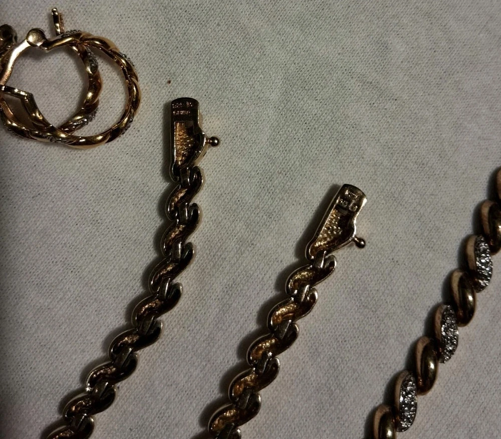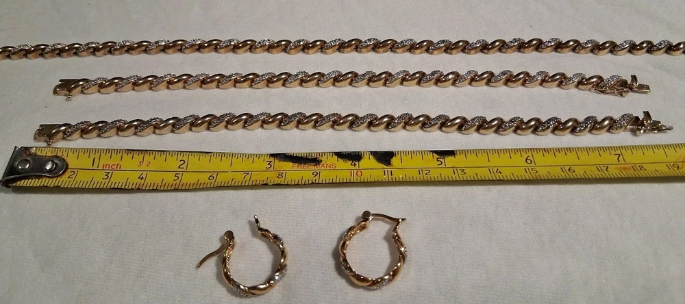 This Ross Simmons 925 Tennis Style Necklace, Bracelet, and Earrings set is a stunning vintage piece crafted with 18K yellow gold overlay over a 925 sterling silver Base. The set features diamond chips as the main stone. The jewelry set includes a Necklace that is 17.5 inches in length, (2) identical bracelets that are 7.5 inches in Length, Also Included is A Pair Of Matching Earrings. The Total Carat Weight of the Entire set is 29.5 Grams.