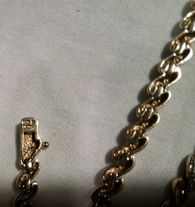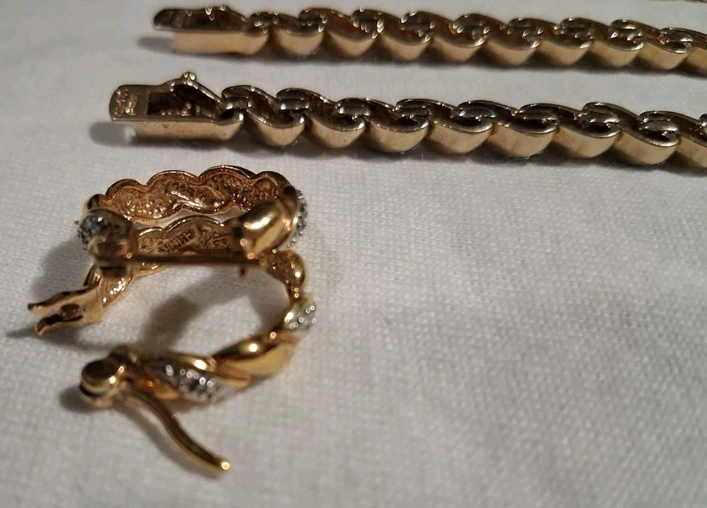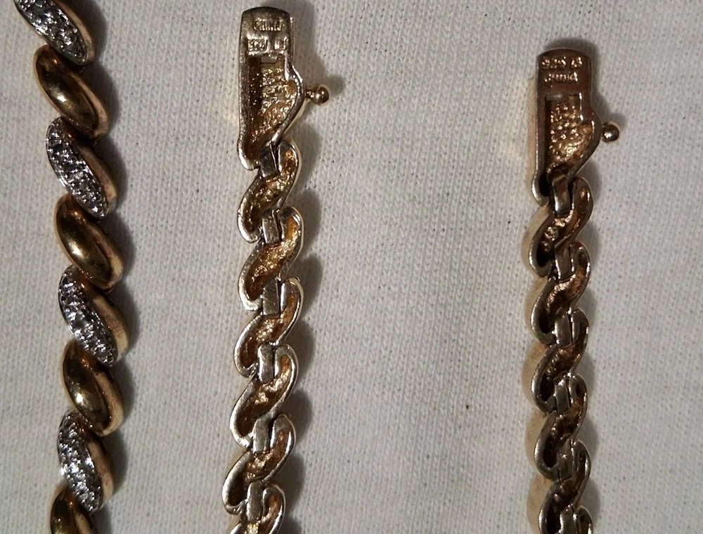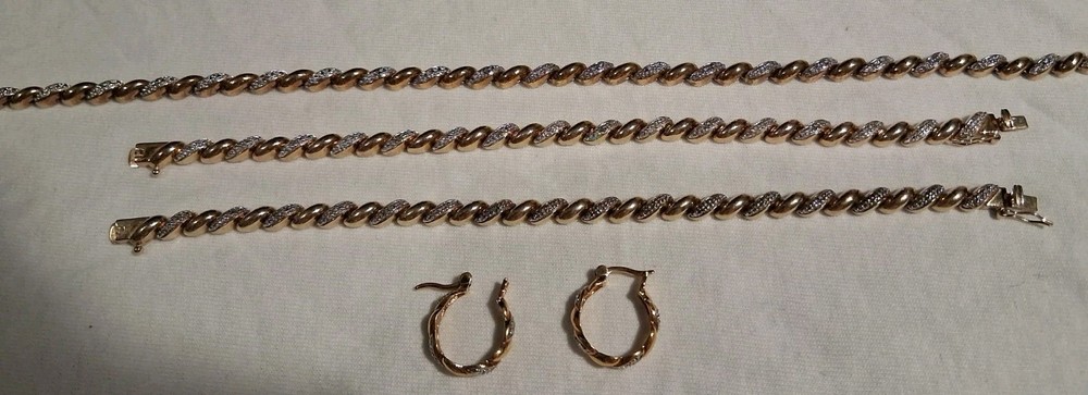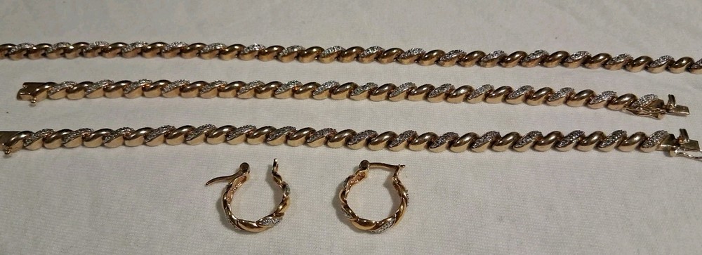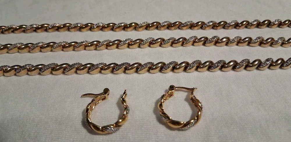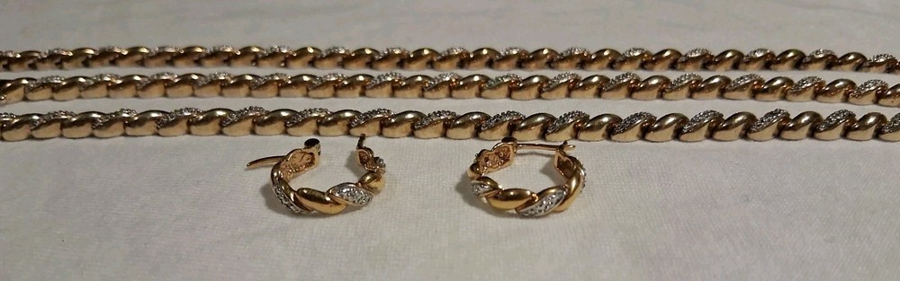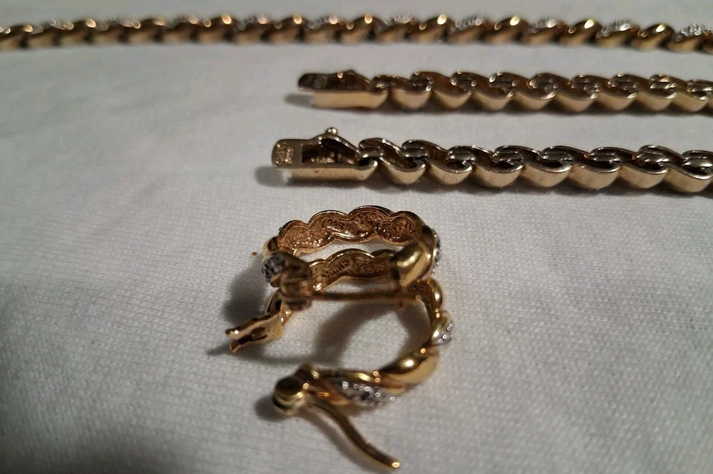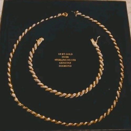 Gemstone Clarity Grade: Does Not Apply Ring Size: None Antique: No Type: Jewelry Set Signed: Yes Wholesale: Yes Metal Purity: .925 Sterling Silver Brand: Ross Simmons Occasion: Anniversary, Birthday, Christmas, Confirmation/Communion, Engagement, Graduation, Mother's Day, Valentine's Day, Wedding Country/Region of Manufacture: China Total Carat Weight: 1 Ounce 1.5 Grams - 29.5 Grams Number of Gemstones: zero Metal: 925 Sterling Silver Base / 18K Yellow Gold Overlay Vintage: Yes Features: Nickel-Free Theme: Anime, Art, Awareness, Beach, Beauty, Birds, Bohemian, Cartoon, TV & Movie Characters, Ethnic, Fairytale & Fantasy, Family & Friends, Fashion & Costumes, Gambling/Casino, Gothic, Halloween, Healing, Hip Hop, Love, Luck, Memorial, Music & Dance, Religious, Retro, Sports, Travel & Places, TV & Movies, Vacation, Western Secondary Stone: none Colored Diamond Intensity: Fancy Vivid Material: 925 Sterling Silver Handmade: Yes Certification: AGI Model: Ross Simmons - Tennis Syle Main Stone Creation: Natural Collection: Ross Simmons Base Metal: Fine Silver Main Stone Treatment: Not Enhanced Number of Diamonds: Chips Diamond Color Grade: D Main Stone: Diamond chips Cut Grade: Excellent Era: 1980's - 1990's Seller Warranty: No Main Stone Color: White/Colorless Country of Origin: China Color: Yellow Gold Set Includes: Earrings, Necklace, Bracelets Main Stone Shape: Chip Diamond Clarity Grade: Very Slightly Included (VS1)