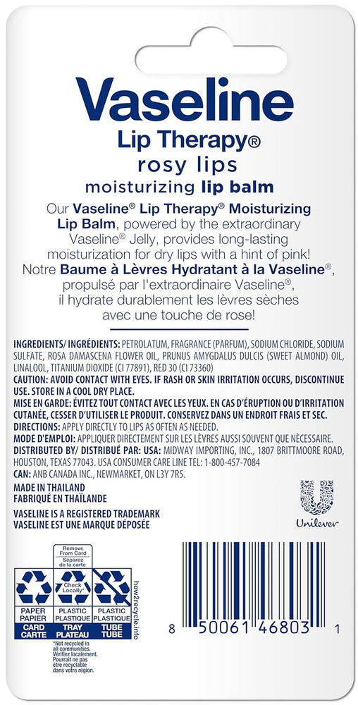 Soothes and Hydrates: Vaseline Lip Therapy Rosy moisturizing lip balm with a sheer pink tint, gives you long-lasting moisturization with a light, rosy fragrance. Convenient Format: comes in a convenient lip balm tube, easy to carry wherever you go. Made with Vaseline Jelly: helps repair dry, chapped lips and relieves discomfort by locking in moisture. Give your lips long lasting moisturization with Vaseline® Lip Therapy® Rosy lip balm. With the soothing power of Vaseline® Jelly it helps repair dry, chapped lips and relieves discomfort by locking in moisture. It soothes and softens lips, providing a light pink tint with a subtle rosy fragrance.