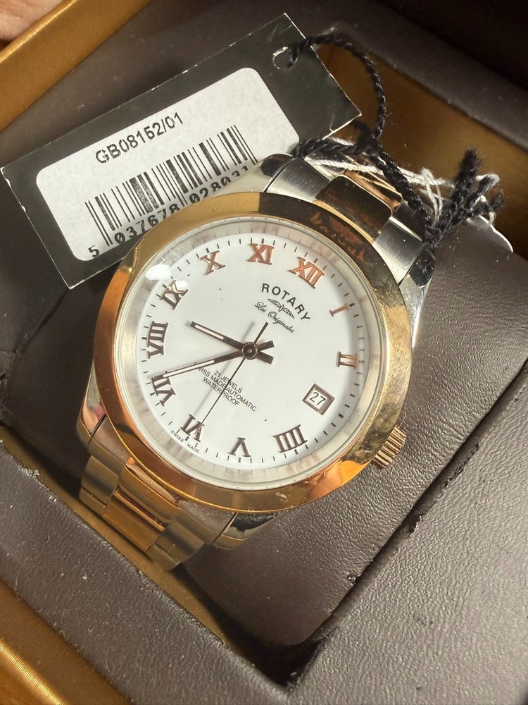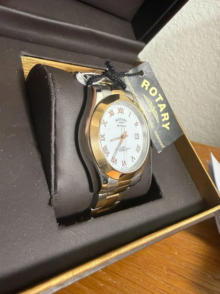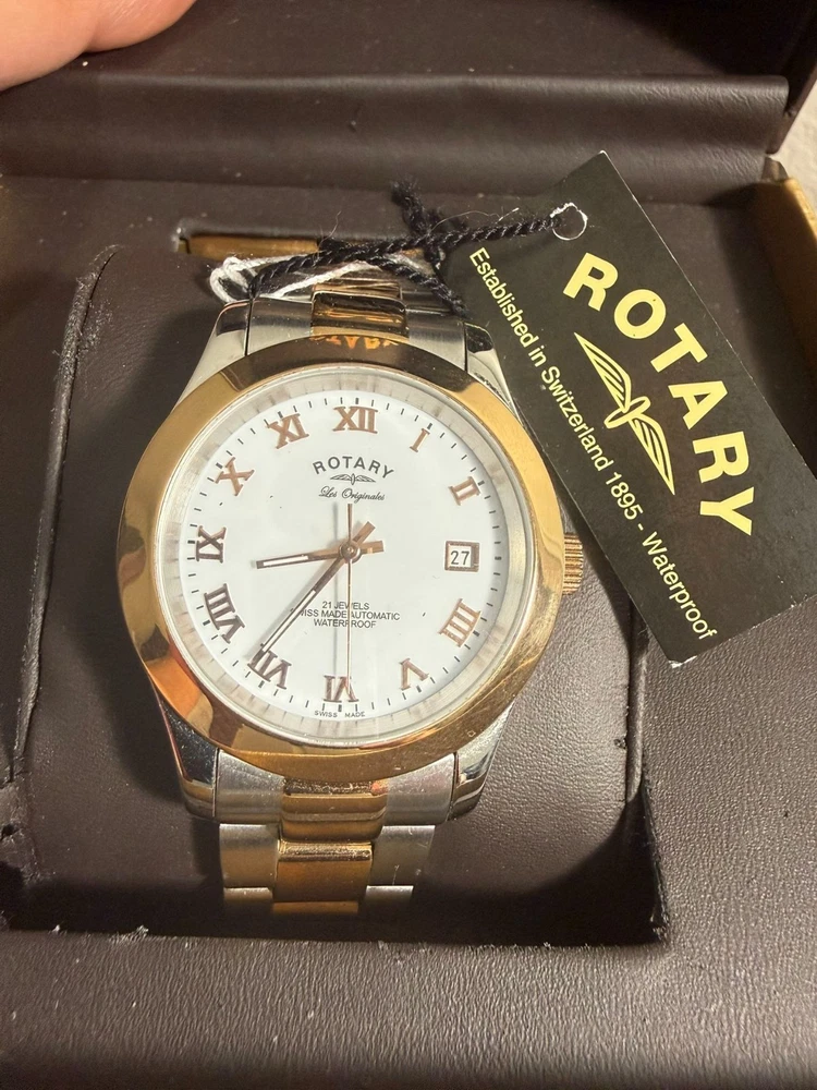 Rotary Men’s Watch Swiss Made Automatic 21 Jewels Movement Collection: Les Originales Model Number: GB08152/01 Working Two Tones Watch Case Two Tones Watch Bracelet Original Rotary Box Please Check All Pictures For A Better Description RETURNS NOT ACCEPTED