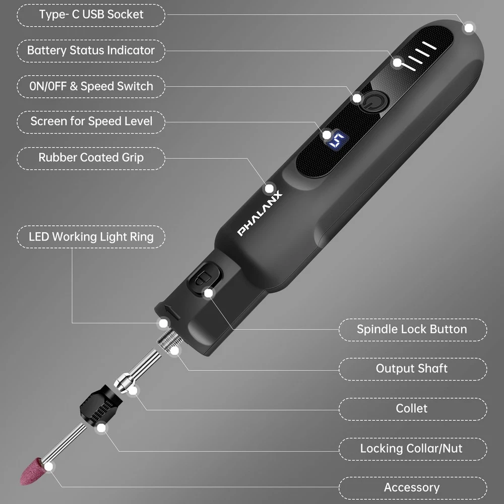 ๐๐จ๐ฐ๐๐ซ๐๐ฎ๐ฅ ๐๐จ๐ญ๐จ๐ซ & ๐๐จ๐ฐ ๐๐จ๐ฐ๐๐ซ ๐๐จ๐ง๐ฌ๐ฎ๐ฆ๐ฉ๐ญ๐ข๐จ๐ง: PHALANX rotary tool uses an enhanced strong motor, the output is more powerful than the traditional motor, with maximum speed as high as 20000RPM. While effectively controlling vibration and noise to provide stable output. The engraving tool is ideal for polishing and sanding pet nails, Light DIY Projects, and Wood Sanding. (Please fully charge the rotary tool cordless before the first use) ๐-๐๐ฉ๐๐๐ ๐๐๐ญ๐ญ๐ข๐ง๐ ๐ฌ & ๐๐๐ ๐๐ข๐ง๐ ๐๐จ๐ซ๐ค ๐๐ข๐ ๐ก๐ญ: PHALANX mini rotary tool has 5-speed variable speed adjustment from 5,000 to 20,000 RPM, can meet the gears and speeds required for different light load projects. The power rotary tool is equipped with 4 high-brightness LED work lights around the rotating drill bit, illuminating the entire work area in low-light environments, reducing backlight shadows, ensuring work accuracy. For example, polishing pet nails or resin objects. ๐๐ง๐ญ๐๐ฅ๐ฅ๐ข๐ ๐๐ง๐ญ ๐๐๐ฆ๐จ๐ซ๐ฒ & ๐๐จ๐ฆ๐ฉ๐๐๐ญ ๐๐ข๐ ๐ก๐ญ๐ฐ๐๐ข๐ ๐ก๐ญ: PHALANX cordless rotary tool will intelligent memory function for the current set gear within 5 minutes of shutdown. After 5 minutes, it will return to the default 3rd speed, no need to frequently adjust the tool speed when shutting down the machine to check the work. The anti-slip rubber layer on the surface of the mini grinding tool makes it comfortable to hold and you will not feel tired when working for a long time. ๐๐๐ซ๐ ๐ ๐๐๐ฉ๐๐๐ข๐ญ๐ฒ ๐๐๐ญ๐ญ๐๐ซ๐ฒ & ๐๐ฒ๐ฉ๐-๐ ๐ ๐๐ฌ๐ญ ๐๐ก๐๐ซ๐ ๐ข๐ง๐ : PHALANX rotary tool cordless has built-in a 2000mAh battery, ensure that the polishing tool runs longer. Mini power tools have built-in integrated power and gear display panel display clearly, so there is no need to worry about the battery suddenly running out. Type-C charging interface and charging cable, compatible with various USB output device power sources and can be easily charged anytime and anywhere. ๐๐ข๐๐ก ๐๐๐๐๐ฌ๐ฌ๐จ๐ซ๐ข๐๐ฌ & ๐๐ข๐ซ๐๐ฅ๐๐ฌ๐ฌ ๐๐๐ฌ๐ข๐ ๐ง: PHALANX rotary tool kit comes with 70 different practical accessories, it has strong compatibility, ideal for a variety of grinding, polishing, sanding, engraving and more light projects. Wood engraving tool wireless design meets the needs of outdoor work, saying goodbye to the entanglement of sockets and wires. Cordless rotary tools are an amazing tool for handmade crafts and DIY enthusiasts! Product Description The video showcases the product in use. The video guides you through product setup. The video compares multiple products. The video shows the product being unpacked. 1 3.7V Rotary Tool Kit 2 Aluminum Alloy Collet 3 5 Levels Adjustable Speed 4 Led Working Light Ringe 5 2000mAh Battery PHALANX ROTARY TOOL COMPARISON Add to Cart Add to Cart Add to Cart Add to Cart Customer Reviews 4.2 out of 5 stars 412 4.5 out of 5 stars 204 4.8 out of 5 stars 43 5.0 out of 5 stars 9 4.8 out of 5 stars 43 Price $25.99 $ 25 . 99 $37.99 $ 37 . 99 $47.99 $ 47 . 99 $23.99 $ 23 . 99 โ Duty Level Light Light+ Medium Light High Application - General Yes Yes Yes Yes, for Pet Nail Grooming Yes Application - Heavy Not Recommended Not Recommended Yes, Medium Duty Not Recommended Yes Cordless / Corded Cordless / 3.7V DC Cordless / 4V Max DC Cordless / 8V Max DC Cordless / 3.7V DC โ Battery Information 2.0Ah Li-Ion Battery 4.0Ah Li-Ion Battery 3.0Ah Li-Ion Battery 2.0Ah Li-Ion Battery โ Charger Type Type C Charging / 5V 1A Max Type C Charging / 5V 2A Max Type C Charging / 5V 2A Max Type C Charging / 5V 1A Max โ Speed /Range (rpm) 5 Speeds /5,000-20,000 rpm 9 Speeds /6,000-28,000 rpm 5 Speeds /5,000-30,000 rpm 5 Speeds /5,000-20,000 rpm โ Speed / Battery Indicator Yes (Digital Display / 4LED) Yes (Digital Display / 5LED) Yes (5LED/4LED) Yes (Digital Display / 4LED) โ LED Working Light Yes No No Yes โ Soft Grip Yes๏ผFull Rubber Coated Yes๏ผClose Fit Design Yes Yes๏ผFull Rubber Coated โ Accessories Quantity 70 Pcs 80 Pcs 106 Pcs 40 Pcs 420 Pcs Storage Blister Case+ Color Box Compact Plastic Case Sturdy BMC Box Nylon Bag (EVA Lining) Sturdy Plastic Box
