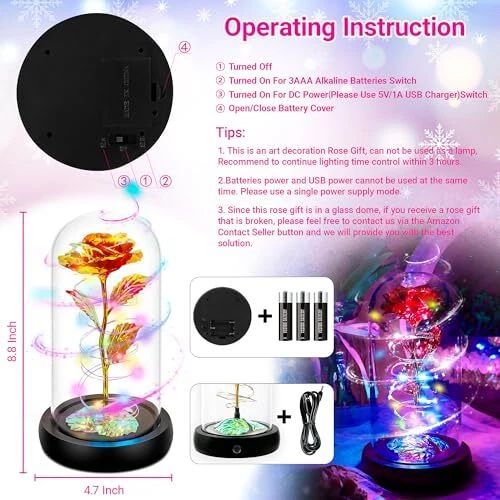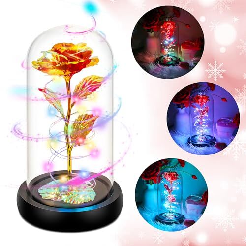 Shape: Rectangular Product Dimensions: 4.7"D x 4.7"W x 8.8"H EAN: Does Not Apply gtin13: Does Not Apply Special Feature: Rotating with Colorful LED Lights Recommended Uses For Product: birthday gifts for women, gifts for women, mom birthday gifts, an Item model number: VC-a4-50791 Item Height: 1 Included Components: 1x Colorful Rose with Warm Led Lights In A Glass Dome, 1 x Gift P Indoor Outdoor Usage: Indoor Item Weight: 1.28 pounds Occasion: Christmas, Wedding, New Year, Anniversary, Birthday Specific Uses For Product: Colorful Rose Flower In A Glass Dome,Her Day Gifts For Her,Gifts Color: Rotating Red Colorful Type: Does Not Apply Brand: Does Not Apply Container Material: Glass MPN: Does Not Apply Base Diameter: 4.7 Inches UPC: Does Not Apply Package Information: Box Material: Artificial Preserved Flowers, Glass Dome Materials sourced from: China Seasons: All Unit Count: 1 Count Item Width: 1 Date First Available: November 12, 2021 Container Shape: Rectangular Plant or Animal Product Type: Rose Item Package Quantity: 1 Manufacturer: CQX Number of Items: 1 Item Length: 1