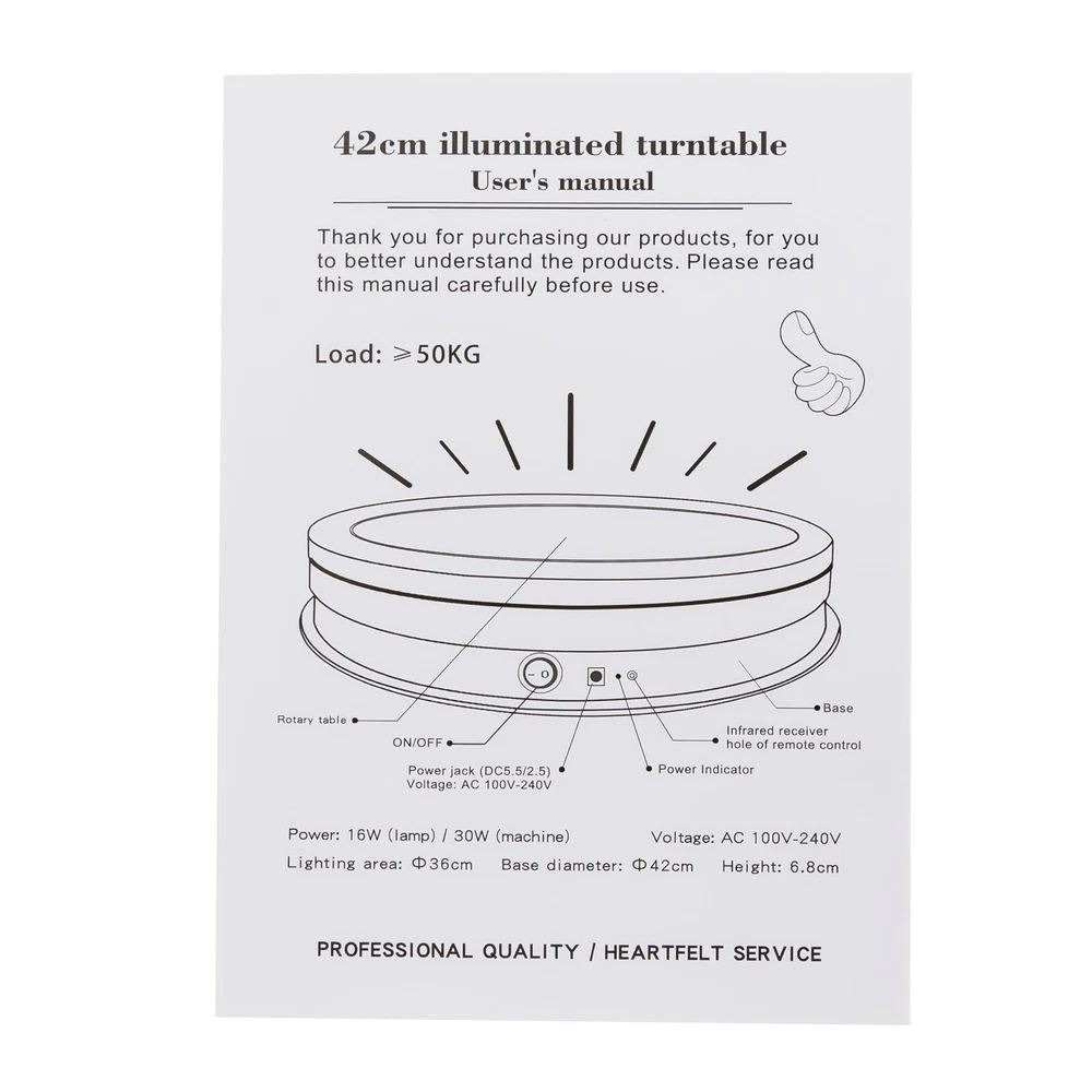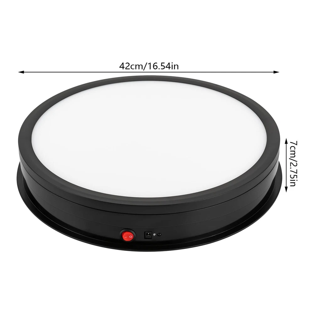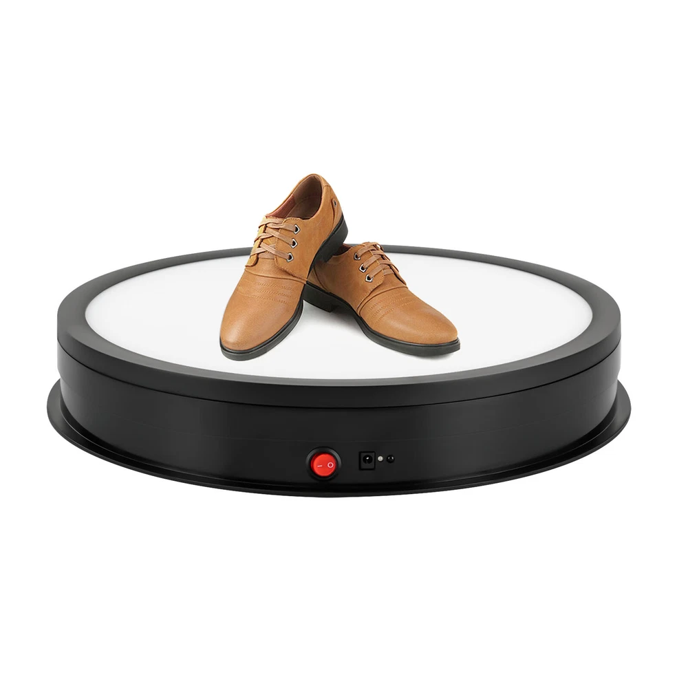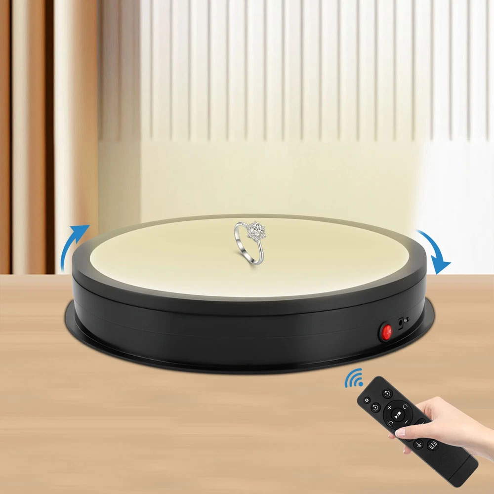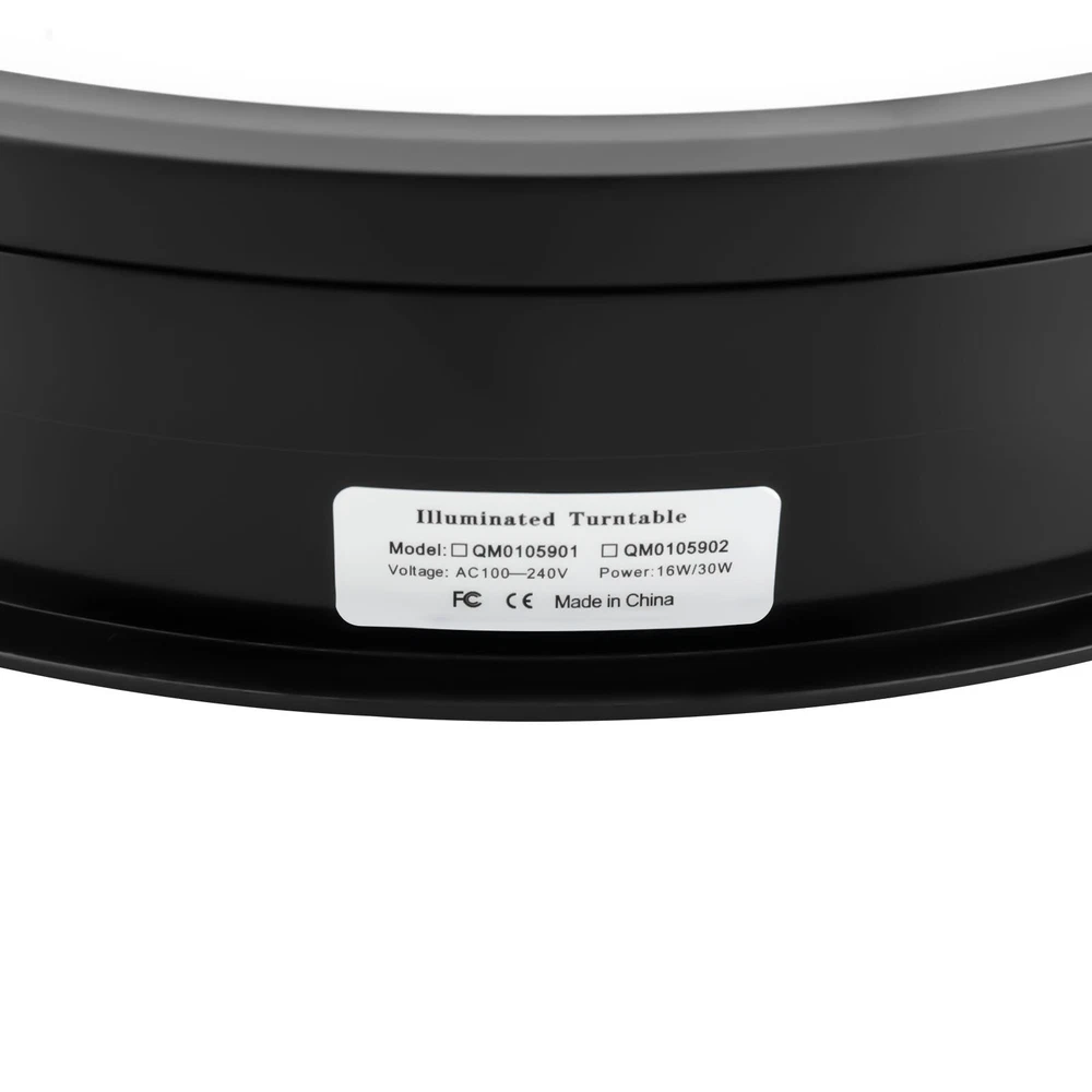 Specification Material: ABS+Acrylic Assembly Required: No Mount Type: Countertop Plug Standard: US Standard Voltage: 100-240V Shape: Round Style: Modern Base Type: Pedestal Power Source: Corded Electric Number of Items: 1 Three Colors of Light: White/Yellow/Yellow-White Rotation Speed: 20-60 Seconds / Circle Adjustment Method: Remote Control Battery Type: 2*AAA Batteries(Not Included) Remote Control Distance: Unobstructed 2-5m/6.56-16.4ft Maximum Weight: ≤50kg Working Noise: <40dB Light Power: 16W Overall Power: 30W Adjustable Angle: 45°, 90°, 180° Rotating Direction: Anti-Clockwise and Clockwise Gross Weight: 3.1kg/ 6.83 lbs Net Weight: 2.45kg/ 5.4 lbs Package Size: 45*48*9 cm/17.72*18.9*3.54 in Rotating Display Stand Platform Rack Product W/ 3 Color Led Light Turntable Rack Specification Model: QM0105902 Material: ABS+Acrylic Color: Black Assembly Required: No Mount Type: Countertop Plug Standard: US Standard Voltage: 100-240V Shape: Round Style: Modern Base Type: Pedestal Power Source: Corded Electric Number of Items: 1 Three Colors of Light: White/Yellow/Yellow-White Rotation Speed: 20-60 Seconds / Circle Adjustment Method: Remote Control Battery Type: 2*AAA Batteries(Not Included) Remote Control Distance: Unobstructed 2-5m/6.56-16.4ft Maximum Weight: ≤50kg Working Noise: <40dB Light Power: 16W Overall Power: 30W Adjustable Angle: 45°, 90°, 180° Rotating Direction: Anti-Clockwise and Clockwise Gross Weight: 3.1kg/ 6.83 lbs Net Weight: 2.45kg/ 5.4 lbs Package Size: 45*48*9 cm/17.72*18.9*3.54 in Product Size(φ*H): 42*7 cm/16.5*2.75 in Package Included 1 * Rotating Display Stand with Led Light 1 * Remote Control 1 * Adapter 1 * English Manual Specification Model: QM0105902 Material: ABS+Acrylic Assembly Required: No Mount Type: Countertop Plug Standard: US Standard Voltage: 100-240V Shape: Round Style: Modern Base Type: Pedestal Power Source: Corded Electric Number of Items: 1 Three Colors of Light: White/Yellow/Yellow-White Rotation Speed: 20-60 Seconds / Circle Adjustment Method: Remote Control Battery Type: 2*AAA Batteries(Not Included) Remote Control Distance: Unobstructed 2-5m/6.56-16.4ft Maximum Weight: ≤50kg Working Noise: <40dB Light Power: 16W Overall Power: 30W Adjustable Angle: 45°, 90°, 180° Rotating Direction: Anti-Clockwise and Clockwise Gross Weight: 3.1kg/ 6.83 lbs Net Weight: 2.45kg/ 5.4 lbs Package Size: 45*48*9 cm/17.72*18.9*3.54 in Product Size(φ*H): 42*7 cm/16.5*2.75 in Description Detailed product details and beautiful product images are more attractive to customers. Our rotating display stand with LED light can be rotated 360° so that the details in all directions can be displayed. It can also adjust the speed, angle, brightness, and rotation mode by remote control, thus adding more convenience to your shooting. It can make your display more beautiful and is also a great partner for home collections. Key Features High-quality Material: This product is made of high-quality ABS and acrylic, with high hardness, high abrasion resistance, and long service life. High Stability: The large 16.5 inch diameter round base provides high stability and over 110 lbs of load capacity, thus making the product safer to use. Easy to Use: The one-touch switch and remote control are simple and easy to operate. You can adjust the speed, angle(45°, 90°, 180°), brightness, and rotation mode (continuous rotation and intermittent rotation) by remote control to meet your different shooting needs. Panoramic Display: The 16.5" diameter round display can be rotated 360° to show every detail of your product and make it stand out in the reflection of light. The high quality white guide plate makes it free from visual screen flash and protects your eyes to a certain extent while enhancing the aesthetics of the product. It also does not cause shadows on the objects placed on it, making it easier for you to photoshop your products. Good Light Source: Energy-saving LED light with three colors (white/yellow/yellow white) can save energy and costs, and also allow you to choose the appropriate lighting atmosphere based on the appearance and color of the product, making the product images more exquisite and better attracting customers. Low Noise: The high-quality movement and motor make the working noise of product rotation within 40 decibels, which can provide you with a quiet and comfortable working environment. Protective Shipping: Plastic bags, bubble film, rigid cartons, and other multiple packaging make the product less likely to wear out during shipping, thus allowing you to receive an almost undamaged product. Details Long Power Cord: The 4.92ft power cord reduces usage limitations and further protects you. Anti-slip Pads: Five anti-slip pads not only effectively enhance the friction of your products but also protect the bottom of your product and the table from being worn. Application This product is ideal for displaying jewelry, watches, digital products, bags, models, shampoos, glasses, and other collectibles and is suitable for stores, studios, school libraries, exhibition halls, living rooms, events, parties, weddings, and other places. It is a great tool for product photography, making 360° videos, short videos, 3D models, and other product presentations. Notes Please note that other display items are not included in the package. Please do not use it for more than 8 hours at a time. For heavy products please make sure to place in the middle area of the turntable and turn slowly. Products with electrical plugs are designed for use in the US. Please check compatibility before purchasing. Please read the operating manual completely before use, and pay particular attention to the safety instructions included. Please allow the slight color difference caused by the shooting light and the 1-3 cm error due to manual measurement, and make sure you do not mind before ordering. Payment Delivery details Terms of sales About us Contact us Payment We accept ebay payment 。 Fees s