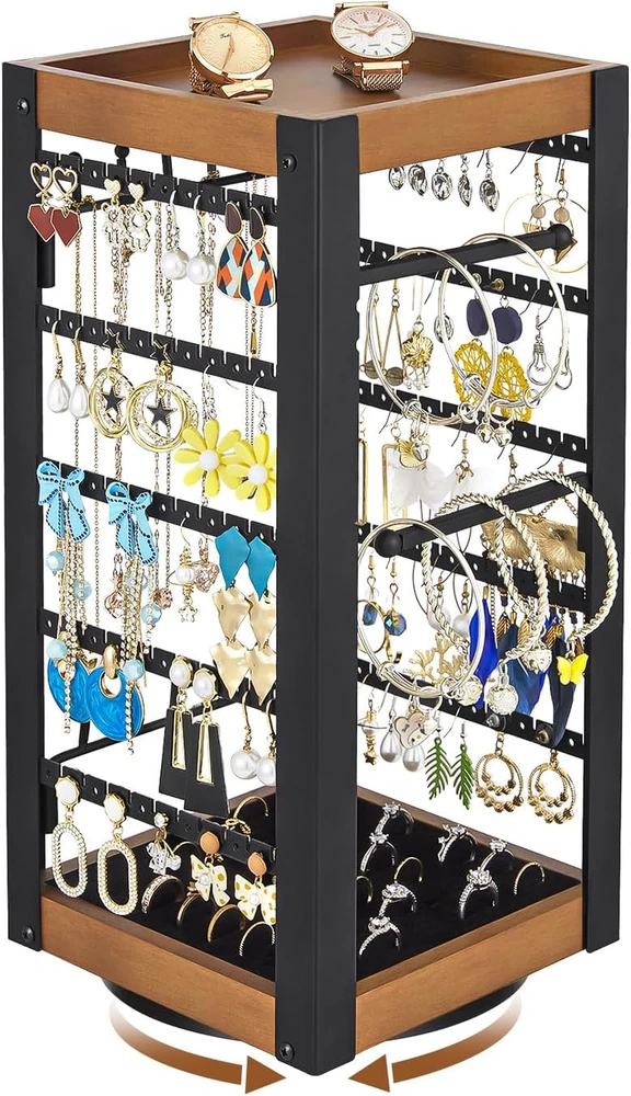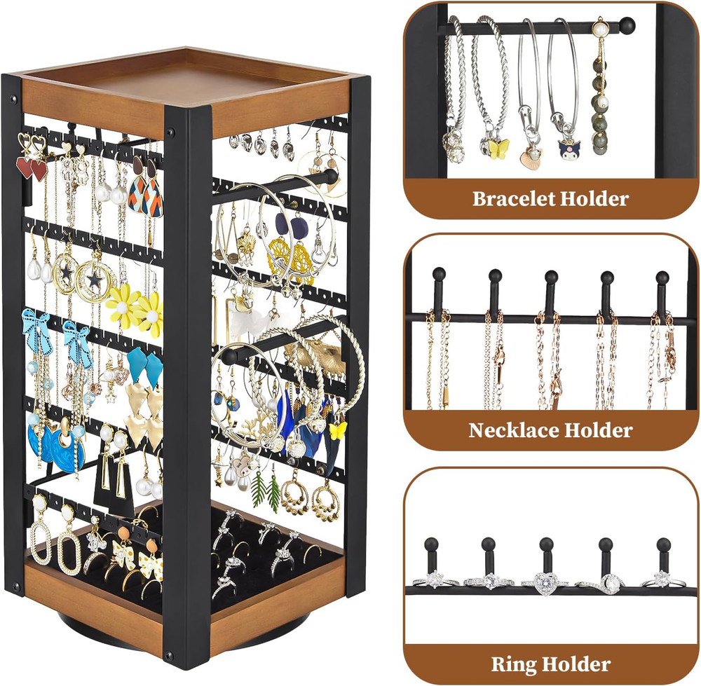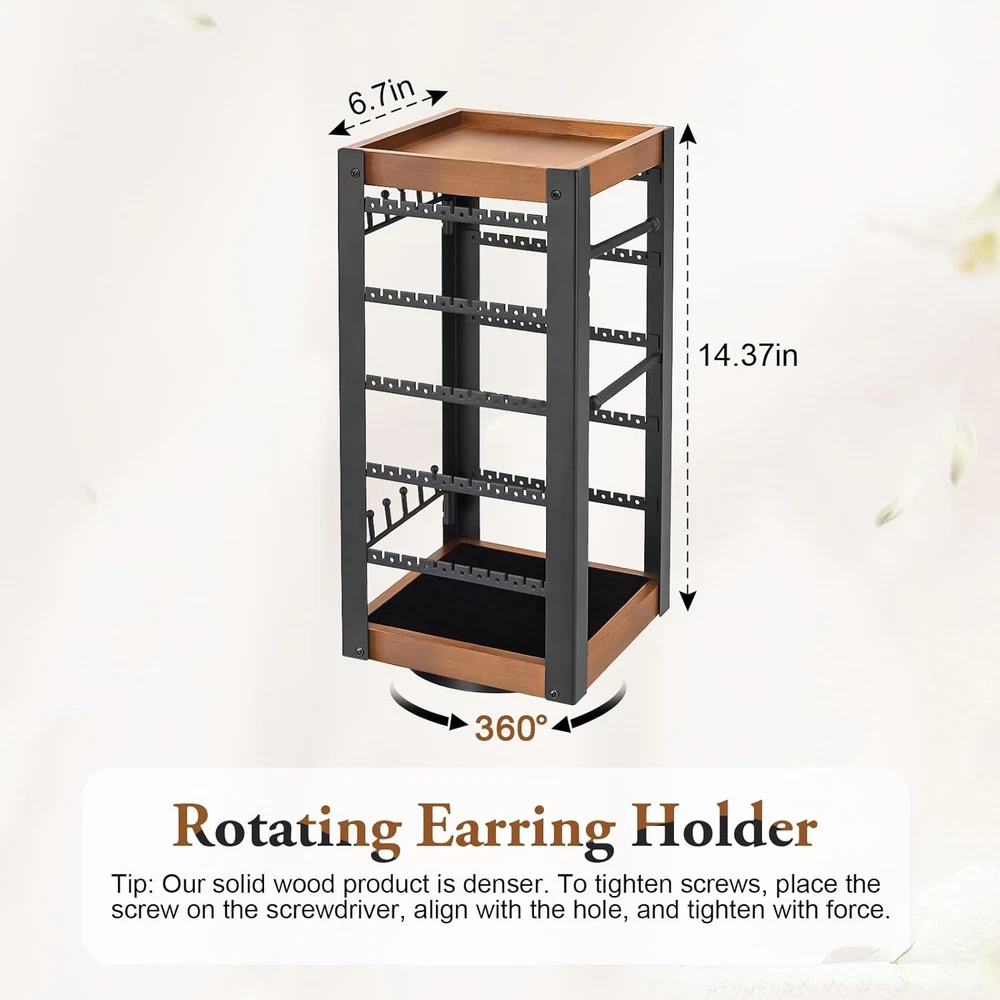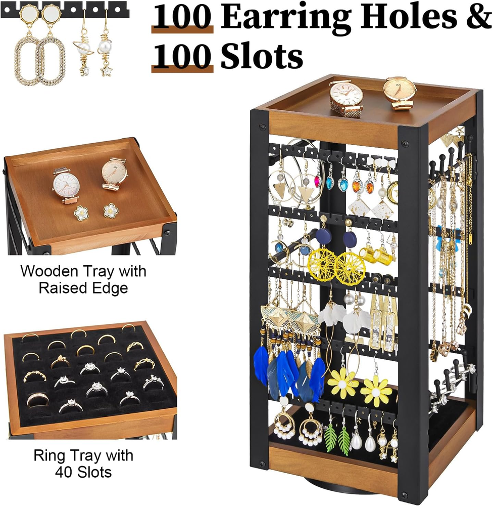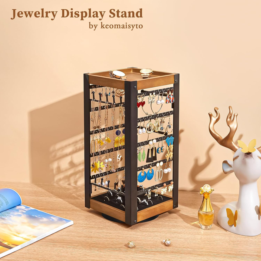 【360°Rotating Jewelry Organizer】This upgraded earring organizer features a rotating base at the bottom, allowing you to freely adjust it to the desired angle. It makes accommodating your needs effortless. Additionally, it facilitates easy retrieval and storage, making it an ideal jewelry display stand for countertops. 【Stable Swivel Base】Quality determines the product's lifespan and flexibility. For this jewelry stand, we have combined metal with solid wood to make it more durable and practical. Additionally, we've crafted the bottom swivel base out of high-quality materials, enhancing the versatility of this swivel earring holder. 【Wooden Tray & Ring Tray】The jewelry stand has a wooden tray at the top, and you can place perfume, sunglasses, lipstick and other items on these trays. And the bottom comes with a ring tray with a total of 40 ring slots to store a variety of rings and show off the original beauty of the jewelry. 【Versatile Storage & Exquisite Display】This square earring stand has two sides for storing earrings(100 slots and 100 holes), including pierced earrings, and the other two sides are necklace hooks/bracelet hooks/ring hooks. It meets almost all jewelry storage needs, and its exquisite appearance is perfect for showcasing jewelry, essentially creating a DIY earring tree. 【Easy Assembly】In just 3 steps, you can create your own exclusive earring holder for storage or display. Premium material and exquisite design infuse this jewelry rack with personality and greatly enhances the aesthetics. Product Description The video showcases the product in use. The video guides you through product setup. The video compares multiple products. The video shows the product being unpacked. Jewelry Holder Organizer by keomaisyto 360°Rotating Earring Organizer Bracelet Holder Necklace Holder Ring Holder 100 Earring Holes & 100 Slots 360 Rotating Jewelry Stand with Stable Base Top with Wooden Tray Made of thicker wood for more durability & raised edge design for better storage of items Bottom with Ring Tray The bottom comes with a ring tray with a total of 40 ring slots to organize a variety of rings.