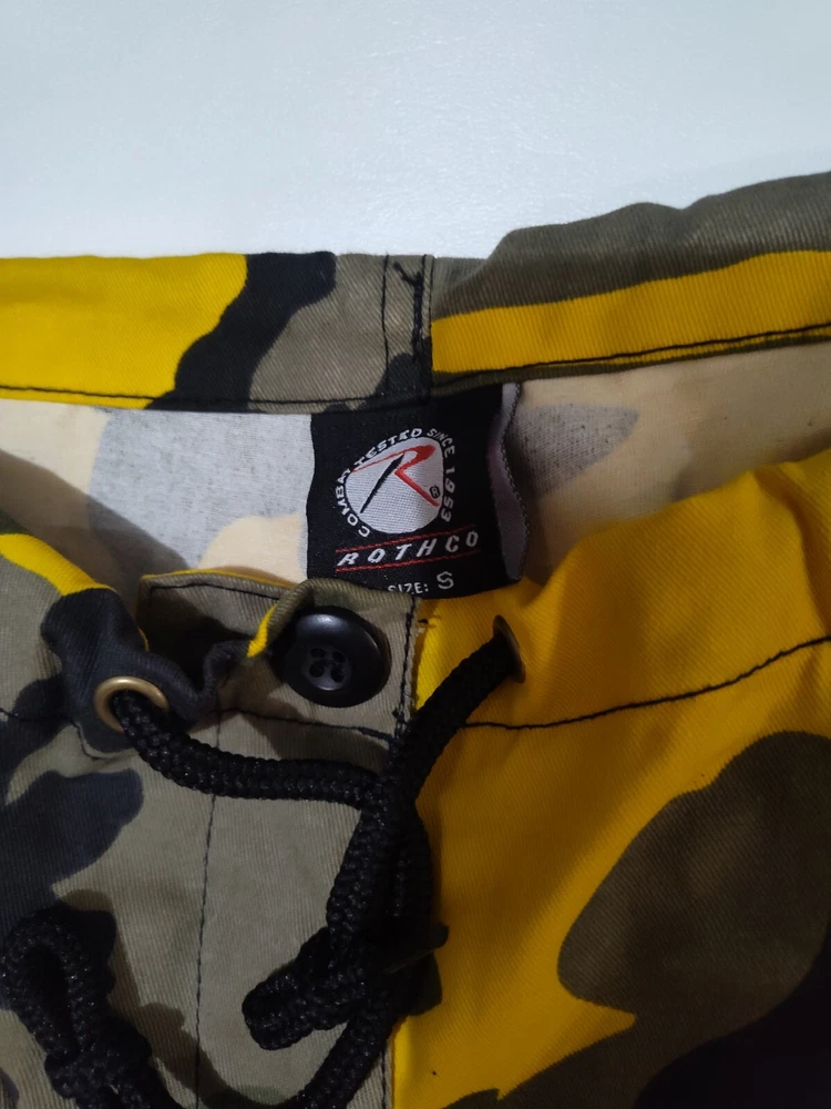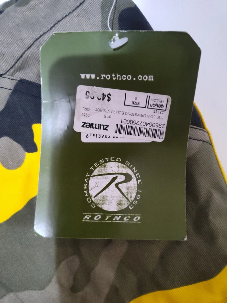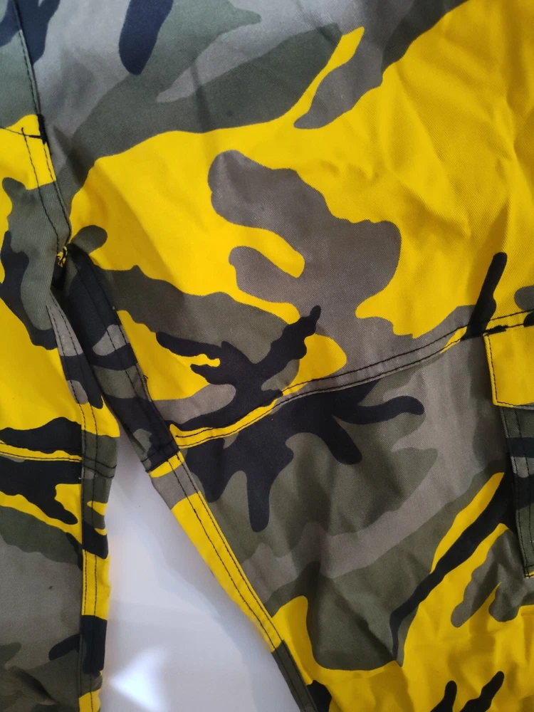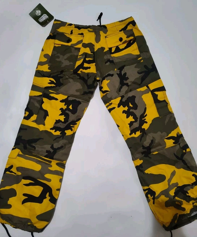 Elevate your streetwear game with these yellow Camo Cargo Pants from Rothco. These pants are perfect for travel, casual wear, and workwear. Made from durable cotton canvas material, these straight legged pants feature a flat front and a low-rise waist with a drawstring closure. With a total of 8 pockets, including 4 cargo pockets and 2 back pockets, these pants provide ample storage space for your essentials. The pants also come in a size small, with a 30-inch inseam and a waist size of 33"-35" drawstring. The camouflage pattern and accents, such as the pockets and zipper closure, make these pants a great addition to any urban or army-themed outfit. They were originally bought from Zumies.