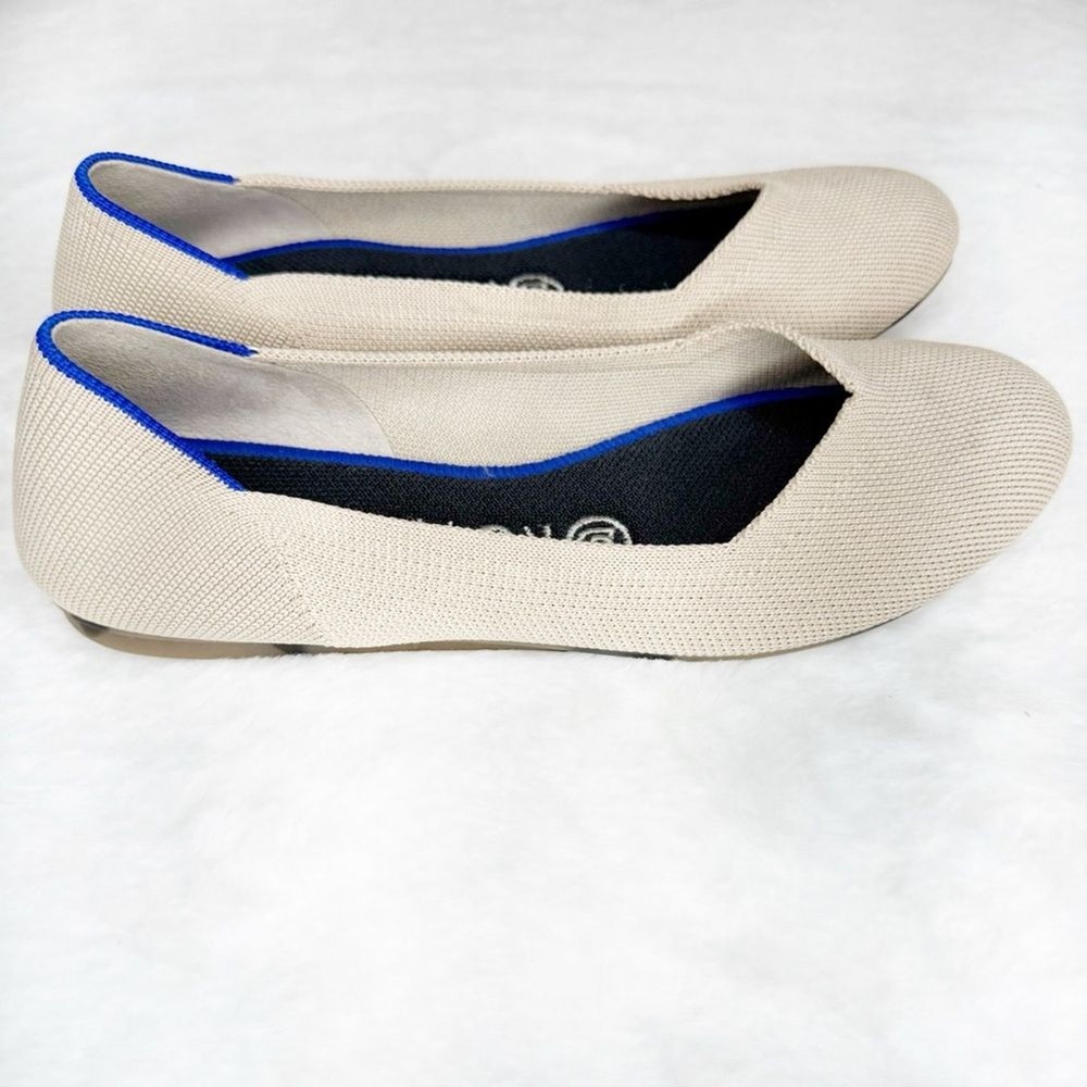 These cream flats from Rothy's feature a striking royal blue trim that adds a pop of color to their sleek design. Made from a soft, textured fabric, they offer a comfortable slip-on style with a rounded toe. Perfect for versatile wear, these flats combine elegance with everyday practicality.