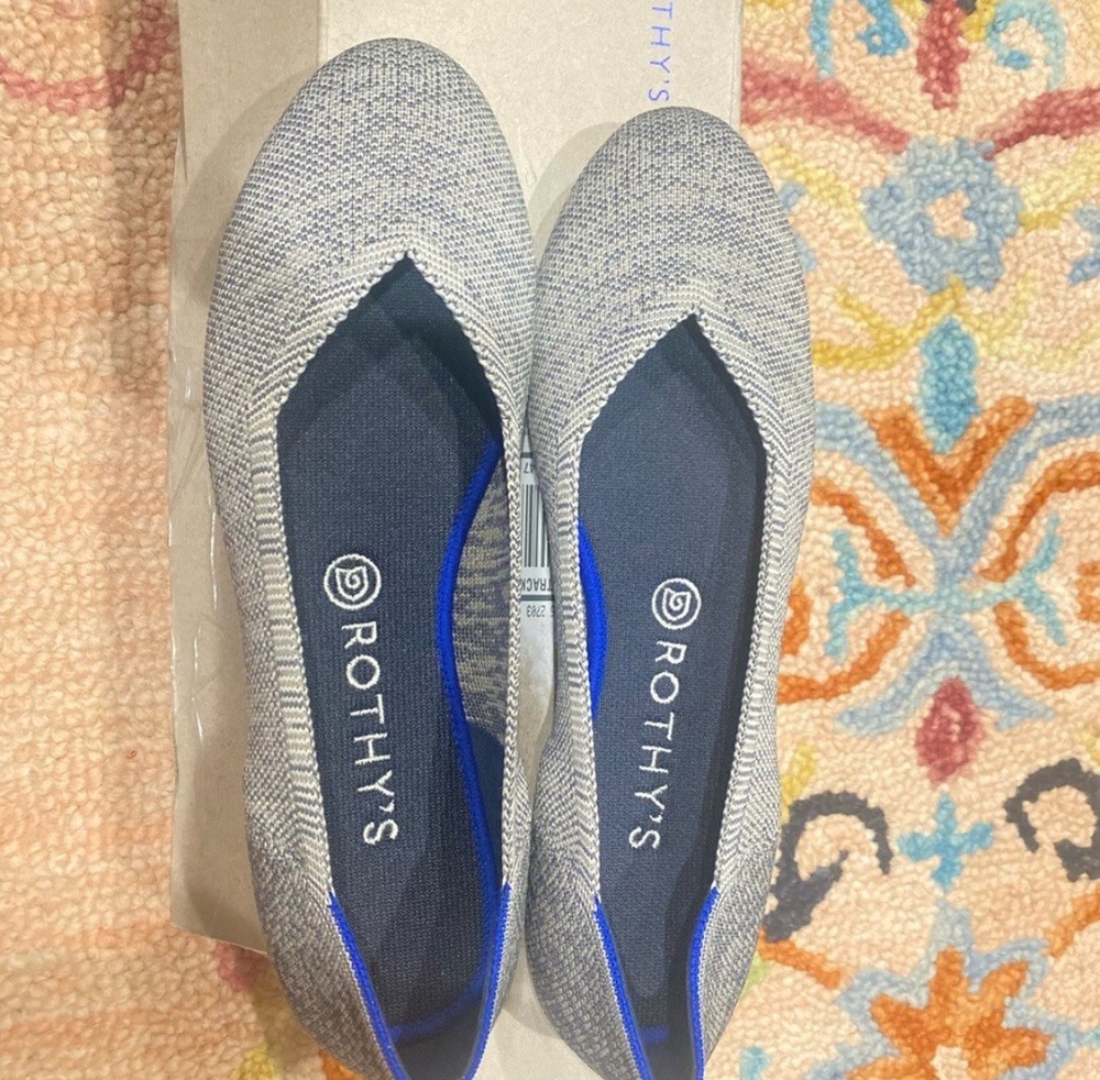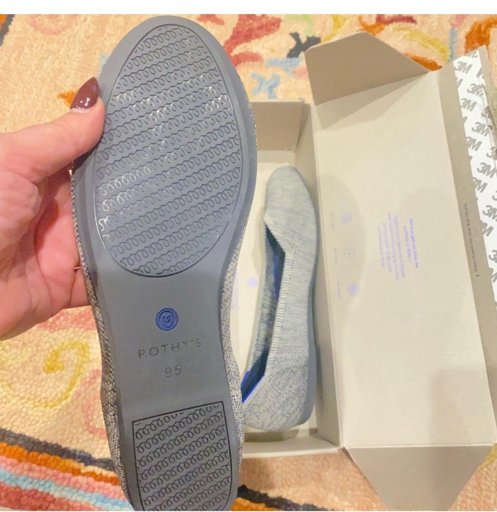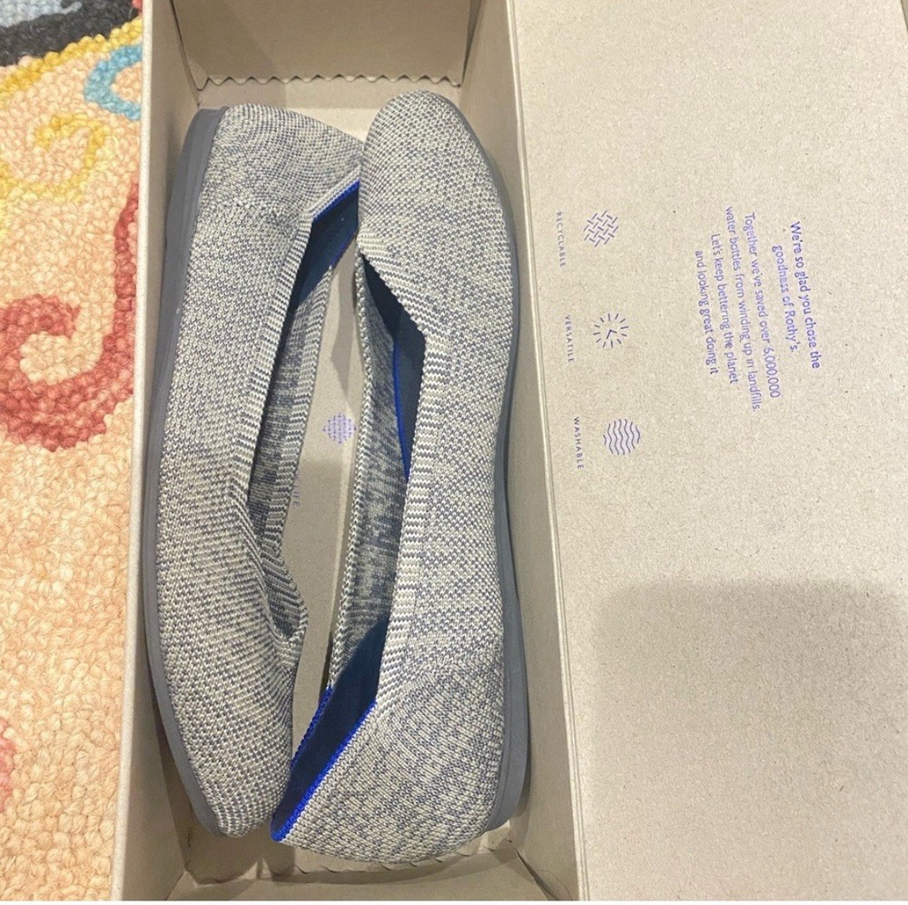 The product is a pair of women's flats by Rothy's in a size 9.5, featuring a pointed toe design and a slip-on closure. The shoes are made from a knit fabric in a gray and blue color scheme, with a lightweight construction suitable for casual occasions. The outsole is made of rubber, providing a comfortable and standard shoe width. Perfect for the summer, fall, and spring seasons, these flats are a stylish and versatile choice for everyday wear.