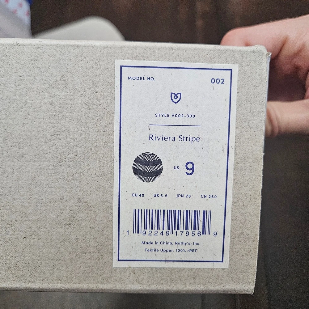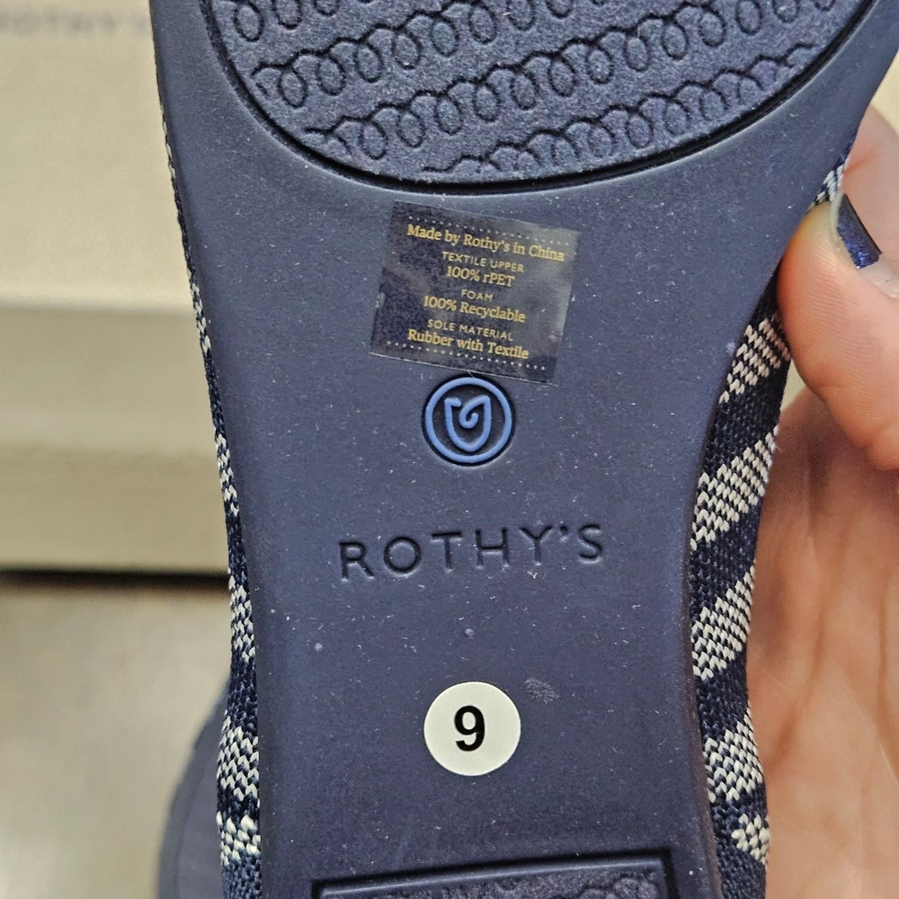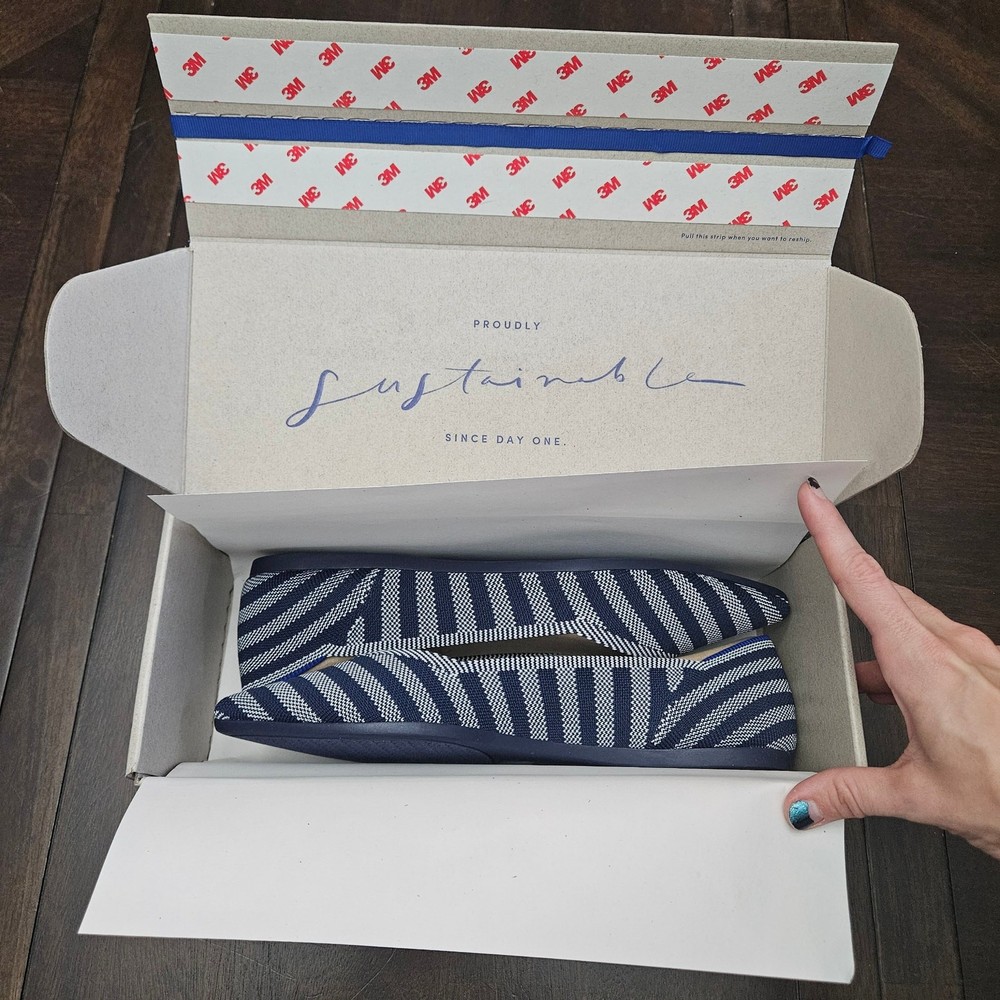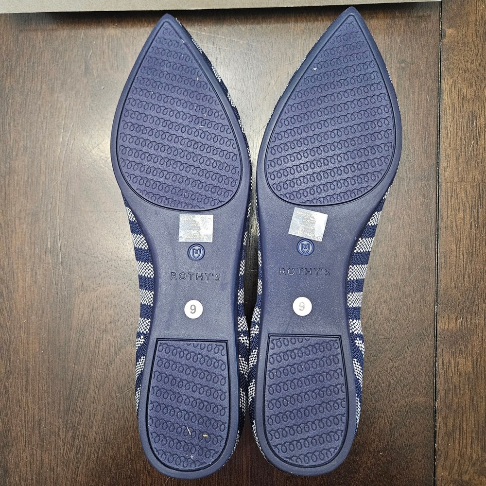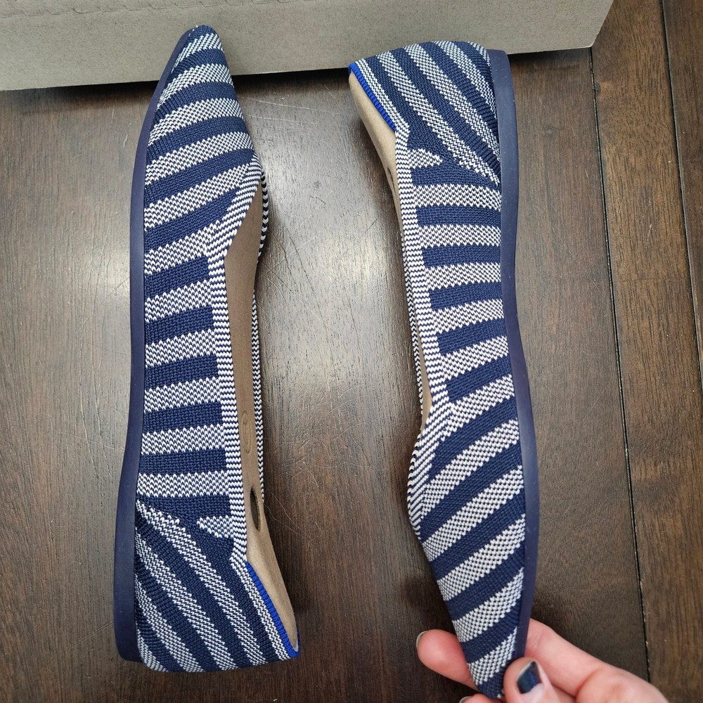 Rothy’s The Point Riviera Stripe Ballet Flat Women 9 Navy White NIB Sustainable Description Rothy’s “The Point” ballet flats in the Riviera Stripe pattern, featuring a navy blue and white diagonal stripe design with a sleek pointed-toe silhouette. Crafted from knit fibers made using 100% recycled plastic water bottles, offering lightweight flexibility and all-day comfort. Designed for easy slip-on wear with durable outsoles. These flats are machine washable—wash cold and air dry to refresh. New in box, never worn. Measurements are included in the photos. Fit note: Rothy’s typically recommends sizing up in The Point style due to the narrower toe box. Condition New in box, never worn Keywords Sustainable Footwear, Eco Friendly, Workwear Chic, Office Ready, Travel Friendly, Everyday Essential, Capsule Wardrobe, Timeless Flats, Comfortable Shoes, Minimalist Style, Polished Look, Smart Casual, Neutral Stripe, Sustainable Fashion, Circular Fashion