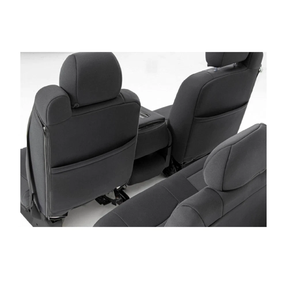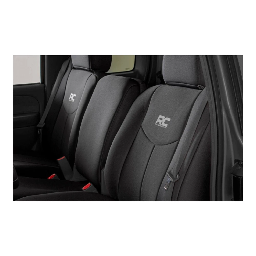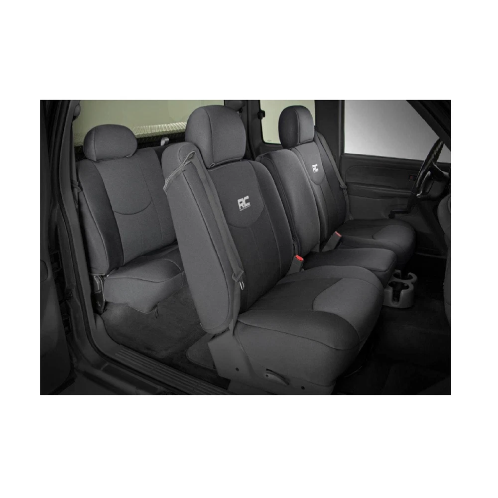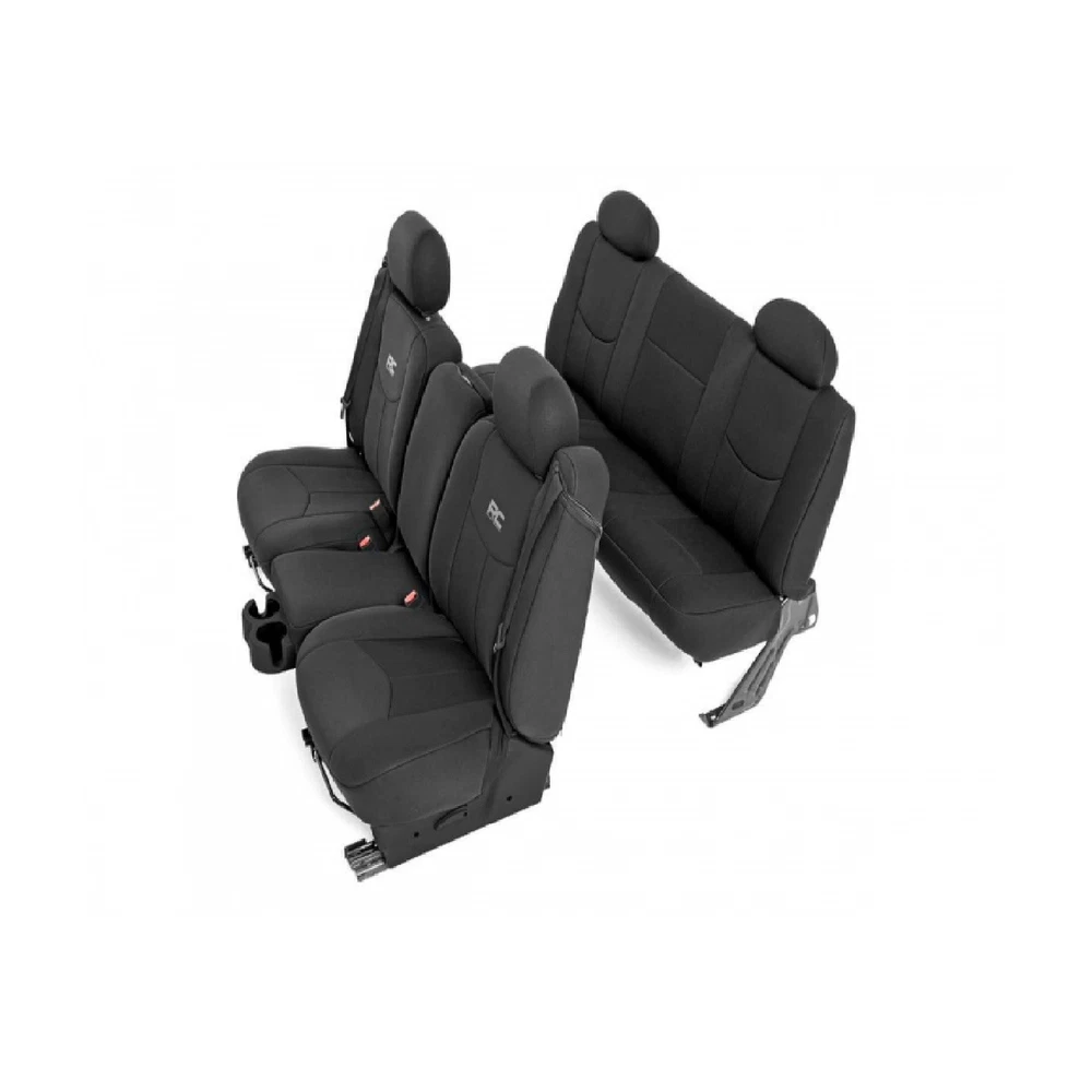 $ImageURL1$ Rough Country 91019 Set of Black Neoprene Seat Covers for 99-07 Silverado 1500 PART NUMBER: 91019 BRAND: Rough Country DESCRIPTION Black Neoprene Seat Covers Protect your Chevy's seats from water, mud, and anything you can throw at it with Rough Countrys front and rear Neoprene Seat Covers. These easy-to install covers fit snugly over your truck's seats to protect your interior from the elements while blending in perfectly. These comfortable seat covers feature a 4-layer construction with a thick foam padding for a comfortable feel and durable quality. The outer Neoprene protective layer wards off water and mildew while being soft to the touch and offering great breathability. Each cover is designed to be an exact fit on your vehicle, with accessibility for airbags, seat adjustment, and more! No tools required for this fast and simple upgrade, just slip each cover firmly over the seat and fasten with the built-in straps and youre ready to roll! Pick up a set of front seat covers to save your most-used seats from additional wear, or a rear set to protect your back seat from stains caused by kids or animals. Or choose front and rear for full seat protection! Features: Easy installation Made to factory specifications 4-Layer construction w/ foam padding and protective polyester shell Neoprene layer offers great breathability and water resistant Includes full covers for front seats - plus headrest covers where applicable Front covers help protect your most-used seats from wear Rear covers help protect your back seats from children and animal stains One year warranty Included: (1) Front seat cover (1) Rear seat cover (4) Headrest covers Important Notes: Does NOT fit Crew Cab Models Gently hand wash in warm, soapy water (mild solution only) and allow to air dry. Clean with a damp cloth or sponge is recommended Do NOT pressure wash Do NOT allow seat covers to come into contact with sharp or hot objects.