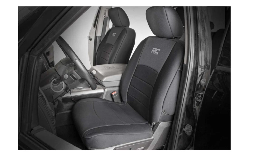 $ImageURL1$ Rough Country 91029 Front Seat Covers for Dodge Ram 1500 RAM 1500 2500 3500 PART NUMBER: 91029 BRAND: Rough Country DESCRIPTION Seat Covers Comfortable and Durable Protection. Protect your seats from water, mud, and anything you can throw at them with Rough Countrys front and rear Neoprene Seat Covers. These easy-to-install covers fit snugly over your truck's seats to protect your interior from the elements while blending in perfectly. These comfortable seat covers feature a 4-layer construction with thick foam padding for a comfortable feel and durable quality. The outer Neoprene protective layer wards off water and mildew while being soft to the touch and offering great breathability. Each cover is designed to be an exact fit on your vehicle, with accessibility for airbags, seat adjustment, and more! Pick up a set of front seat covers to save your most-used seats from additional wear or a rear set to protect your back seat from stains caused by kids or animals. Or choose front and rear for full seat protection. Installation and Warranty. No tools are required for this fast and simple upgrade, just slip each cover firmly over the seat and fasten with the built-in straps and youre ready to roll! Rough Countrys Neoprene Seat Covers are backed with a two-year warranty towards manufacturer defects. As such, the product is protected from structural and workmanship damage after the date of purchase. With our industry-leading warranty give yourself peace of mind when using Rough Country's Suspension products. FEATURES: Fits very snug Made to factory specifications 4-Layer construction w/ foam padding and protective polyester shell Neoprene layer offers great breathability and water resistance Includes full covers for front seats - plus headrest covers where applicable Front covers help protect your most-used seats from wear Rear covers help protect your back seats from children and animal stains Two-year warranty NOTES - IMPORTANT: Front covers ONLY fit bucket seats Rear cover ONLY fits models with fold-down arm rest Rear cover ONLY fits Crew Cab models