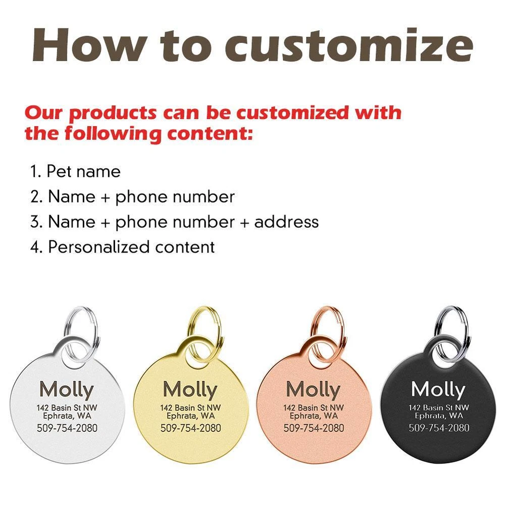 Description Description&Preview shipping&policy Description: Personalized customization: Dog tag customization services allow you to design unique dog decorations based on your preferences, pet characteristics and needs, making dog tags even more personalized. High quality materials: We use high quality materials to make dog tags to ensure that the product can be used for a long time. Material selection of environmentally friendly metal or alloy, smooth surface, not easy to rust, safe and reliable. Clear lettering: We use advanced lettering technology to ensure that the lettering content is clear and not easy to fade. You can carve your pet's name, contact number or other personalized content on the dog tag to make it easier for someone to find your pet. (Customize up to 4 lines of personalized text on the back of the label) Versatile use: In addition to being a dog or cat ID tag, dog tags can also be used as decorations, tags, or pendants for pet collars. It can both show your pet's information and add a style and personality to your pet. The perfect gift: The dog tag customization service is not only suitable for your pet, but also the perfect gift choice for your dog or cat friend. Personalized dog tags will surprise and delight them, making them feel your care and care. Material: Metal Color:Silver, gold, rose gold, black Size: 2.5cm Shape: Round Font: bold Preview: Thank you for your purchase Problems? You can follow below process to contact us. There is a time zone difference,but we will do our best to quickly response to your questions: Shipping ● We will arrange shipping for you within 24 Hours after payment cleared except the holidays. ● We always send the item to the address you give us on Payoneer to ensure the security of the item. If you have changed your address, or want us to ship to another address, please change to the new address when you pay us with Payoneer, otherwise we will not be responsible if the package is lost. Payments We accepts Payoneer only If you have any questions about the payment,please contact us through eBay message. Import Duties In case some duty is due Upon delivery, it is your responsibility to meet that expense and this may cause delays to delivery schedule and you may have to pickup goods at the customs office. Terms & Conditions By bidding on this item,the Buyer agrees to all of the terms and conditions as outlined in this listing .please ensure to read and agree to All eBay terms and Conditions before bidding. All pictures are for illustration purpose only and Colours may vary slightly. Our store obeys all eBay Rules and Policies. Returns Policy To Return an item you must contact us and take photos of your item to clearly show any damage or unusual aspects of it. Approved returns will be subject to inspection on arrival. Items must be returned in original condition with all original packaging. All shipping and handing charges are non-refundable Return delivery costs are the responsibility of the buyer. We will cover the cost if sending replacement/repaired items. Within 7 days after receiving your products, we offers a no-hassle 7 day exchange/replace only if your items are found to be defective by manufacturer.