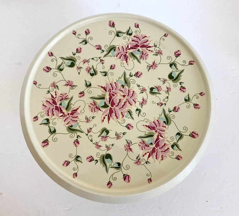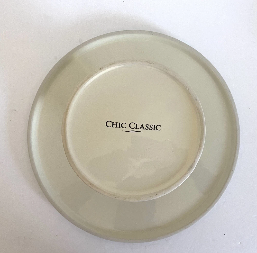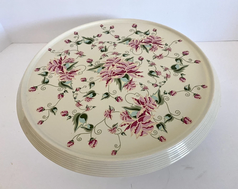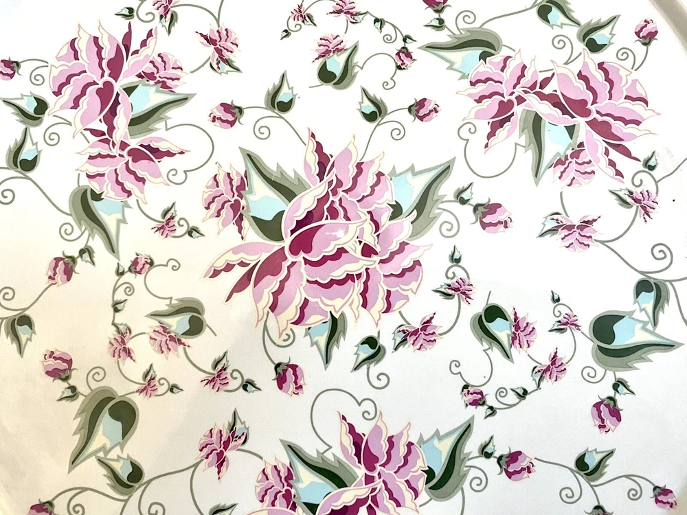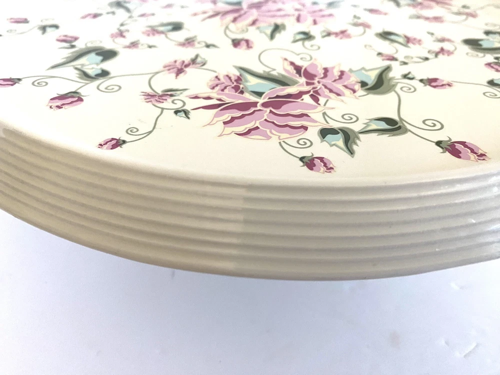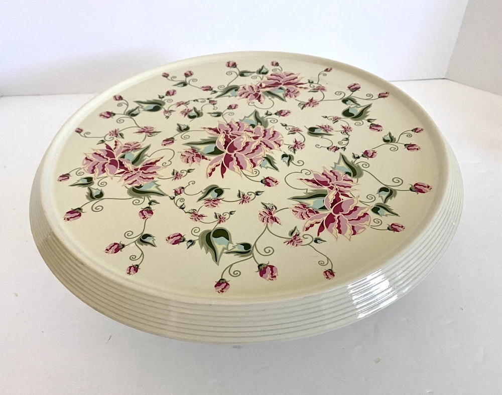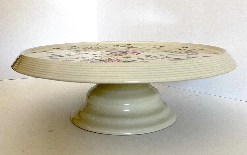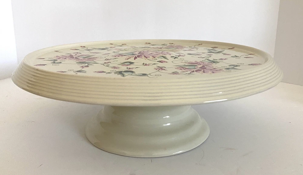 Chic Classic 11” Pink Floral & Ivory Decorative Ceramic Pedestal Cake Stand Weddings, Baby Showers, Anniversaries. Perfect for cupcakes, cake, cookies, or any other dessert pastries. Pretty floral pink, green, and gold, on Ivory Ceramic. Excellent condition. No chips or breaks.