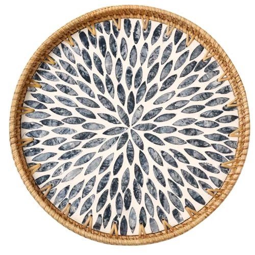 Return Policy Fast Delivery Trusted seller Round Rattan Tray with Mother of Pearl Inlay, Rattan Serving Tray for Coffee, Bread, Fruits, Decorative Wicker Tray for Table Decor, Home Decor, Kitchen Island Decor (Dark Blue Leaf, 11.8") Product Description ★Size and Style: 11.8" Diameter, Dark blue leaves pattern. ★Handwoven Natural Rattan Tray: This rattan tray is hand-woven from rattan, with strong wood core. The mother of pearl inlay on the surface with a glossy lacquer, only need wipe this tray with a damp cloth to clean it ★Easy to Pick and Non-slip: Rubber on the bottom of the tray is designed to prevent slipping, it a durable practical decorative tray for cup, dishes, coffee, tea ★Wide Application: This wicker serving tray be used for storaging fruit, bread, food, coffee, tea, vanity, perfume, jewelry, coins, keys ★Good Decor: A good decorative tray for coffee table, ottoman, bathroom, bed, home, living room, hotel, restaurant, office Shipping Returns Payment Shipping Shipping is FREE to all addresses other than APO/PO boxes in the lower 48 states. All our stock ships from US-based warehouses. Shipped via USPS or UPS (depending on location and package weight) Unless stated otherwise, all orders will ship within 24-72 hours of your payment being processed. Check our feedback to see the great reviews of FAST shipping we offer. Returns Seller does not accept returns Payment We currently accept payment via eBay managed payments only. Once payment is cleared, we will dispatch your shipment within 1-3 business days. Please refer to the "Shipping" tab for more information regarding shipping speed to your destination.