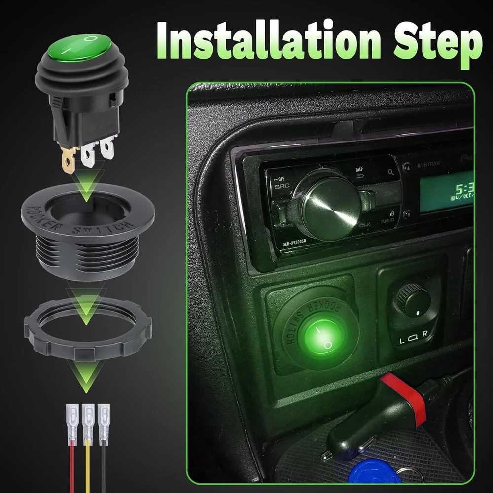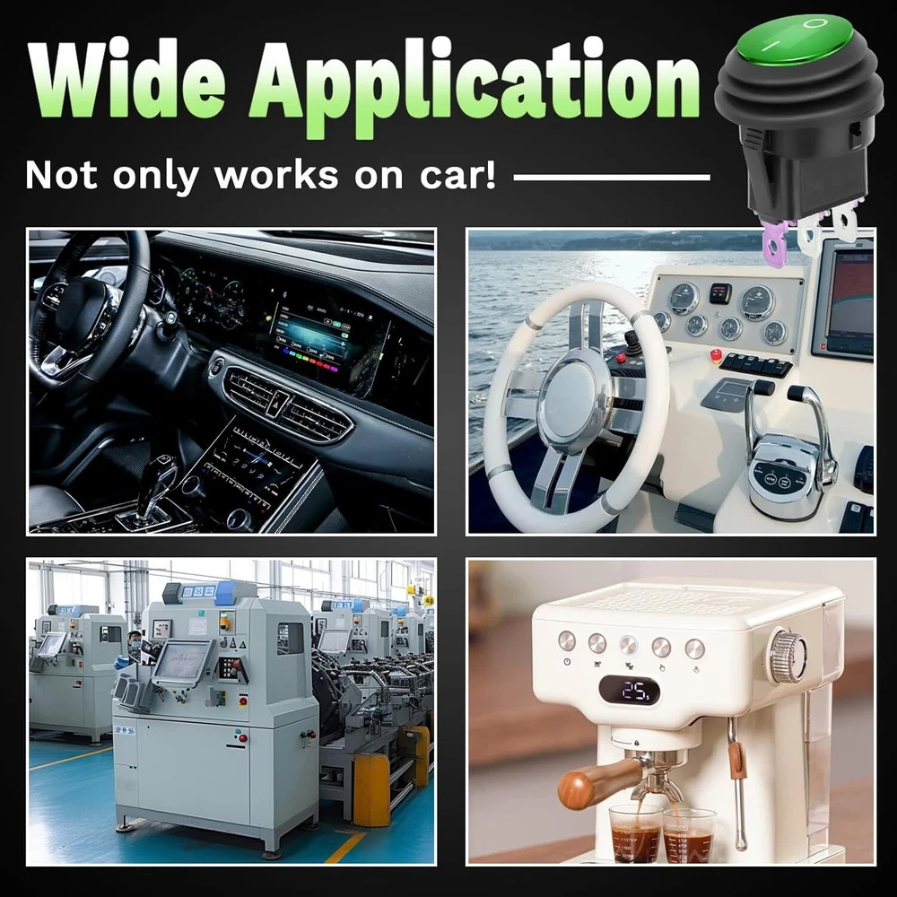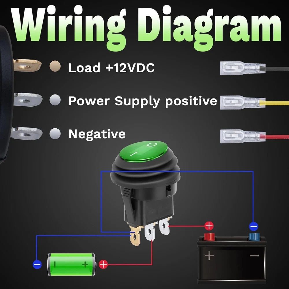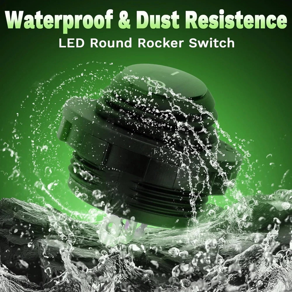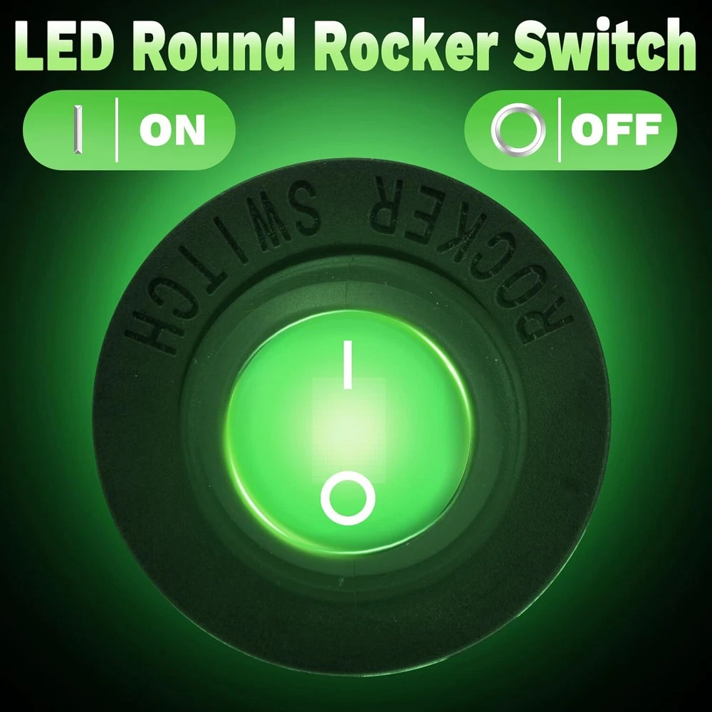 Round Rocker Switch, 12V Toggle Waterproof Lighted 2 pcs, Green 2pcs Product Details 【Special Design】 The round Rocker switches is designed for 12V applications and features a SPST ON/OFF design with 3 pins. It includes a waterproof cover, making it suitable for marine, automotive, RV, and boat use. The switch is easy to install, requiring a 20mm panel cutout 【Lighted LED Indicator】 This 12V toggle switch comes with a blue LED light that illuminates when the switch is turned on, providing a clear indication of the switch’s status. This feature is especially useful in low-light conditions and enhances the overall visibility 【High-Quality Material】 Made with durable plastic and brass terminals, the rocker switch ensures long-lasting performance. The switch is also waterproof and dustproof, providing reliable operation in various environments. It meets automotive and marine-grade standards for quality and safety 【Easy Installation】 The round switch includes a keyhole slot to prevent unwanted rotation and comes with pre-soldered wires for hassle-free installation. Simply insert the switch into a 20mm hole and connect the wires to complete the setup 【Wide Application】 This versatile switch is suitable for a variety of applications, including cars, trucks, boats, ATVs, UTVs, RVs, and other 12V electrical systems. It can also be used for household appliances and electronic modifications, making it a practical accessory for any project