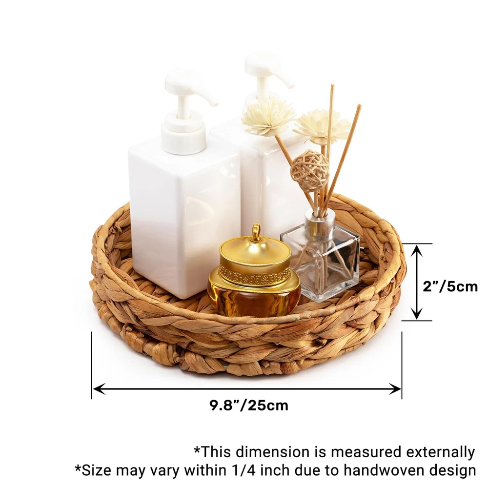 Our round wicker storage basket measures 9.8"L x 9.8"W x 2"H. Decorative water hyacinth tray for organizing. Size may vary within 1/4inch due to handwoven design DURABLE NATURAL BASKETS for ORGANIZING. Carefully handcrafted by skilled craftmen from 100% clean water hyacinth material and a steel frame for strength ADORABLE HIGH QUALITY TRAY. With natural colors mixed with hand-woven textures, our pantry baskets can be a versatile décor in your home. Both functional and decorative, can be used for a long time VERSATILE STORAGE BASKETS. The rustic wicker basket is ideal for holding hand towels, condiments, toiletries, makeups, fruits, snacks and clutters. Great for kitchens, pantries, bathrooms, living rooms, etc. Our woven trays can be stacked for easy storage when not in use. Please place in a dry and ventilated place. Periodically sun-dry to avoid mold and mildew. Easy clean with a dry towel. If you have any questions, please contact us and we will give you a satisfactory reply