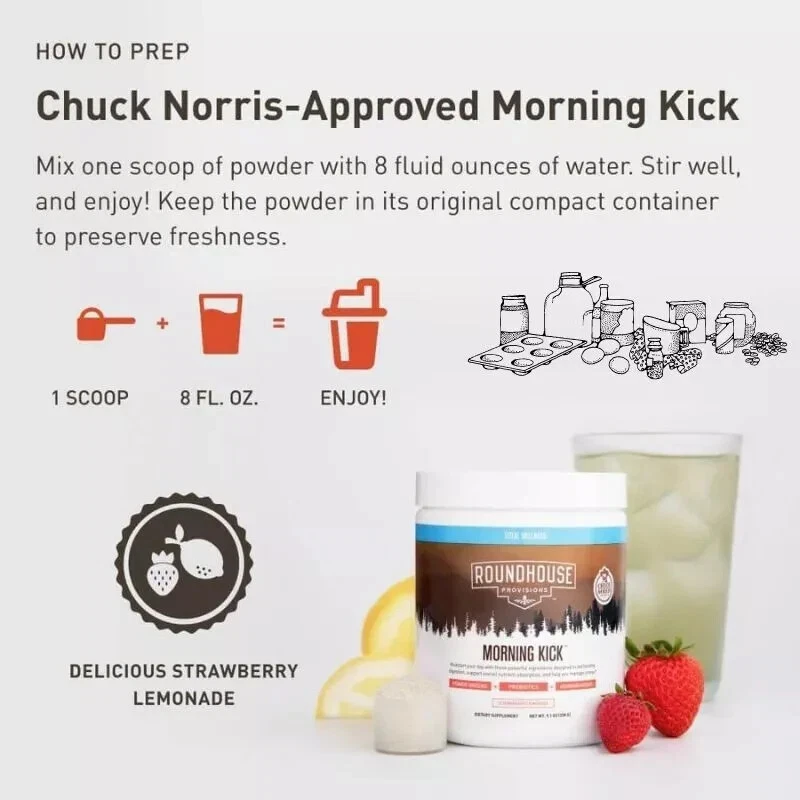 Roundhouse Provisions MORNING KICK digestion Strawberry Lemonade 9.1oz Brand Kick start your pallet and greet the dawn with a vivid, nutrient-rich breakfast—a feast of flavors that feeds both body and spirit, inspiring your day to unfold wonderfully. Morning Kick, a tasty nutritious greens powder drink that tastes like strawberry lemonade. Enjoy perks such as better digestion, less bloating, balanced gut bacteria, improved bowel movements, stress relief, GI strength, vitality, and joint care. Ingredients: morning kick is composed of all natural ingredients that are as follows: Green blends: Nutritious foods like spirulina, chlorella, and kale are used in the Morning kick that aids in achieving healthy weight and metabolism as well as provides a lot of energy. Prebiotics and probiotics: Prebiotics and probiotics is also another most essential component of Morning Kick that helps in easy digestion, less bloating, prevents from gas, and as well as infrequent constipation. Collagen peptides: Collagen peptides used in morning kick are beneficial for joints and muscles and aids in achieving a healthy body. Ashwaganda: Another super ingredient used in Morning Kick is the Ashwaganda scientifically known as Withania Somnifera works as an Anti-aging component, reduces stress, boost energy, improves overall immune system, elevates mood. Usage: Morning Kick is easy to prepare all you have to do is mix a scoop of Morning kick in 8 fluid ounces of water. Its lovely strawberry lemonade taste offers a great pick-me-up at any time of day or night, emergency or not.