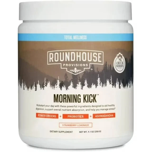 Roundhouse Provisions MORNING KICK digestion Strawberry Lemonade 9.1oz Brand New Kick start your pallet and greet the dawn with a vivid, nutrient-rich breakfast—a feast of flavors that feeds both body and spirit, inspiring your day to unfold wonderfully. Morning Kick, a tasty nutritious greens powder drink that tastes like strawberry lemonade. Enjoy perks such as better digestion, less bloating, balanced gut bacteria, improved bowel movements, stress relief, GI strength, vitality, and joint care. Ingredients: morning kick is composed of all natural ingredients that are as follows: Green blends: Nutritious foods like spirulina, chlorella, and kale are used in the Morning kick that aids in achieving healthy weight and metabolism as well as provides a lot of energy. Prebiotics and probiotics: Prebiotics and probiotics is also another most essential component of Morning Kick that helps in easy digestion, less bloating, prevents from gas, and as well as infrequent constipation. Collagen peptides: Collagen peptides used in morning kick are beneficial for joints and muscles and aids in achieving a healthy body. Ashwaganda: Another super ingredient used in Morning Kick is the Ashwaganda scientifically known as Withania Somnifera works as an Anti-aging component, reduces stress, boost energy, improves overall immune system, elevates mood. Usage: Morning Kick is easy to prepare all you have to do is mix a scoop of Morning kick in 8 fluid ounces of water. Its lovely strawberry lemonade taste offers a great pick-me-up at any time of day or night, emergency or not.