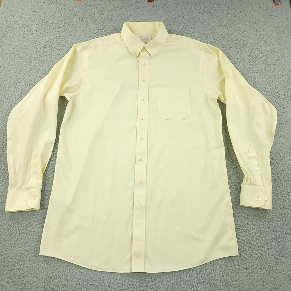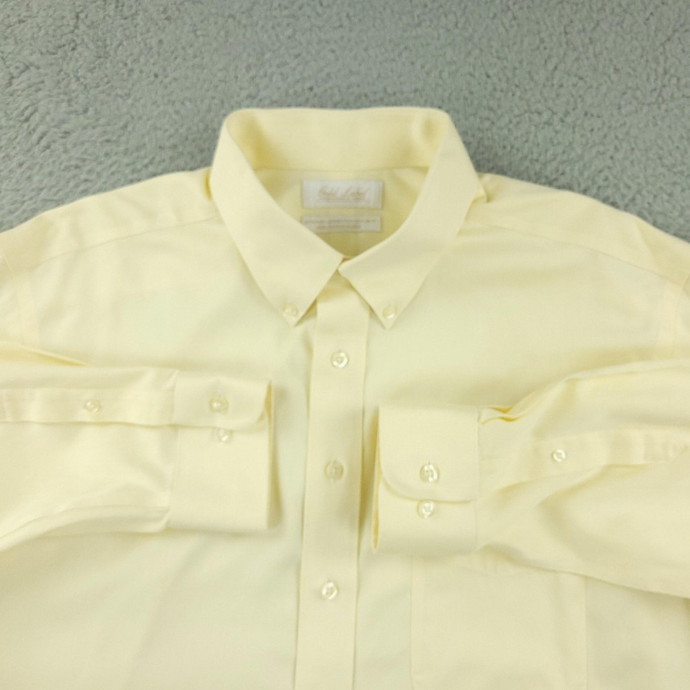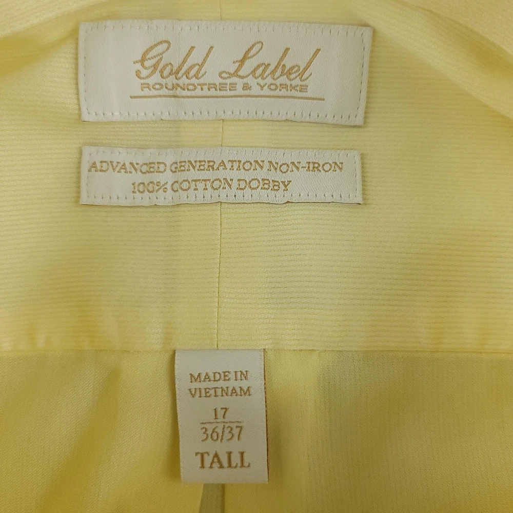 Roundtree & Yorke Gold Label Dress Shirt Mens 17 36/37 Yellow Tall Non Iron Brand: Roundtree & Yorke Gold Label. Style: Mens long sleeve non-iron dress shirt with subtle dobby texture and button-front closure. Color: Light yellow solid. Tag size: 17 neck / 36/37 sleeve, Tall (Big & Tall fit). Material: 100% cotton dobby, advanced generation non-iron fabric. Details: Button-down collar, single chest pocket, barrel button cuffs, back box pleat, curved shirttail hem. Additional info: Gold Label collection; made in Vietnam. Measurements are included in the photos, compare measurements with your item to ensure proper fit. Items are added daily click here to Visit My Store Combined shipping for US customers is 1.99 for each additional item Items are cleaned per eBay standards & policies
