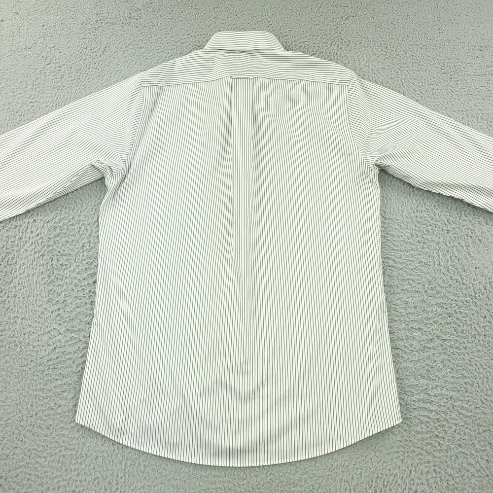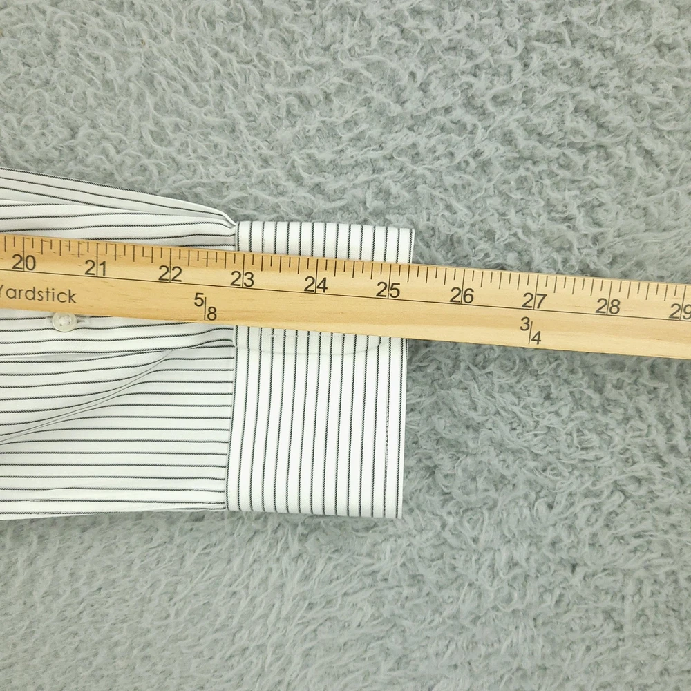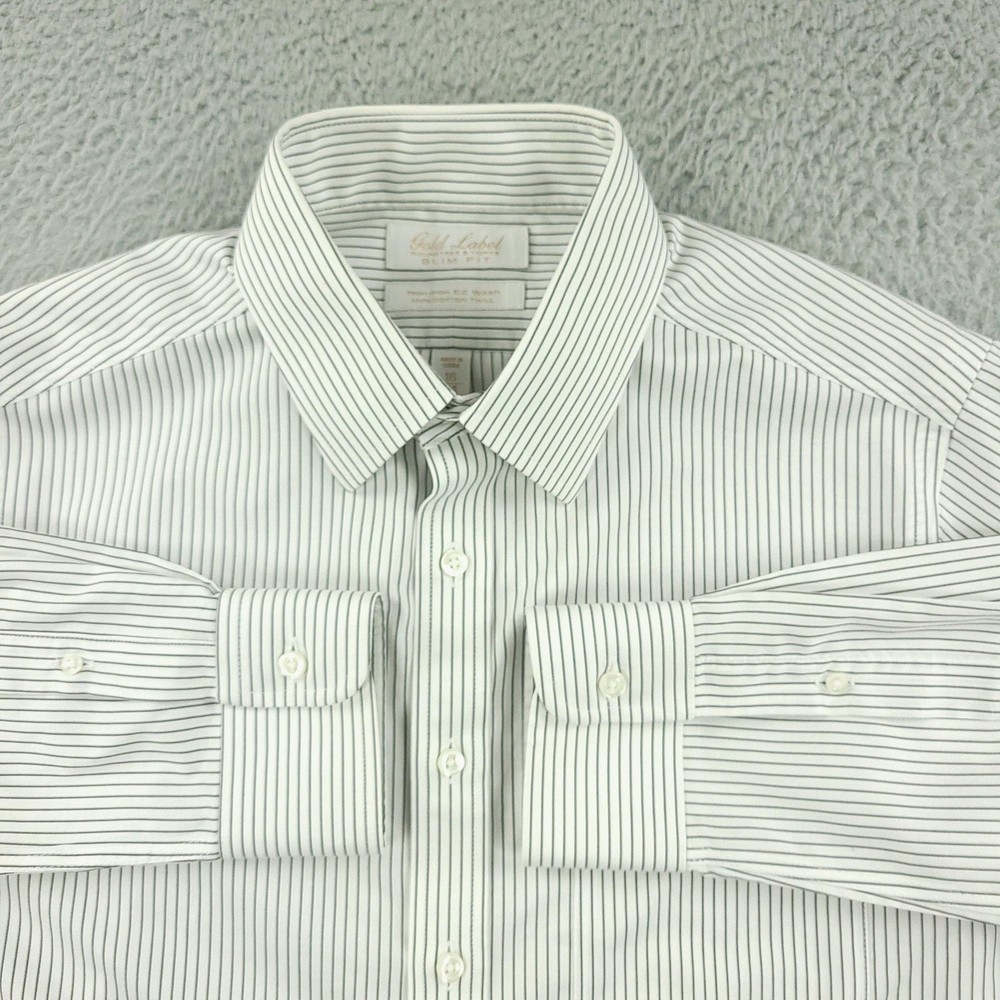 Brand: Roundtree & Yorke Gold Label Style: Mens long sleeve slim fit dress shirt with vertical stripe pattern. Color: White base with thin dark stripes. Size on tag: 16 neck, 34 sleeve, Slim Fit. Material: 100% cotton twill; Non-iron EZ Wash, per inner label. Details: Point collar, full button front, single chest pocket, barrel cuffs with button closure, back yoke with center pleat, curved shirttail hem. Made in China. Washed and dried with Fragrance Free Detergent & Dryer Sheets. Measurements are included in the photos, compare measurements with your item to ensure proper fit. (Measurements are done with the item lying flat). I ship next business day and all items include tracking. Items are added daily to my store Visit My Store Buy More & Save! Combined shipping for US customers - $1.99 for each additional item (Add items to shopping cart and discounts will automatically calculate during checkout)