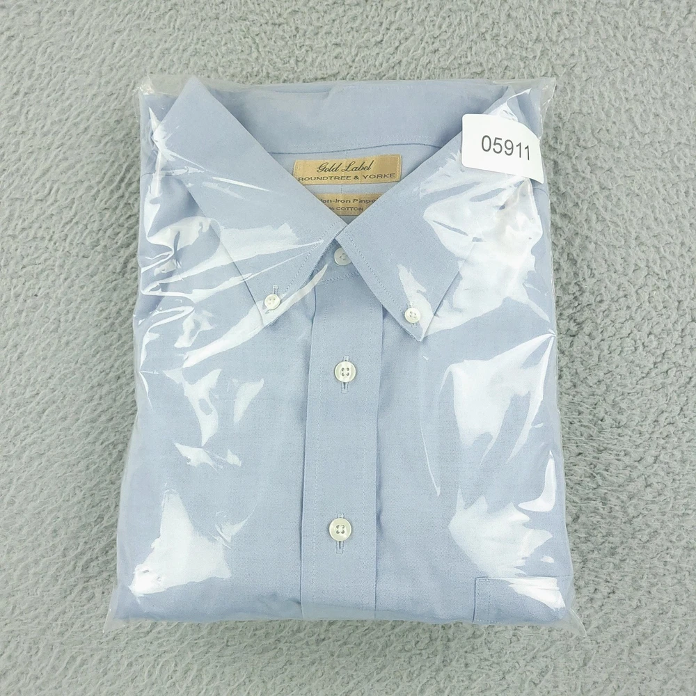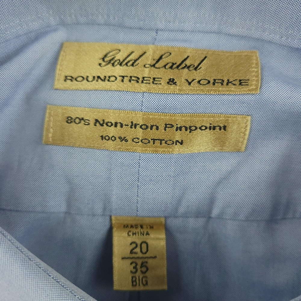 Roundtree & Yorke Gold Label Shirt Mens 2XL Blue Button Down Non-Iron Cotton Big Condition: Gently worn 80s Non-Iron Pinpoint 100% Cotton Color: Light blue Button-down collar, single chest pocket, and button cuffs Features Gold Label and 80s Non-Iron Pinpoint 100% Cotton stitched brand and style tags Tag size: 20 35 Big (fits like Mens 2XL) Made in China Classic dress shirt style, ideal for business or formal occasions Washed and dried with Fragrance Free Detergent & Dryer Sheets. Measurements are included in the photos, compare measurements with your item to ensure proper fit. (Measurements are done with the item lying flat). I ship next business day and all items include tracking. Items are added daily to my store Visit My Store Buy More & Save! Combined shipping for US customers - $1.99 for each additional item (Add items to shopping cart and discounts will automatically calculate during checkout)