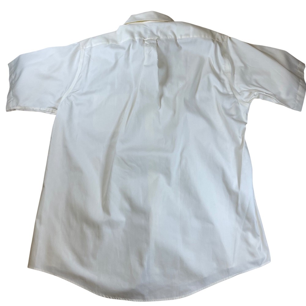 A classic short-sleeve button-down shirt, perfect for a variety of occasions. This shirt features a comfortable fit, a traditional button-down collar, and a clean front placket. The single chest pocket adds a touch of functionality without sacrificing style. Wrinkle-resistant properties make it easy to care for and keep looking sharp. This versatile shirt can be dressed up with slacks for a business casual look or paired with chinos for a more relaxed weekend style. Ideal for office wear, summer events, or casual outings. Measurements: • Pit to pit: 25 inches • Length: 32 inches Color: Ivory Department: Men Type: Dress Shirt Neck Size: 17.5 in Fit: Regular Sleeve Length: Short Sleeve Pattern: Solid Material: Cotton Blend, Pima Cotton, Polyester Blend, Polycotton, Cotton Collar Style: Button-Down Character: Classic, Preppy, Office, Business Casual Top Cuff Style: Barrel Cuff Keywords: Mens dress shirt, Short sleeve shirt, Button down shirt, Roundtree & Yorke, Ivory shirt, Cream shirt, 17 1/2, Wrinkle resistant, Office attire, Casual shirt, Pima cotton blend, Pinpoint, Dillards The Designer Clothing Exchange "Great Brands, Better Prices" - FAST SHIPPING DAILY - 5 STAR SELLER - NEW ITEMS DAILY