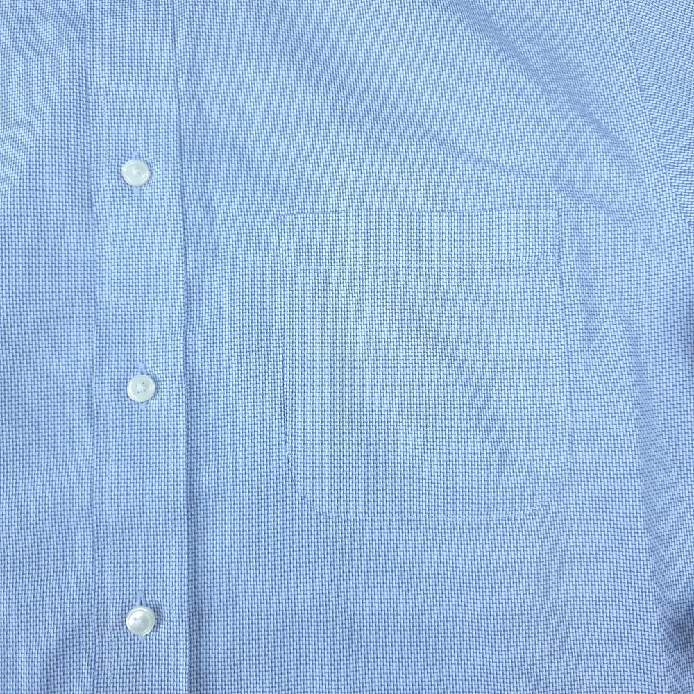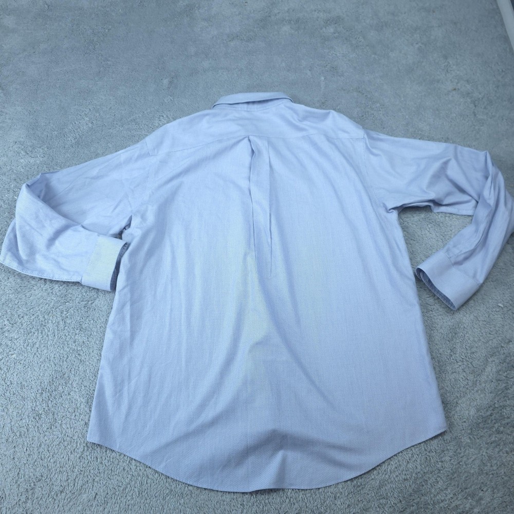 Brand: Roundtree & Yorke Style: Men's long sleeve non-iron button-down dress shirt from the Gold Label collection. Color: Light blue micro check pattern. Tag size: L (men's Large classic fit). Material: 100% cotton per inner neck size tag. Features: Button-down collar, full front button closure, single chest pocket, long sleeves with two-button adjustable barrel cuffs, back box pleat for ease of movement, and a curved shirttail hem designed to stay tucked. Branding: Gold Label Roundtree & Yorke woven neck label plus additional inner collar tag reading "Non-Iron Perfect Performance." Country of origin: Made in China. Use: Versatile business or casual shirt suitable for office wear, business casual outfits, or everyday smart styling.