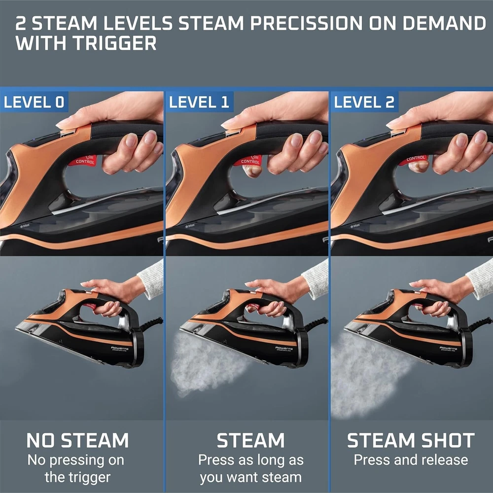 Rowenta, Iron, Steam Force Pro Stainless Steel Soleplate Steam Iron for Clothes, 400 Microsteam Holes, Professional Results, 1850 Watts, Auto-off, Ironing, Copper Clothes Iron DW9540 About this item π₯πππ‘π©ππ‘π§ππ‘π πππ’π§π ππ₯π’π‘ππ‘π ππ«ππππππ‘ππ: Experience profound steam penetration powered by our unique pump technology and an 1850-watt power, for a perfectly wrinkle-free look. π¦π§πππ π’π‘ πππ ππ‘π: This iron is equipped with our innovative steam trigger for custom control over when and where you apply steam for a tailor-made experience. π¦π ππ₯π§ π¦ππ₯πππ‘ ππ’π₯ π¨ππ§ππ ππ§π ππππ₯ππ πππ₯π: Enjoy consistent, controlled heat and precise electronic temperature and steam adjustment for all your clothes. This steam iron, with five adjustable settings, ensures the finest treatment for every type of fabric. ππππ©ππ§π π¬π’π¨π₯ ππ₯π’π‘ππ‘π πͺππ§π π§πππ¦ π₯π’πͺππ‘π§π πππ’π§πππ¦ ππ₯π’π‘: Our uniquely weighted design and gentle pressing action deliver exceptional results. Engineered for superior horizontal ironing, with no vertical steam function. ππππ-ππ₯ππ ππ₯π’π‘ππ‘π: No more leaks, unwanted color transfers, and residue with our advanced iron thanks to electronic steam regulation and precise settings. Shipping We offer FREE shipping on all orders! We ship within Three business days of payment, usually sooner. We use a selection of shipping services such as UPS, FedEx, USPS etc. We only ship to the lower 48 states, no APO/FPO addresses or PO Boxes allowed. Local pickups and combined shipping options are not provided at this time. Return You can return a product for up to 30 days from the date you purchased it. Any product you return must be in the same condition you received it and in the original packaging. Please keep the receipt. Payment We accept payment by any of the following methods: PayPal Please pay as soon as possible after winning an auction, as that will allow us to post your item to you sooner! Feedback Customer satisfaction is very important to us. If you have any problem with your order, please contact us and we will do our best to make you satisfied. Contact Us If you have any queries, please contact us via ebay. We usually respond within 24 hours on weekdays. Please visit our eBay store to check out other items for sale! Thank you for shopping at our store. Disclaimer We are working with different suppliers in USA to deliver the item to your doorstep. If you have any issues regarding the item, Feel free to ask.