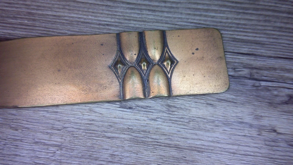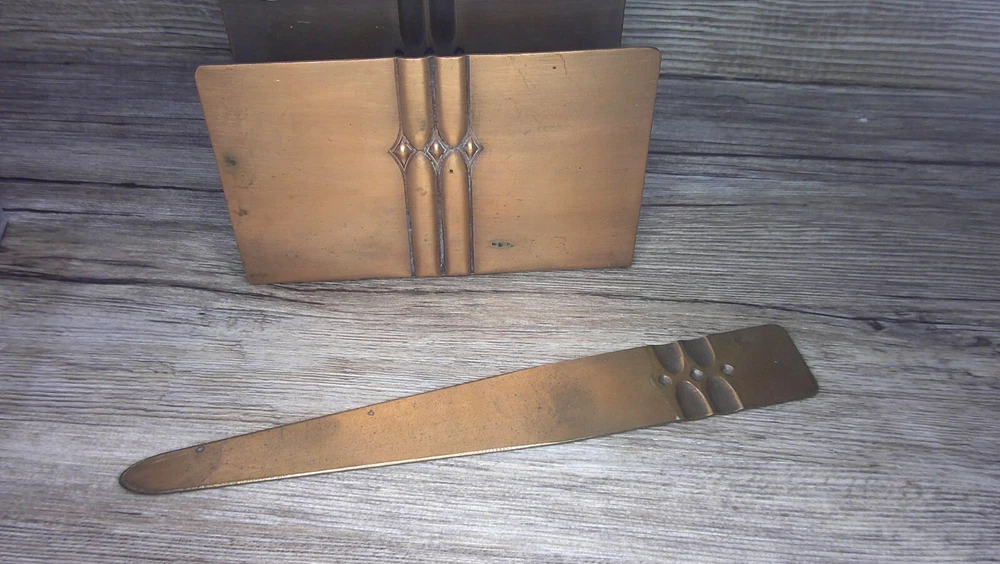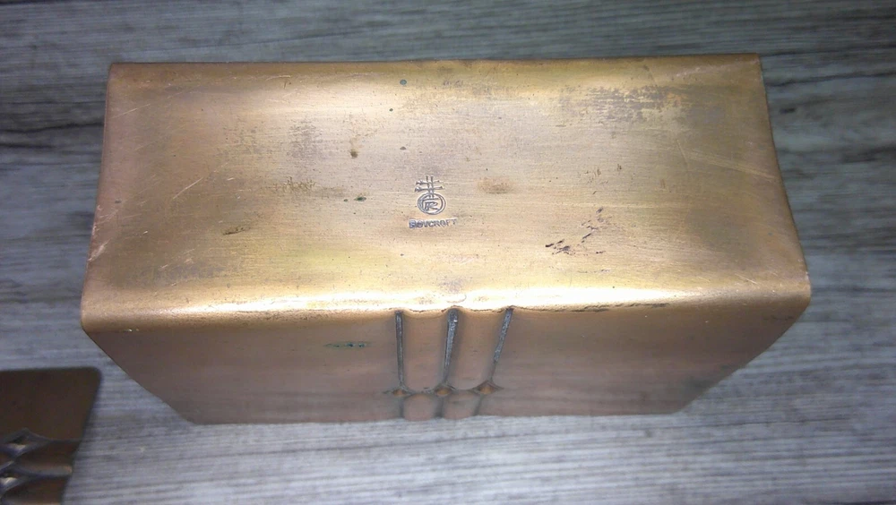 This beautifully designed letter holder and letter opener set by Roy Croft showcases stunning art deco features. Crafted from high-quality cooper metal, this vintage piece is not only elegant but also durable. Made in the United States, this handmade set is perfect for collectors of desktop items and pens & writing instruments. Ideal for use at home or in the office, this letter holder and letter opener set is a unique addition to any collection. Whether you are a fan of vintage items or appreciate the art deco style, this piece is sure to impress. Don't miss out on the chance to own a piece of history with this Roy Croft cooper metal set. See photos the letter holder is 3 1/4" high and 4 7/8" wide and the letter opener is 7 3/4" long and 1 1/4" wide at the handle