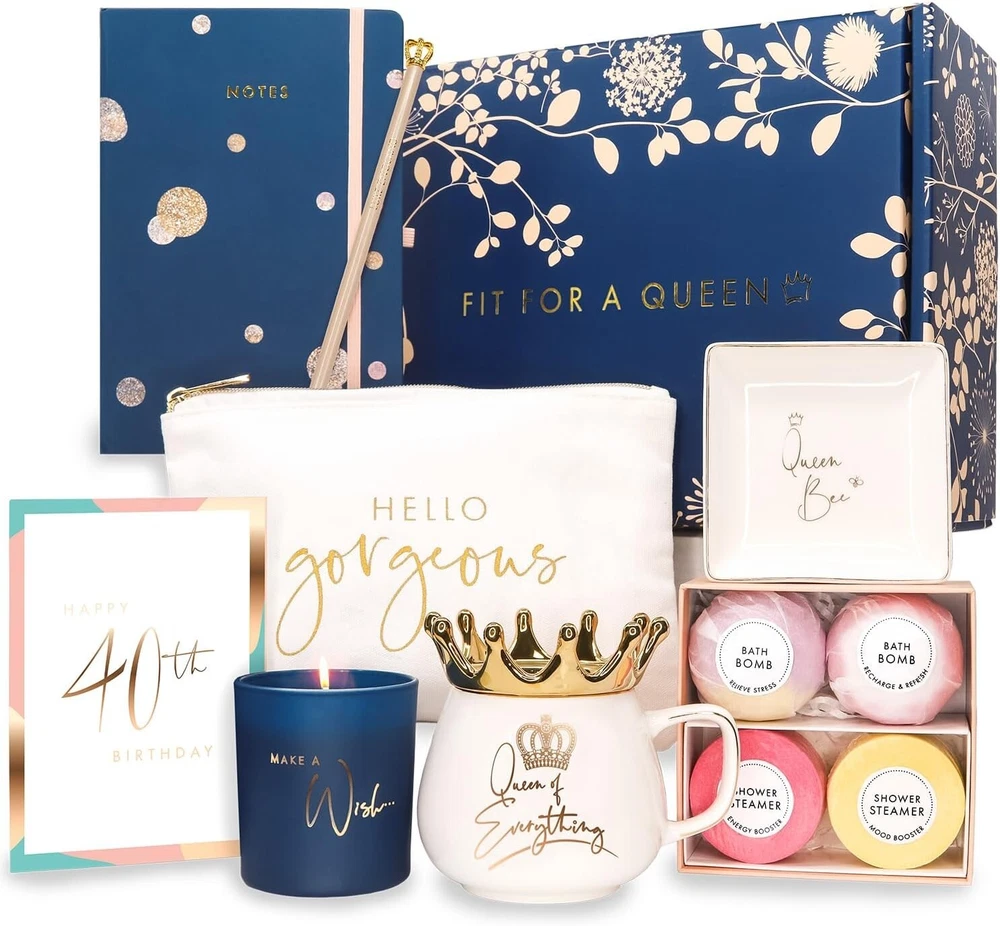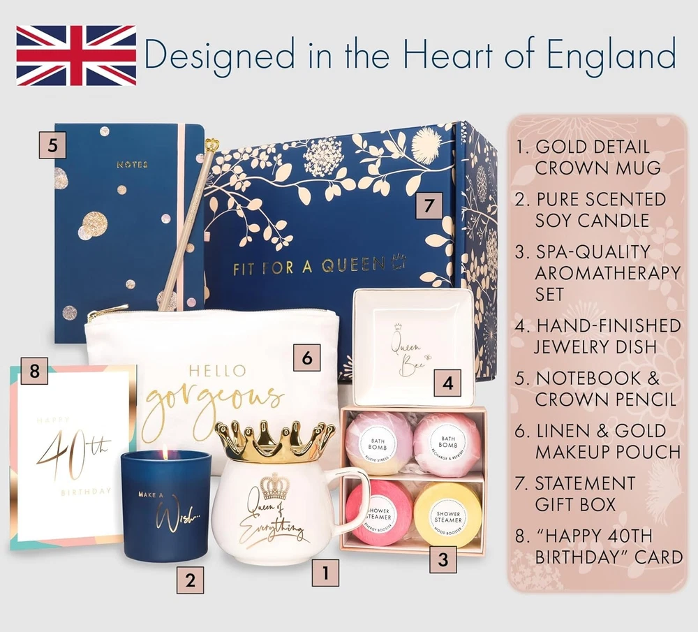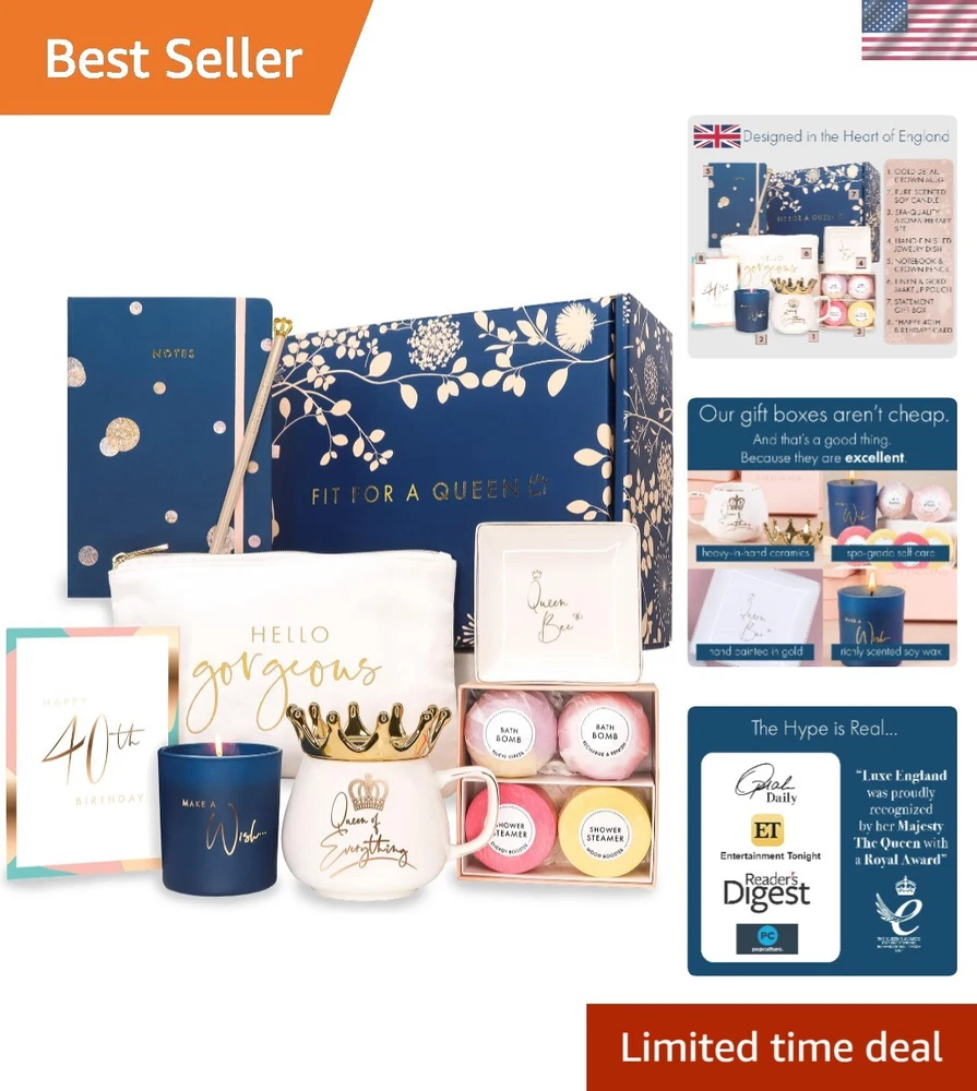 Royal 40th Birthday Gift Basket for Women - Luxury 40th Birthday Gifts for Women Designed in Britain โ High-end Unique for Women Friend, Wife, Mom, Sister ๐ LOOKING FOR THE TOP RATED 40th BIRTHDAY GIFT PROVEN TO IMPRESS? Gorgeous novelty gifts from an award winning BRITISH product! ๐ Your gift box contains a 12oz coffee mug with crown lid, vanilla & lavender candle, lemon & rose bath bomb and shower steamer set, notebook with crown pencil, jewelry dish, makeup pouch and greeting card. ๐ WOW HER WITH AN UNFORGETTABLE UNBOXING! Bursting with scent, fancy gift boxes and no crinkly plastic! If this isnโt the BEST GIFT BOX sheโs ever received, itโs on us! ๐ The luxurious choice to surprise any queen in your life on her 40th birthday! ๐ Recommended by thousands of customers as best 40th birthday gifts for wife, friend, mom, sister, co-daughter, grandmother, aunt, boss, girlfriend or someone who has everything.