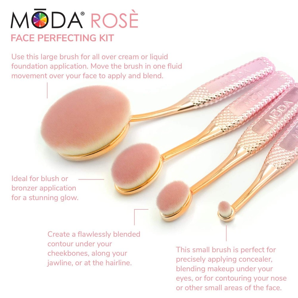 Royal Brush Moda Rose Cosmetic 4 Piece Face Make Up Perfecting Kit Brush Set, 0.13 Count Product Details Color: Rose Brand: MODA MPN: MSET-FPK3 UPC: 090672373304 EAN: 0090672373304 Bristle Material: Nylon or Polyester Brand: MODA Recommended Uses For Product: Face Makeup Color: Rose Material: Acrylic Skin Type: All Item Form: Oval Brush Number of Pieces: 1 Age Range (Description): Adult Ferrule Material: Acrylic Product Dimensions ‏ : ‎ 8.87 x 2 x 0.75 inches; 5.29 ounces Item model number ‏ : ‎ MSET-FPK3 UPC ‏ : ‎ Manufacturer ‏ : ‎ Royal Brush MFG Use the large brush for all over cream or liquid foundation application. Blush or bronzer application brush for a stunning glow. Create a flawlessly blended contour under your cheekbones, along your jawline, or at the hairline. Small brush is perfect for precisely applying concealer, blending makeup under your eyes, or for contouring your nose or other small areas of the face.