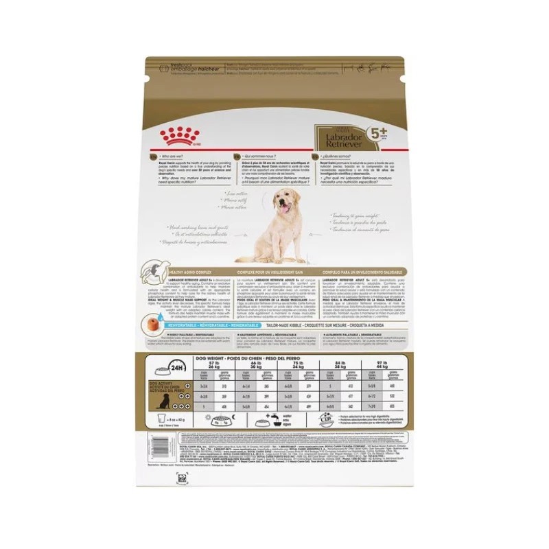 Complete and balanced nutrition designed to meet the specific diet needs of maturing Labrador Retrievers 5 years and older. Supports healthy aging with exclusive combination of antioxidants to maintain cellular health; formulated with appropriate phosphorus content to support a mature and senior dog’s kidney health. Helps your Labrador Retriever maintain an ideal weight by providing an adapted calorie content and helps maintain muscle mass with a tailored protein content and L-carnitine. Provides advanced nutrients, including collagen, EPA, and DHA, to support cartilage, which helps maintain bone and joint health in your large breed dog during the aging process. Specifically designed kibble size, shape, and texture are adapted to the Labrador Retriever; kibble can be softened with warm water, which allows for easier eating..