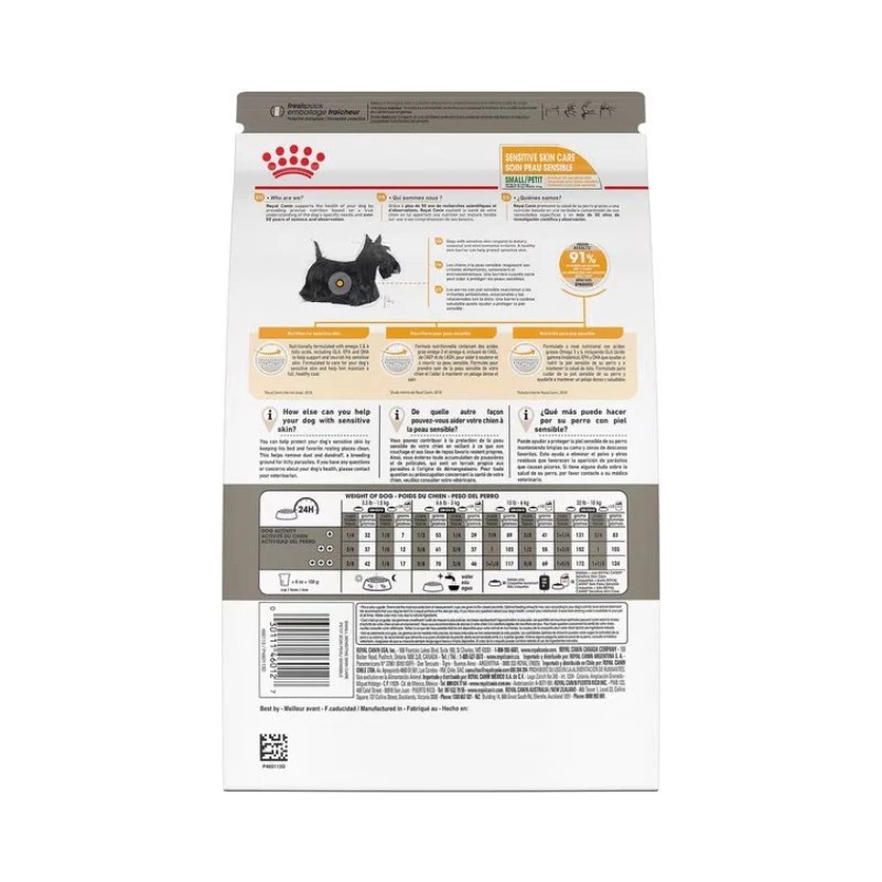 Dry dog food is formulated for small dogs 10 months and older weighing up to 22 lb with sensitive skin and dry coats. Nourishes dry skin with omega-3 and -6 fatty acids and promotes a healthy coat. Formulated to care for dogs' sensitive skin and help maintain a healthy, shiny coat. Skin care formula with tailored nutrition helps nourish your dog’s dry skin. Pairs perfectly with Royal Canin Sensitive Skin Care Wet Dog Food in can or pouch..