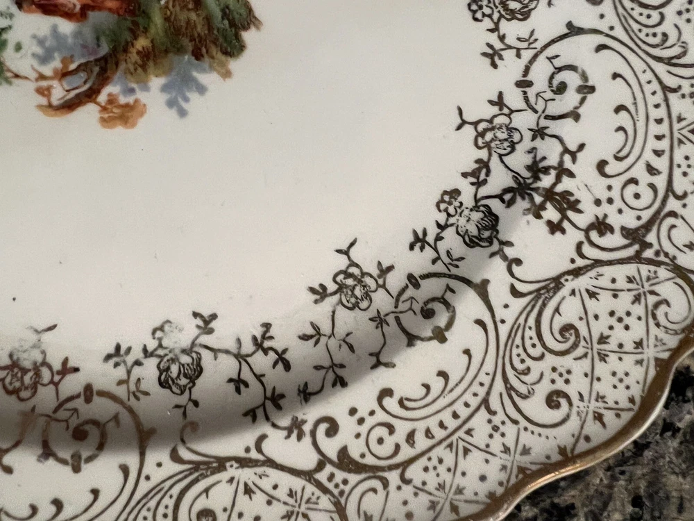 Vintage Royal China Warranted 22kt Gold Square Snack Cheese Salad Dessert Plate Square Scalloped Edges. Scene in the middle. Gold lace ornament and pretty pattern around the rim Some crazing. See pics. The mark on the back clearly reads "Royal China," which was the name of a prolific company located in Sebring, Ohio. Royal was founded in 1934 during the aftermath of the Great Depression.