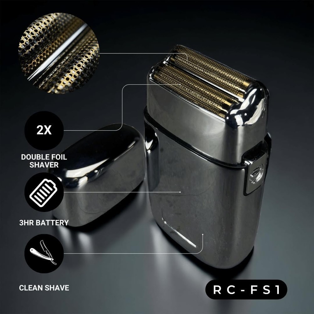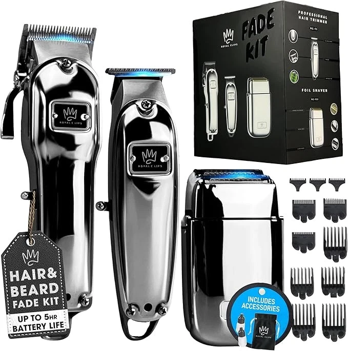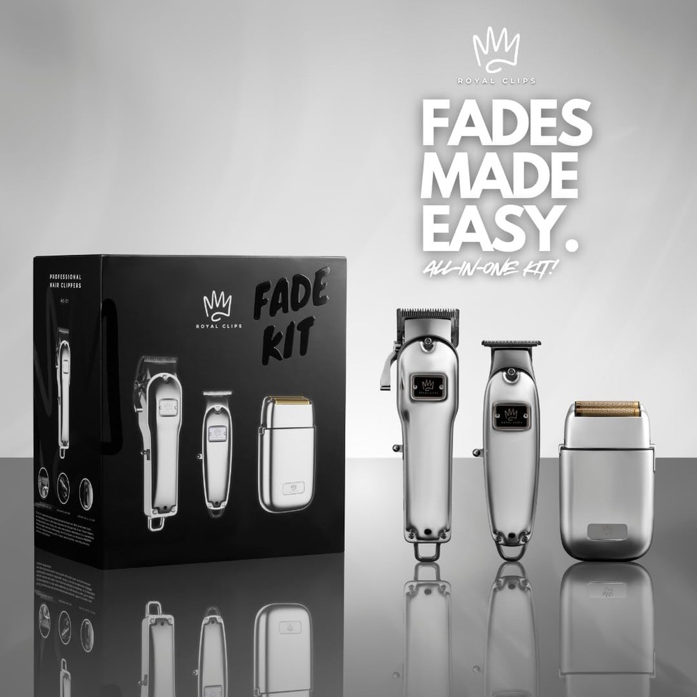 Royal Clips Hair and Beard Fade Kit – Professional Clipper, Trimmer & Foil Shaver Bundle for Men, Complete Haircut Set for Barbers, Home Use & Grooming – 5-Hour Battery, 10pcs Limit Combs, Silver Item Description About this item PROFESSIONAL FADE KIT: Our Hair and Beard Fade Kit is the ultimate set for at-home fades, trims, and shaves that look professional. Includes clipper, trimmer, and foil shaver for versatile styling and grooming. Ideal for home use or for barbers! HIGH-PERFORMANCE COMBO: With its ultra-powerful motor and precision blades, the clipper and trimmer creates seamless, smooth hair and beard trims. Adjustable settings and a 3+ hour battery life ensure you get the most out of every session. CLOSE & COMFORTABLE SHAVE: With its Double Foil design and durable all-metal body, the foil shaver offers a smoother shave. Ideal for achieving an ultra-close shave on the face and neck, giving you a consistently clean, polished appearance. COMPLETE GROOMING KIT: You can personalize your fade, trim, and style with this all-in-one package, comes with 10 limit combs in different sizes. Whether you’re a pro or a beginner, these will help you master any look—from crisp fades to precise beard lines. LONG-LASTING BATTERY: Royal Clips Fade Kit's high-capacity battery allows for 3+ hours of uninterrupted use. This helps you stay sharp without the need for frequent recharging, making it ideal for lengthy barbering sessions, home grooming, or travel. › See more product details Package Dimensions:8.94 x 8.07 x 5.31 inches; 1.54 Pounds Item model number:RC-FK1 Batteries:1 Lithium Ion batteries required. (included) Date First Available:April 21, 2023 Manufacturer:Royal Clips ASIN:B0C381K716 Best Sellers Rank:#137 in Hair Clippers Customer Reviews:4.5 4.5 out of 5 stars *Fade Kit 2.0 Precision & Power in Every Cut – Engineered for barbers and home stylists, the Fade Kit delivers sharp, clean fades with high-performance clippers and trimmers. *Fade Kit Complete Grooming Experience – From fades to finishes, this all-in-one kit includes professional-grade tools to achieve the perfect look effortlessly. *Fade Pack Perfect for Barbers & Grooming Enthusiasts – Stay organized and stylish with this premium fade pack, designed for convenience and performance. *Beard Kit Complete Beard Care in One Kit – Achieve a well-groomed look with premium tools designed for shaping, trimming, and styling your beard. Precision & Power in Every Cut – Engineered for barbers and home stylists, the Fade Kit delivers sharp, clean fades with high-performance clippers and trimmers. Complete Grooming Experience – From fades to finishes, this all-in-one kit includes professional-grade tools to achieve the perfect look effortlessly. Perfect for Barbers & Grooming Enthusiasts – Stay organized and stylish with this premium fade pack, designed for convenience and performance. Complete Beard Care in One Kit – Achieve a well-groomed look with premium tools designed for shaping, trimming, and styling your beard. Payment We accept payment only through PAYPAL Shipping We ship products worldwide through standard express courier service, it will reach within 7 to 10 days to abroad buyers, we ship the product after recieved clear payment and give full information about shipment to the buyer Return We accept product return within 7 to 21 days from delivery date but product should be in original position and not in damaged condition,the return shipping charges will be buyer responsibility