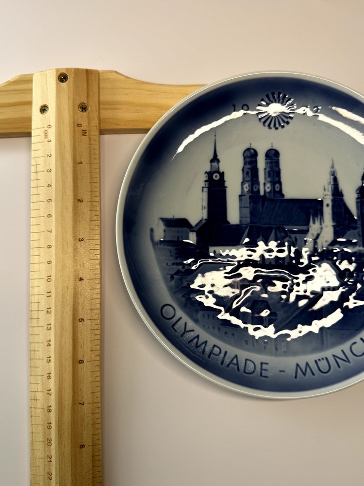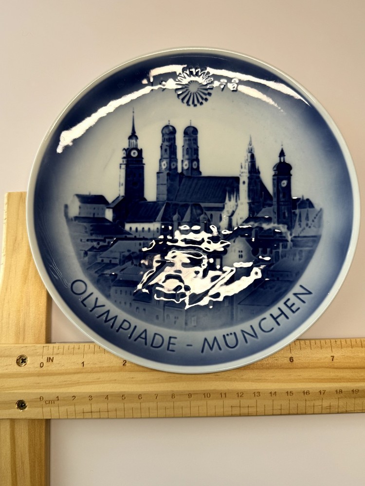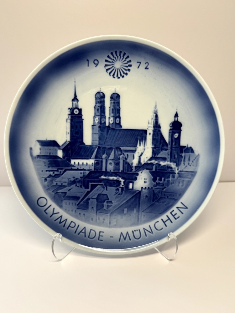 This is a vintage Royal Copenhagen collector’s plate commemorating the 1972 Summer Olympics held in Munich, Germany. The design features a beautifully rendered cityscape of Munich, including the iconic Frauenkirche cathedral, in classic blue and white porcelain. The 1972 Munich Olympics are historically significant not only for athletic achievement but also for the tragic terrorist attack that resulted in the deaths of 11 Israeli team members. This plate serves as both a commemorative piece and a reminder of a pivotal moment in Olympic history. Made in Denmark by Royal Copenhagen Diameter: Approx. 7.25 inches Marked on back with official Royal Copenhagen hallmark Excellent condition – no chips or cracks A poignant piece of Olympic and world history