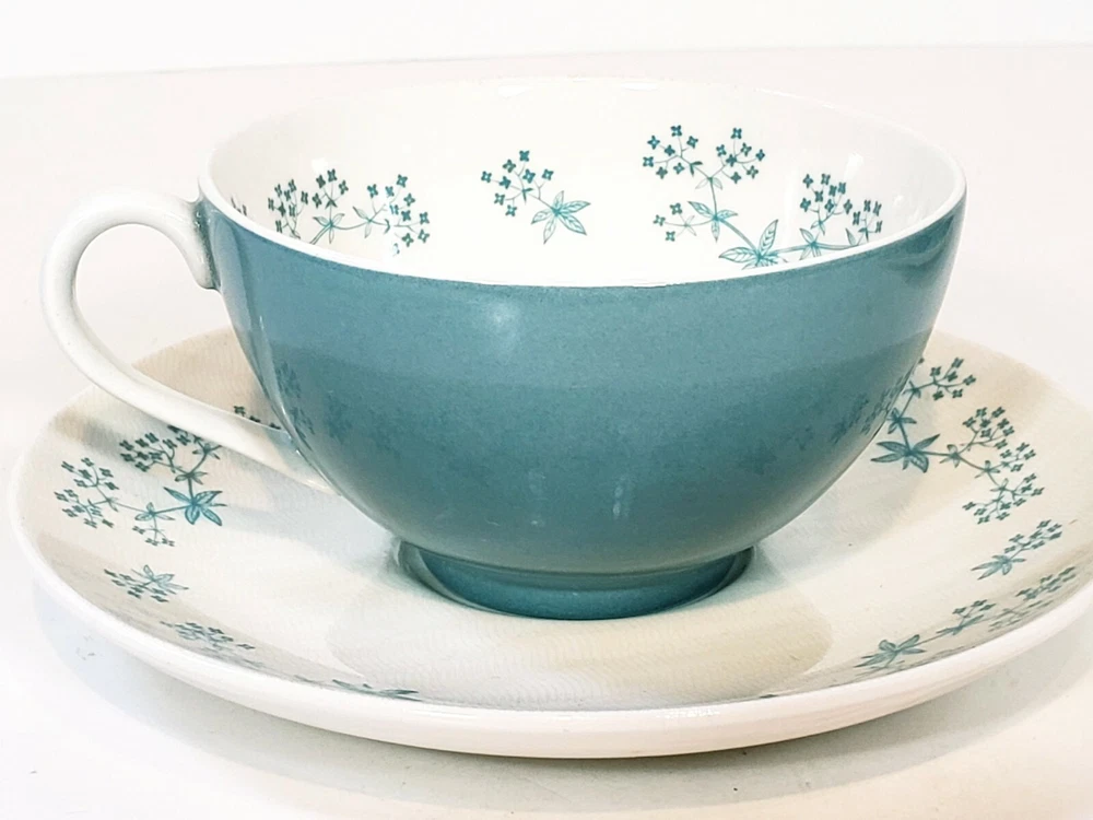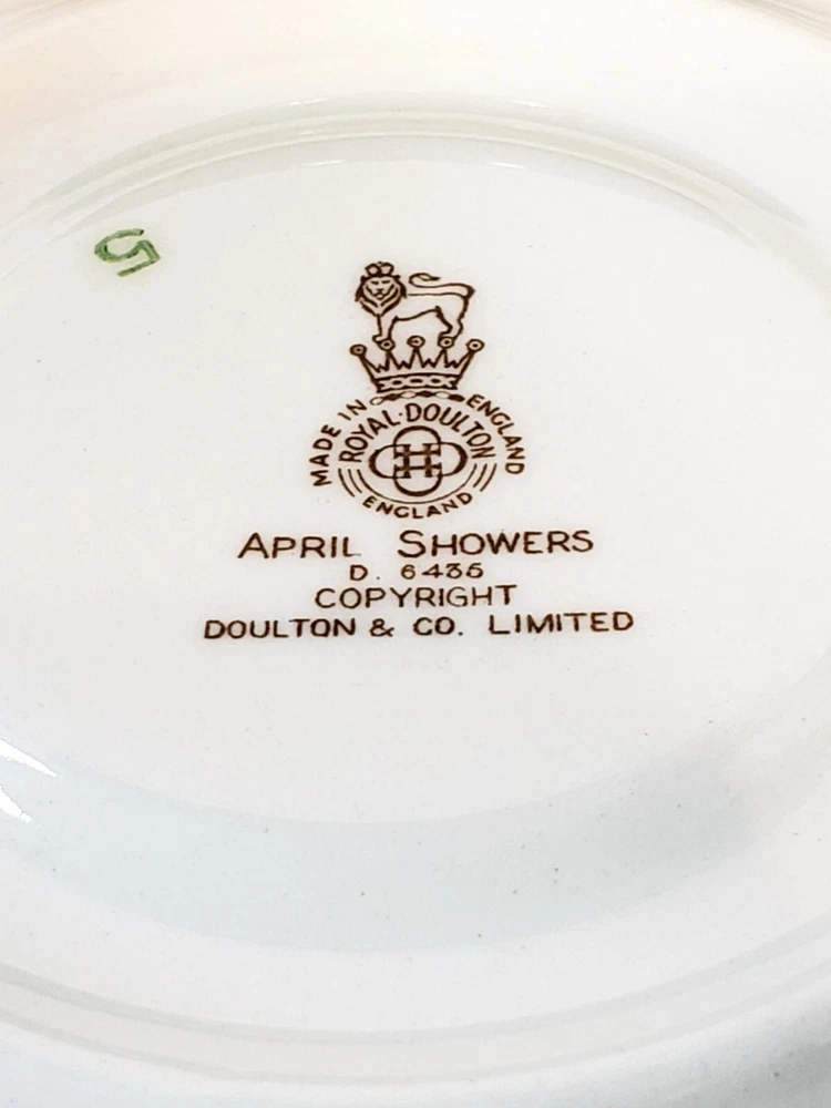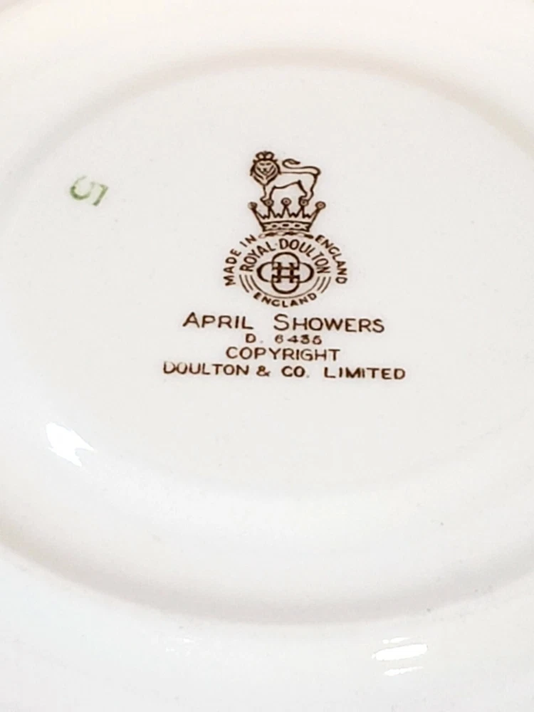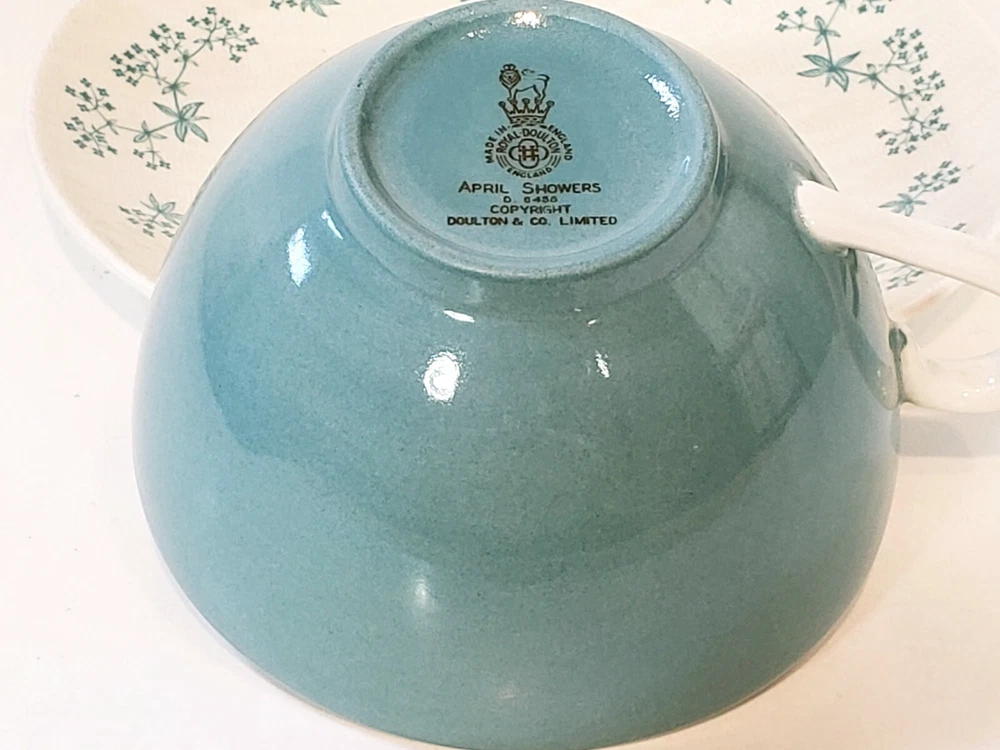 Royal Doulton April Showers Set Of 2 Tea Cups & Saucers D6435. 4 pcs 2 sets beautiful light blue color made in England . Saucers have a pattern the looks like crazing measures 6" across no chips or cracks. Tea cups are 3 3/4" across 2 1/4" tall one has a small mark on the inside see pictures it does not go all the way through besides that they are very pretty no chips or cracks .